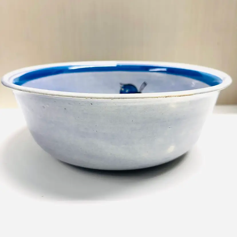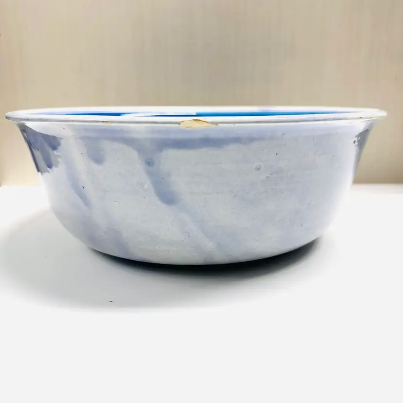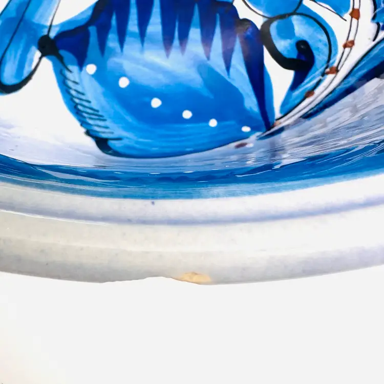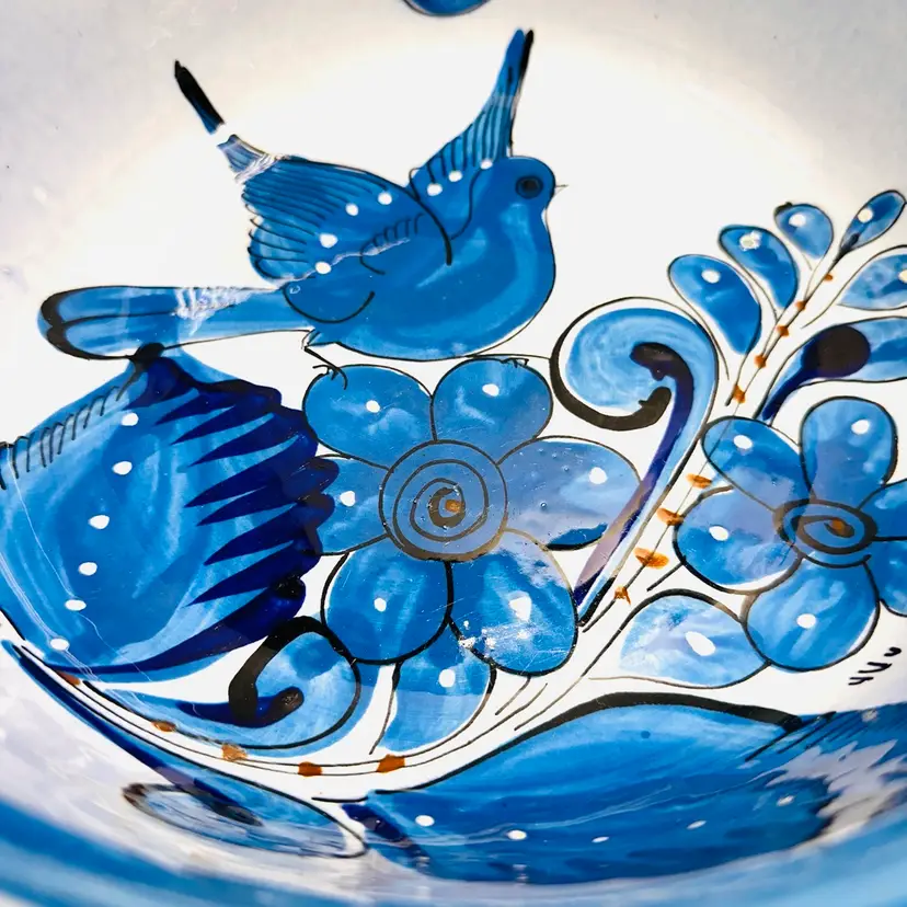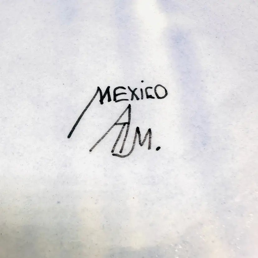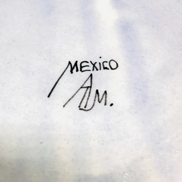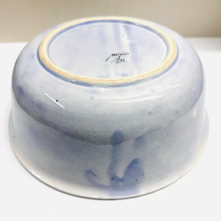 Previously owned large Mexican folk art Tonala pottery decorative bowl - signed by artist. AS IS! Please note there is a chip on rim of bowl (see pictures).