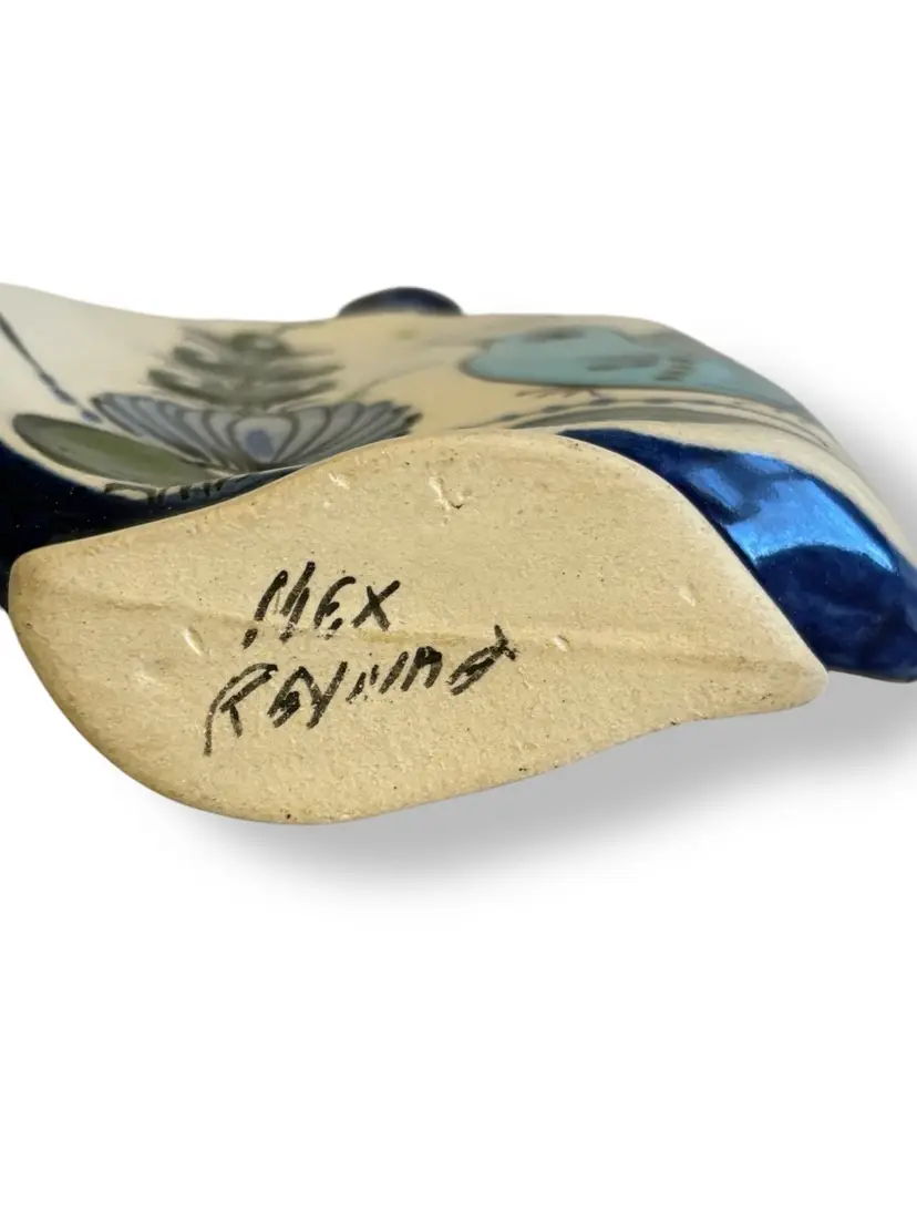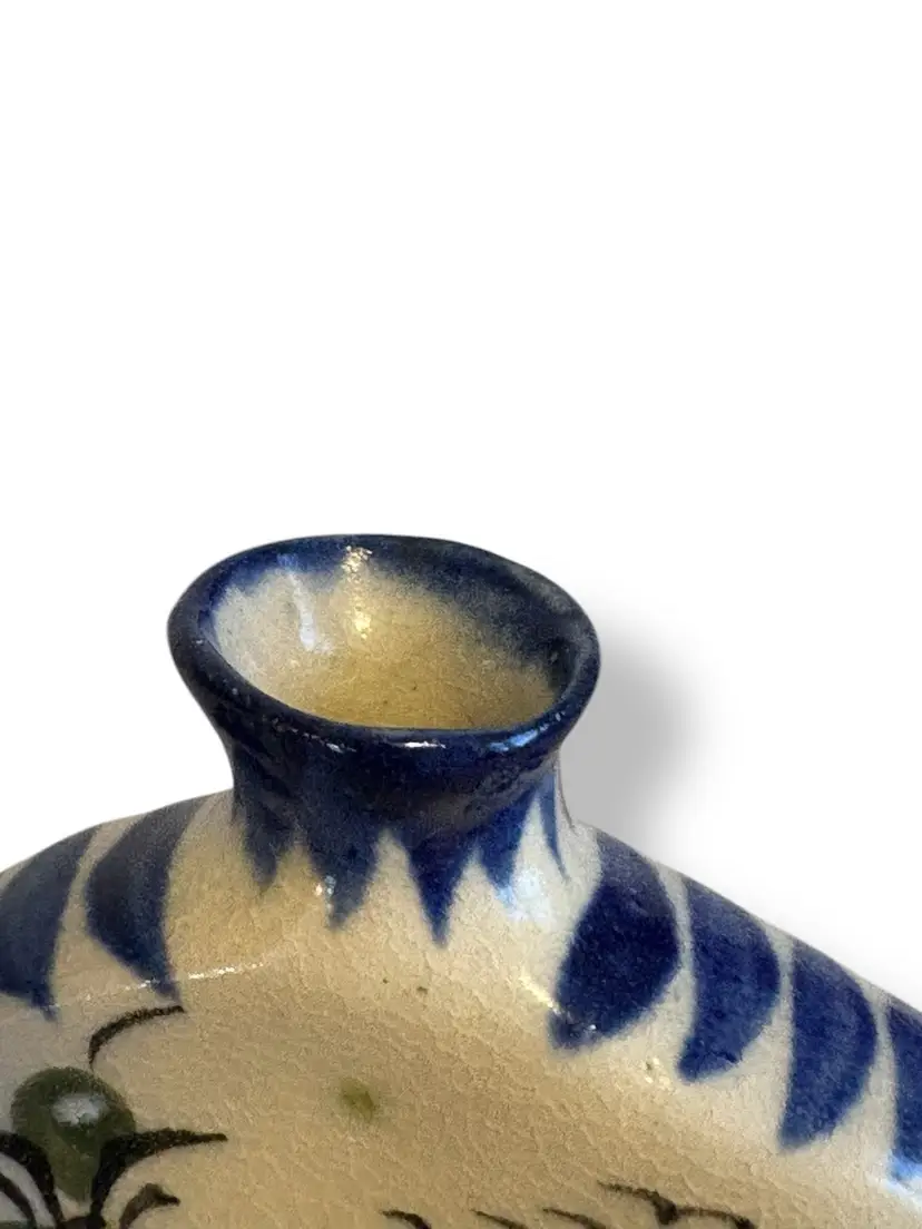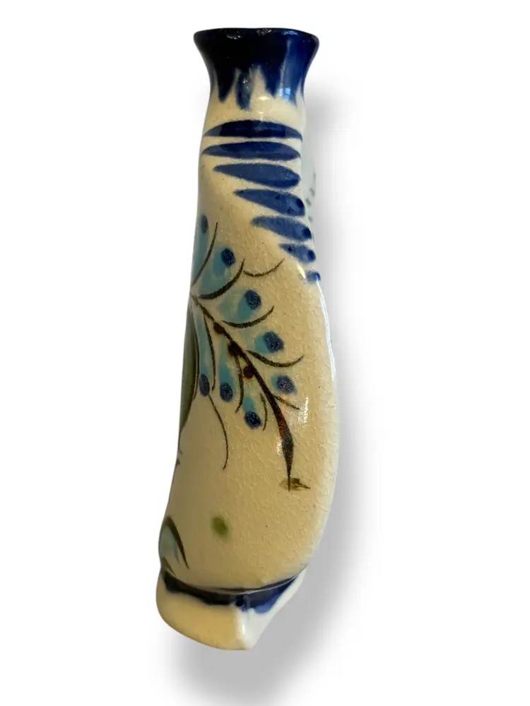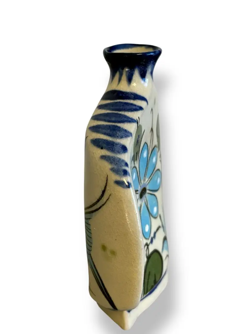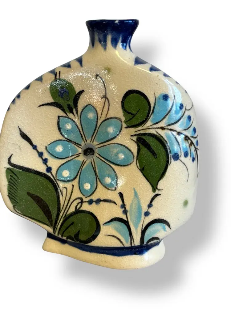 Vintage Mexican Pottery Vase Hand painted Bird & Floral Design. Signed Mex Reyna on bottom. Measures approximately 5.25”H x 4.75”W x 1.25”D. Some crazing on piece. Great overall condition.