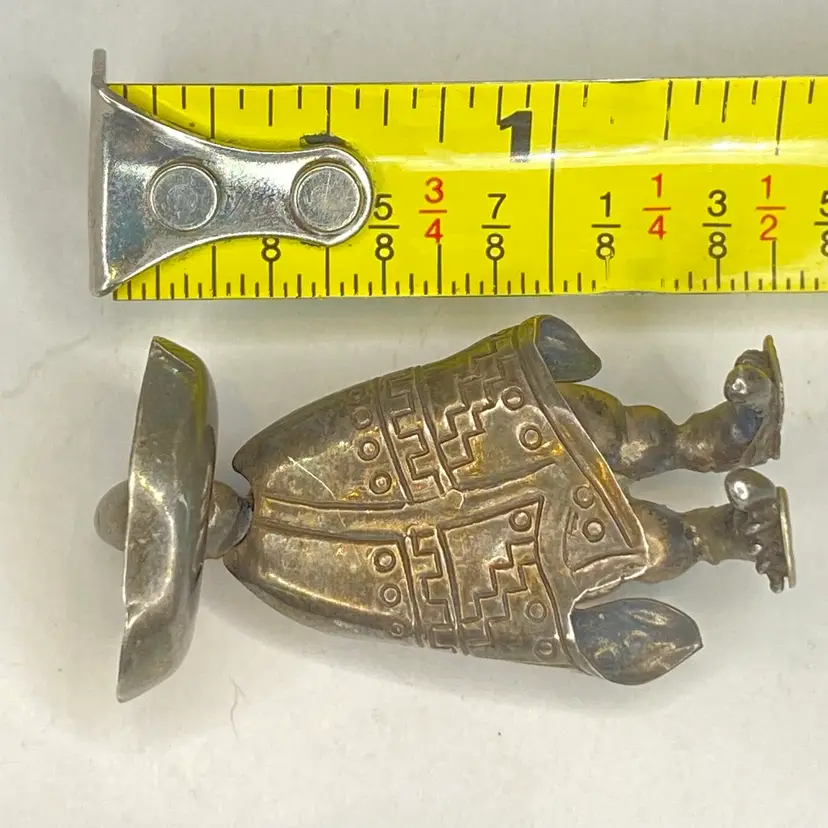 This vintage figural brooch is crafted from solid sterling silver and features a traditional Mexican man wearing a large sombrero and detailed poncho with geometric stamping. The brooch has dimensional sculpting giving it a bold and charming folk-art appearance. The back is stamped “925” with a partially legible markings inside an oval, typical of mid-century Taxco or regional silversmiths. Likely made in the 1960s–1970s, this piece is a classic example of Mexican tourist silver jewelry with strong collector appeal.