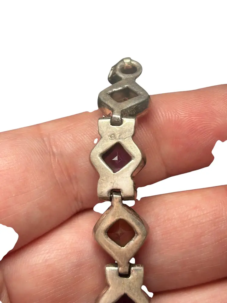 Add a bold touch of vintage charm to your collection with this stunning Mexican sterling silver bracelet! This eye-catching piece features a series of geometric, diamond-shaped links set with shimmering mystic topaz stones, known for their mesmerizing rainbow-like iridescence. Prepare to be dazzled!