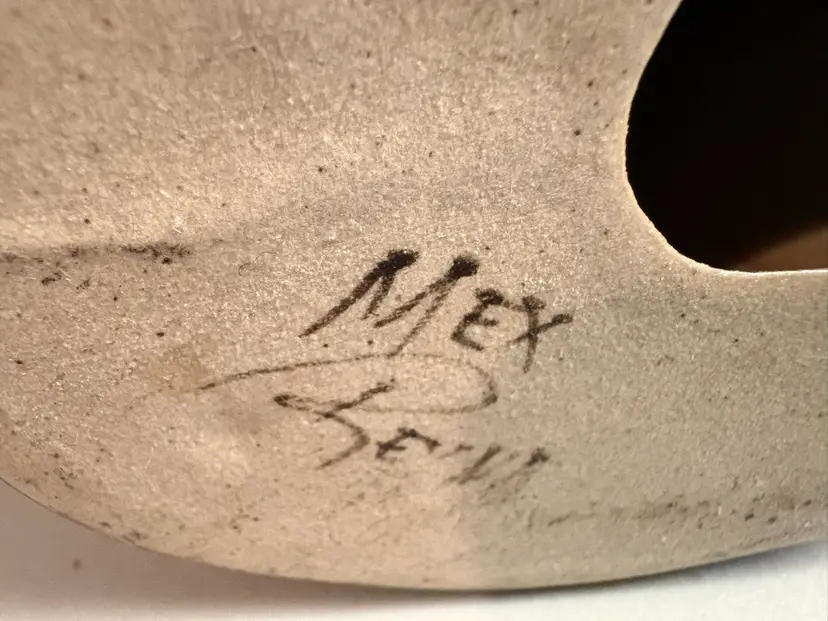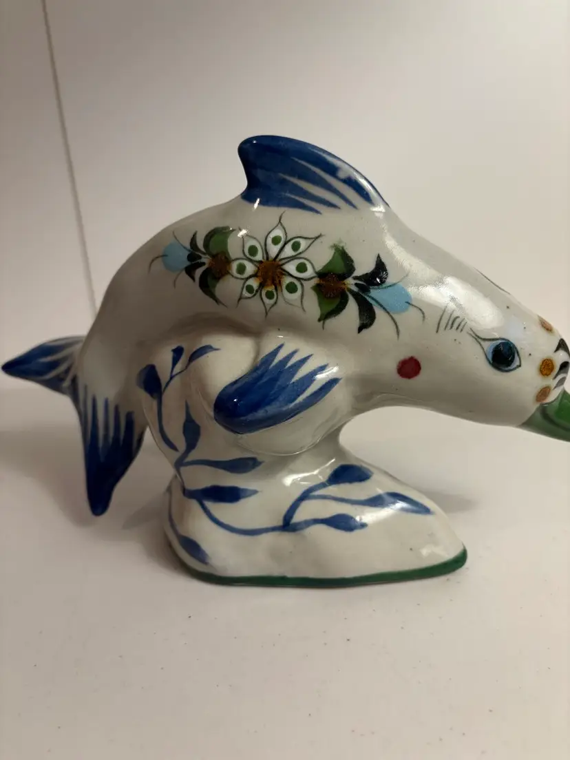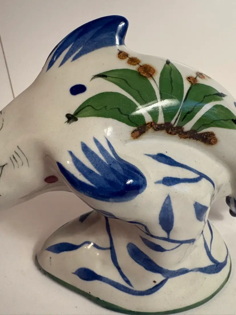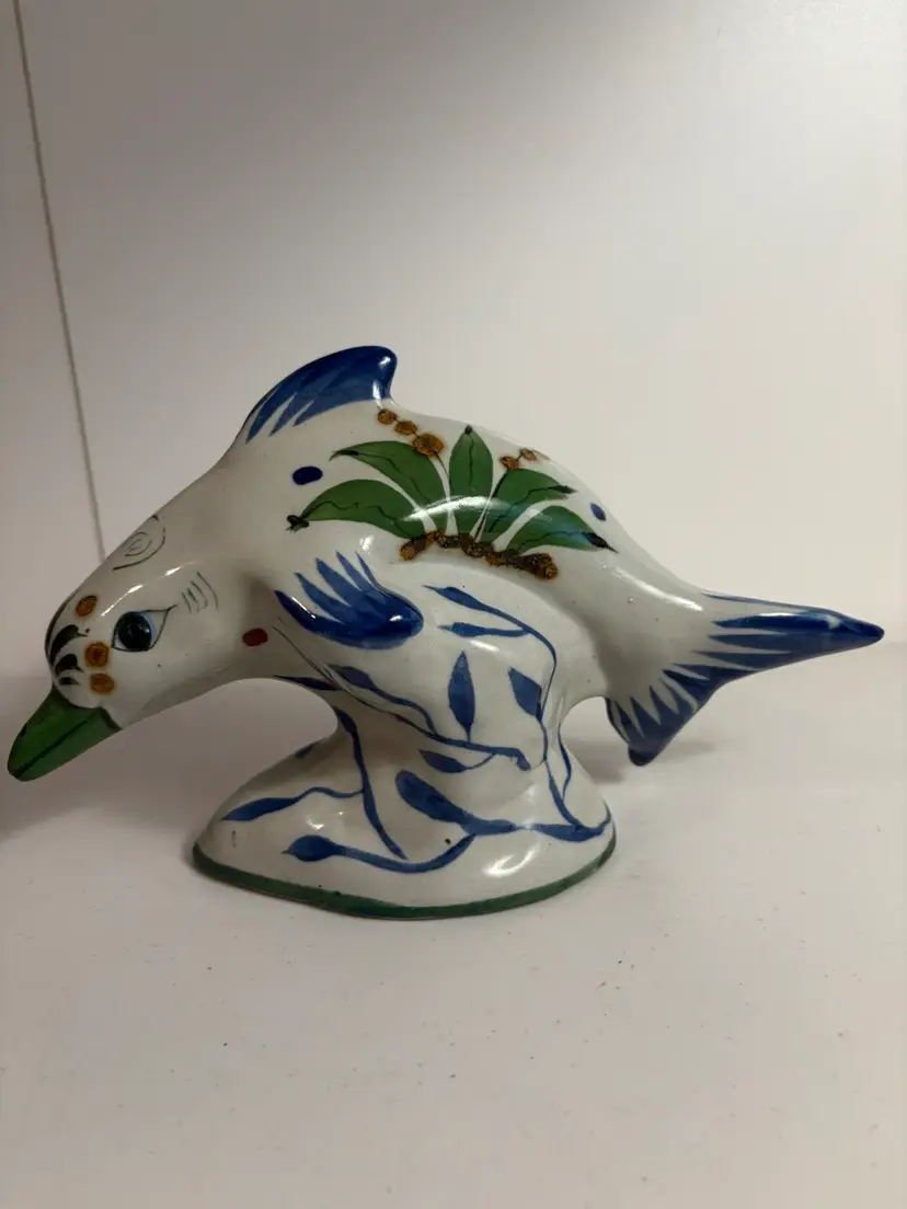 Vintage Mexican Tonala pottery figurine, likely a dolphin or whale, known for its distinctive folk-art style. The pottery originates from the city of Tonalá in Jalisco, Mexico, an area renowned for its fine clay. The figurine features a burnished (polished) surface and is hand-painted with natural pigments. Typical designs include birds and flowers, which are visible on this piece. The colors often found in classic Tonala pottery include rose, cinnamon, gray-blue, and bone white on a brown or antique white clay background
