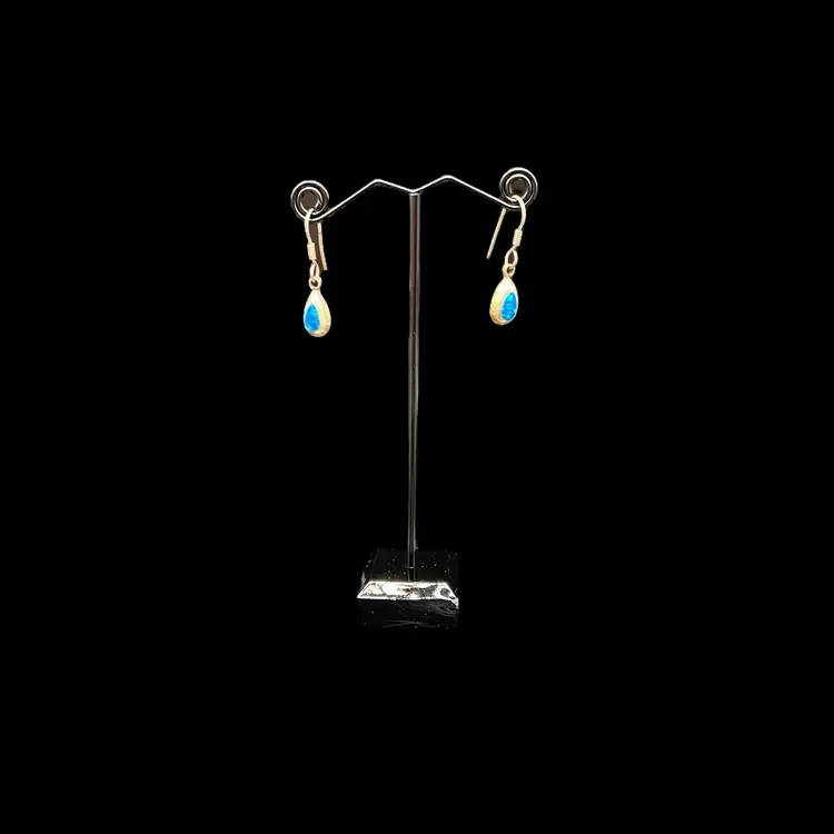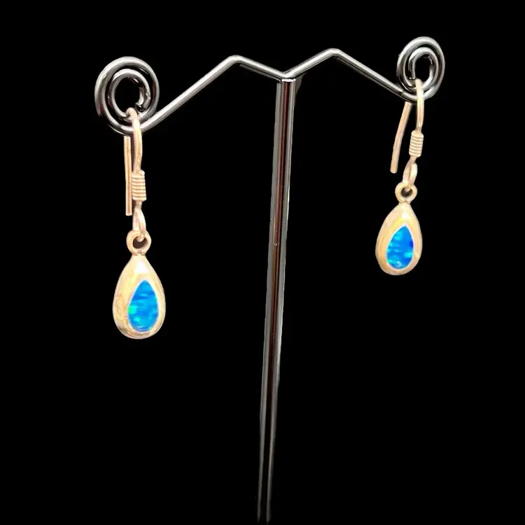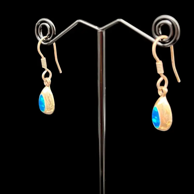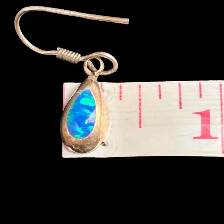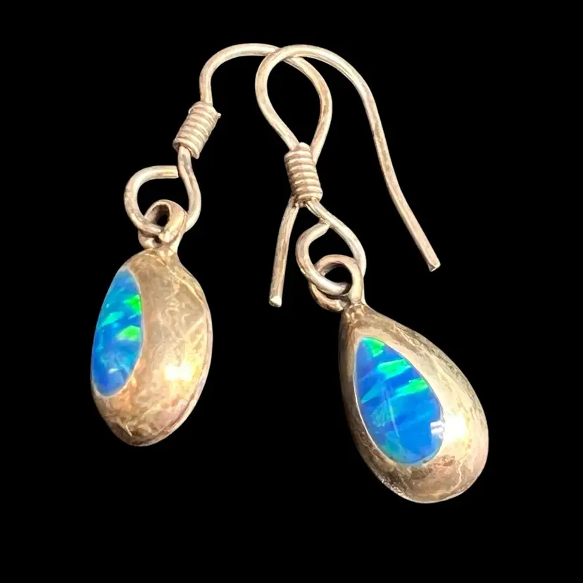 Elevate your accessory collection with these vintage Mexico 950 silver earrings, featuring mesmerizing blue opal teardrop oval stones. Their dangle/drop design coupled with the comfortable hook closure ensures a graceful sway with every movement, perfect for adding a touch of elegance to any outfit.