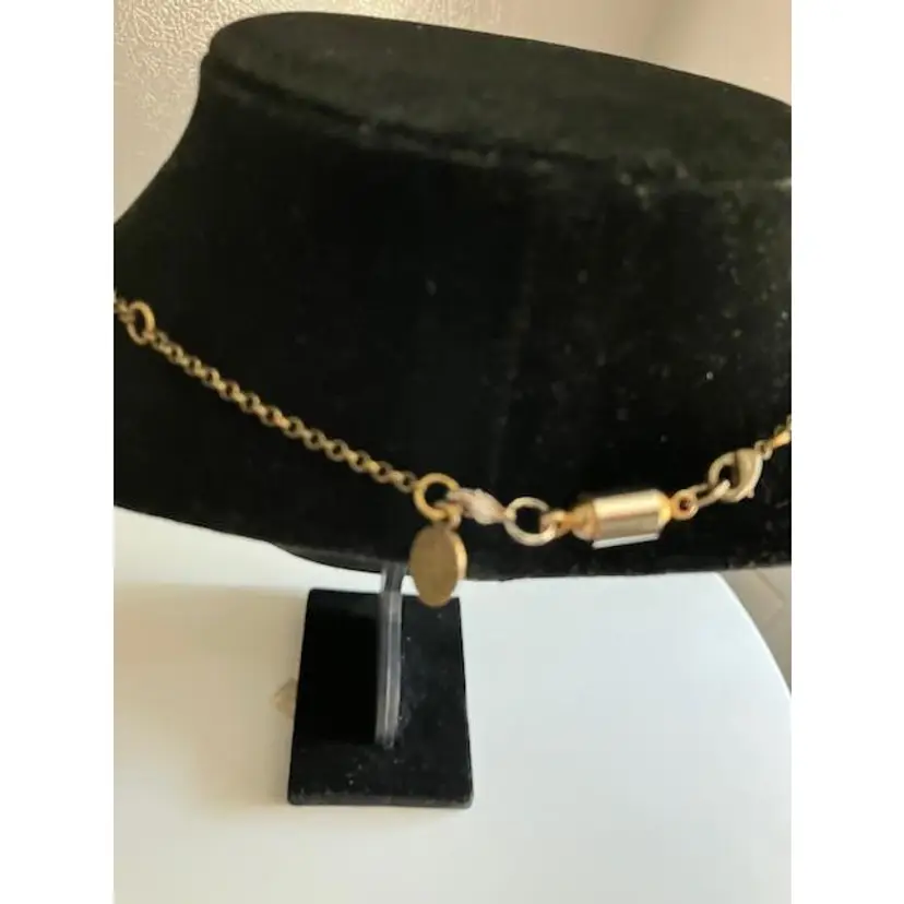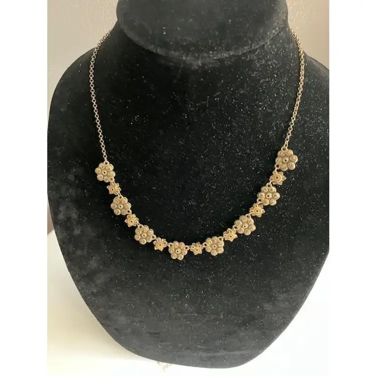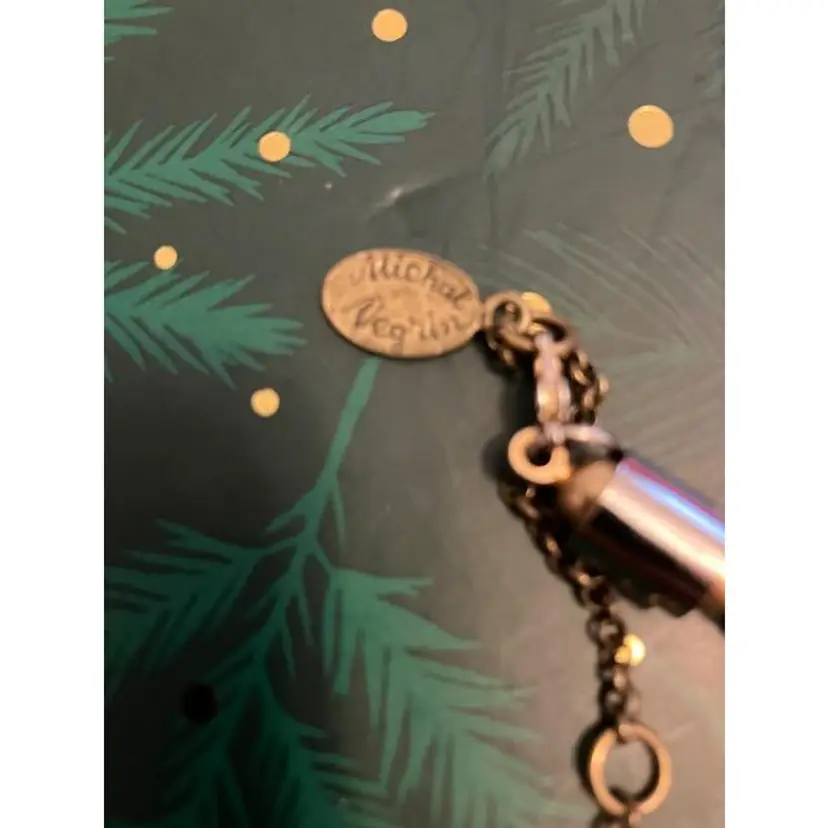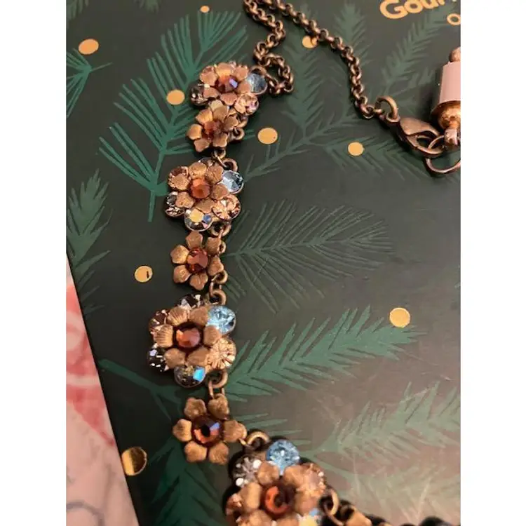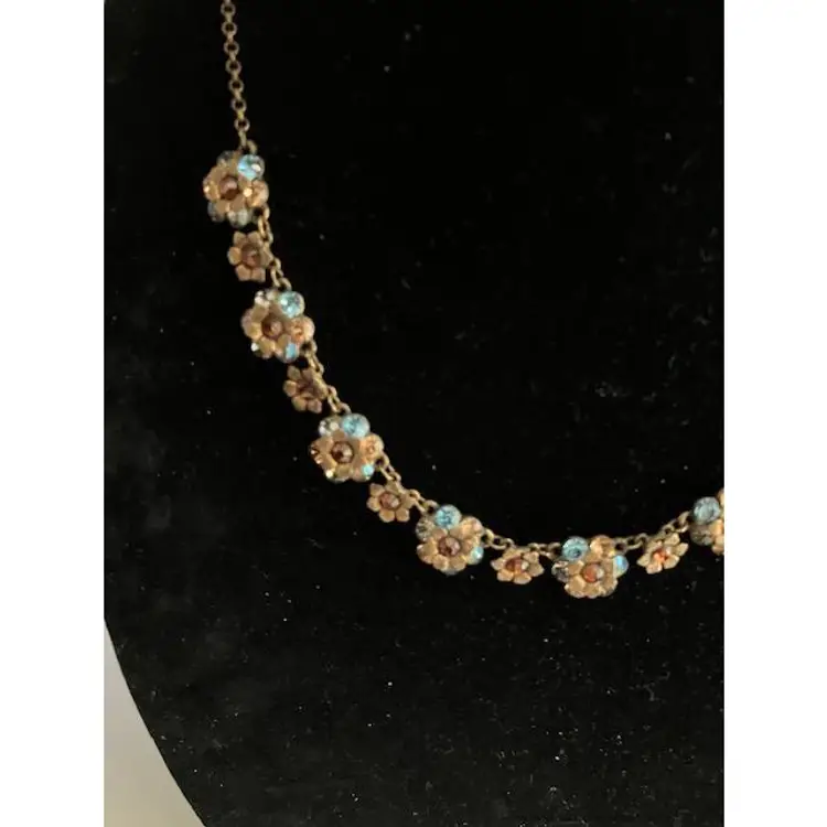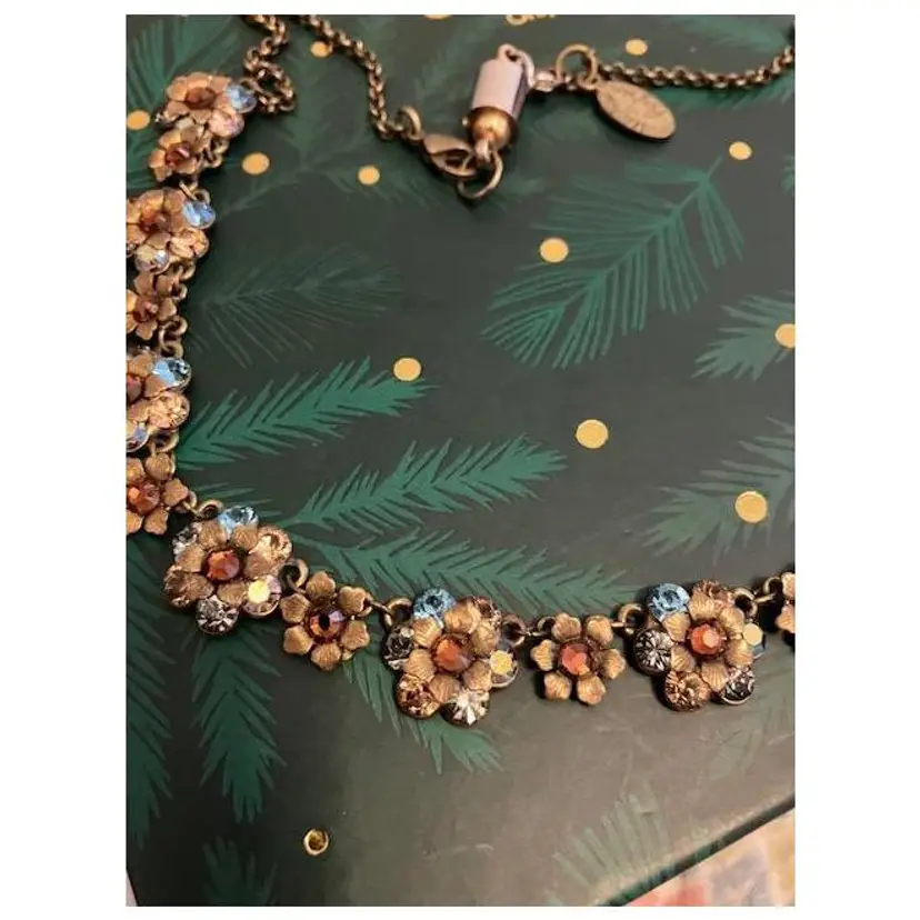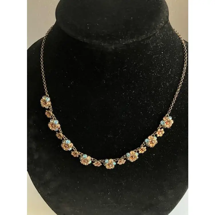 Gold tone with AB crystals. Detailed floral motif. Measures 18". Hang Length 9". A 1" extender has been added. Lobster claw clasp. Signed Michal Negrin