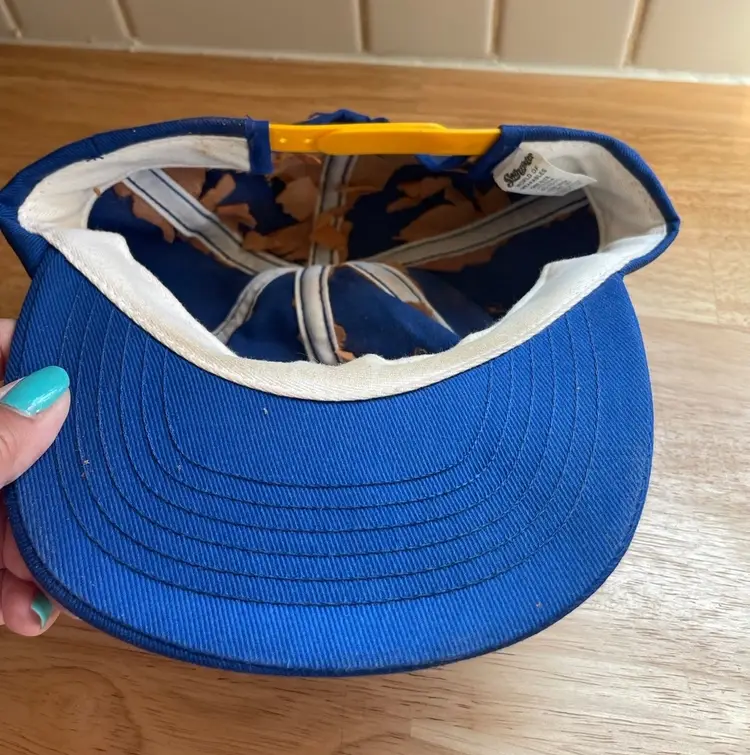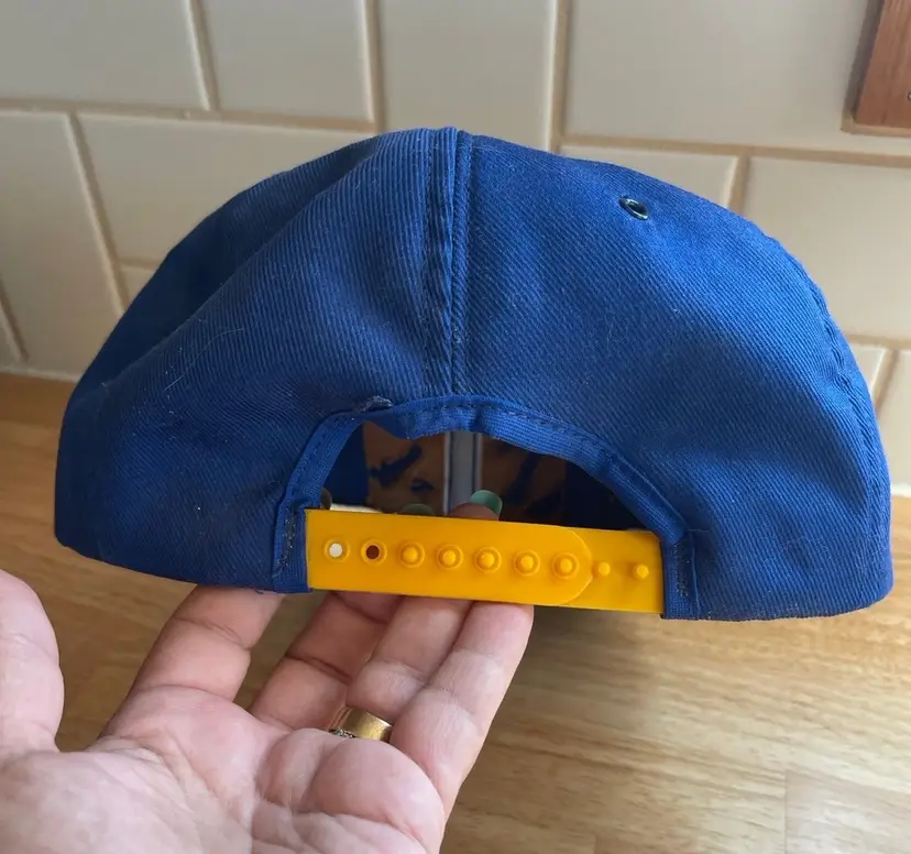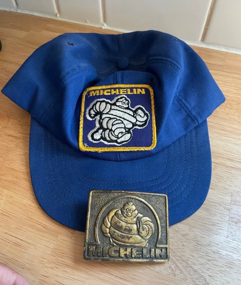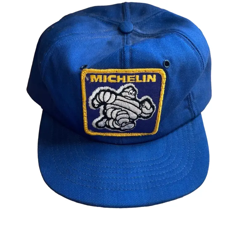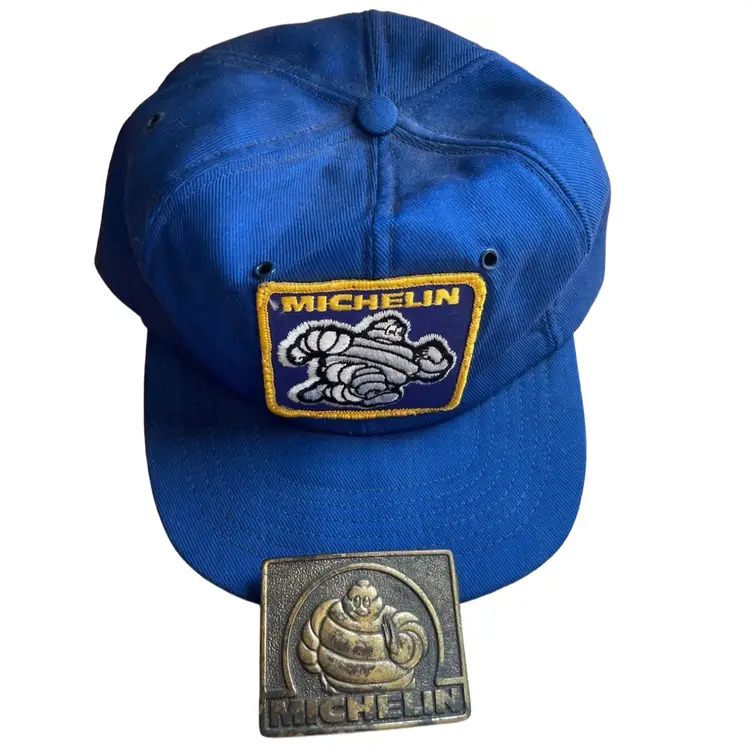 VINTAGE Michelin Man Patch Blue Snapback Cap USA Trucker Hat and brass belt buckle Most all the foam is out of the inside. Doesn’t take away from the hat. The snaps are nice and still soft and working. Great vintage condition.