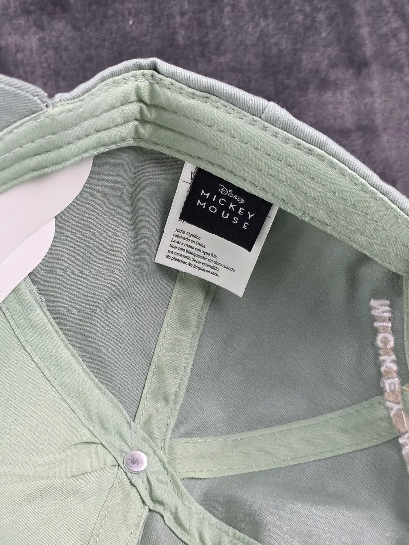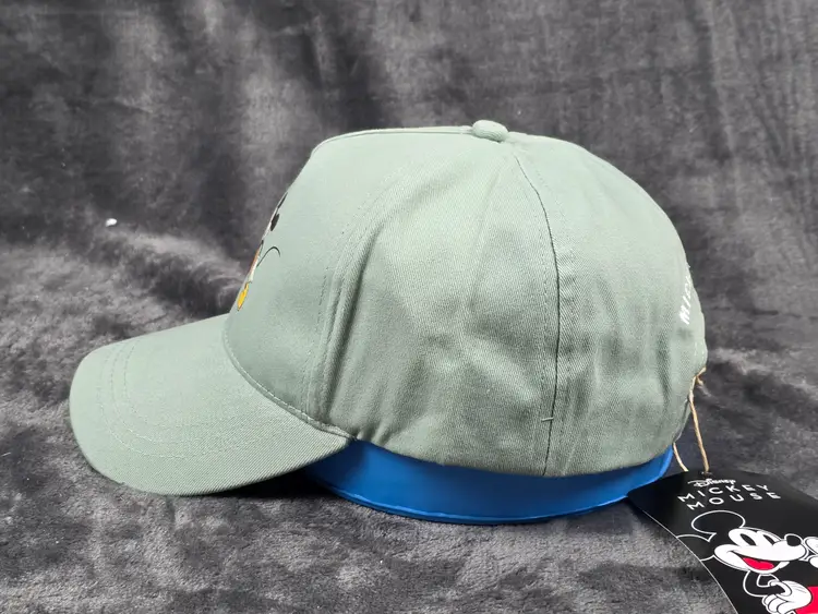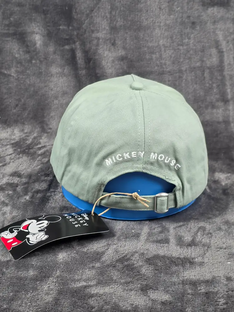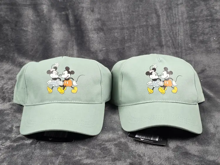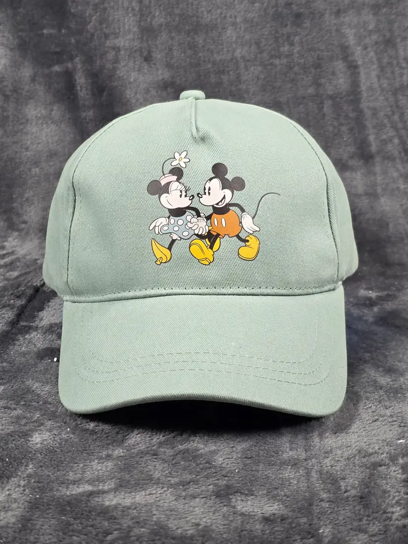 Add a touch of classic Disney charm to your wardrobe with this vintage light green baseball cap featuring Mickey Mouse and Minnie Mouse in their iconic outfits. Mickey sports his red shorts and yellow shoes, while Minnie dazzles in a blue polka dot dress, yellow shoes, and a flowered hat. The cap is perfect for collectors, Disney fans, or anyone looking to add a playful retro vibe to their style.