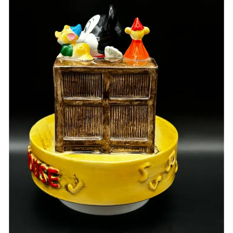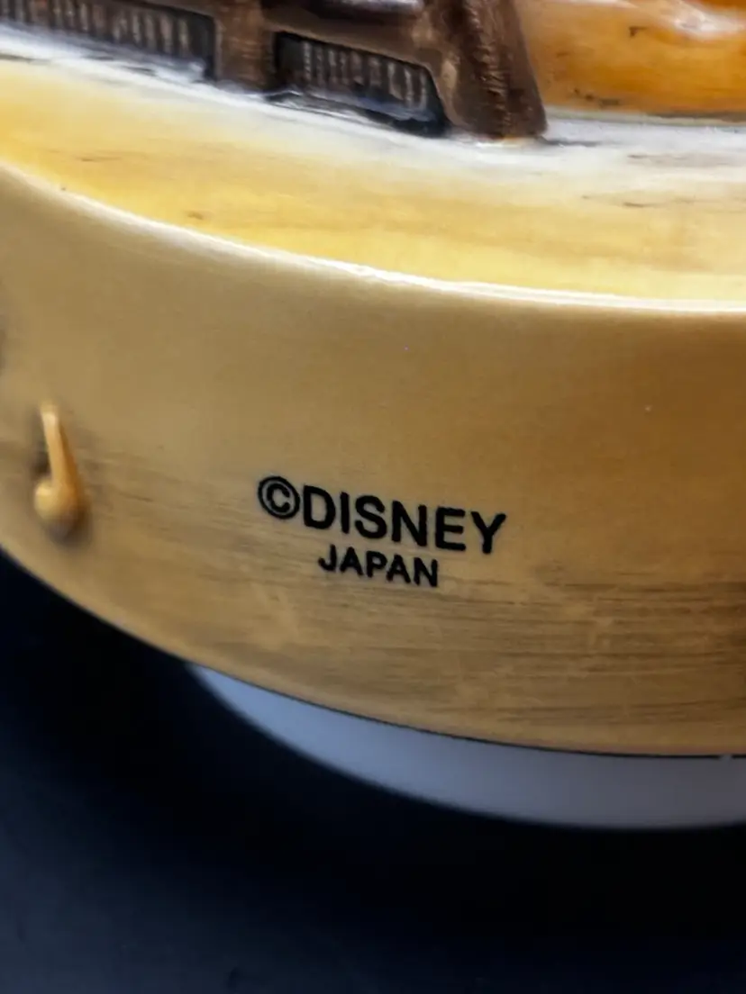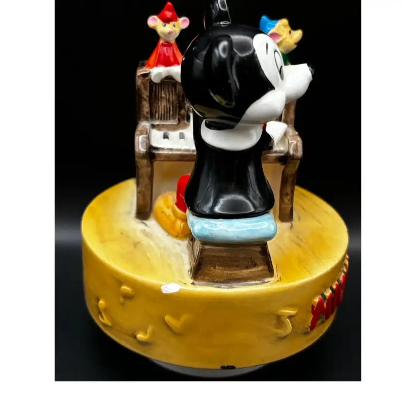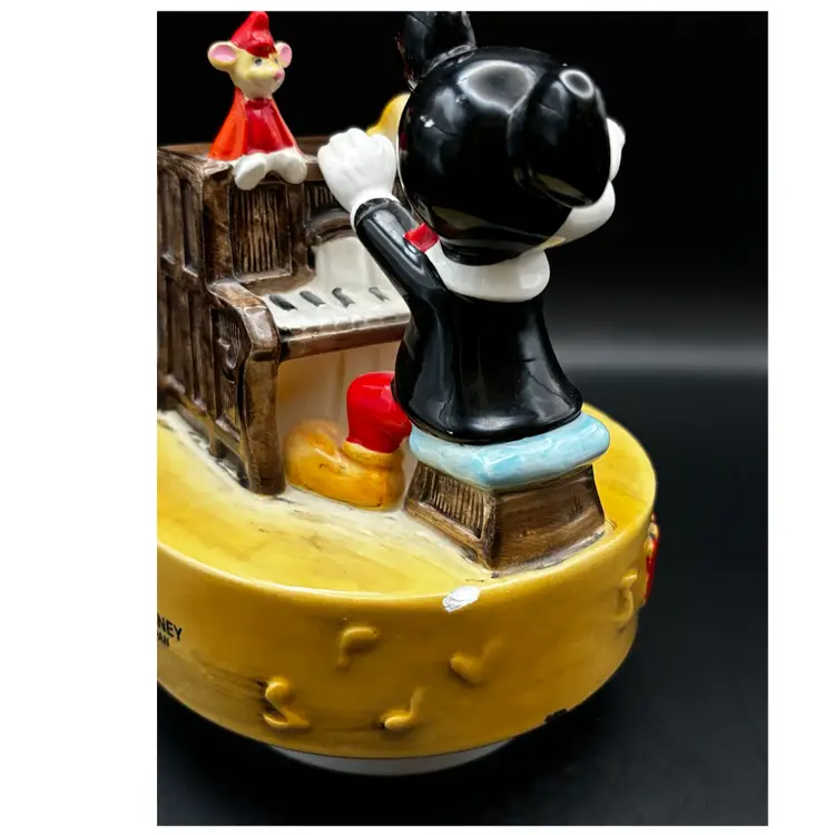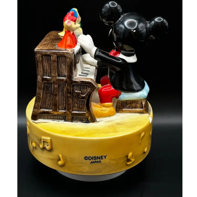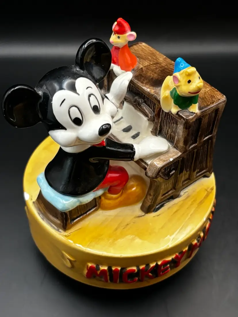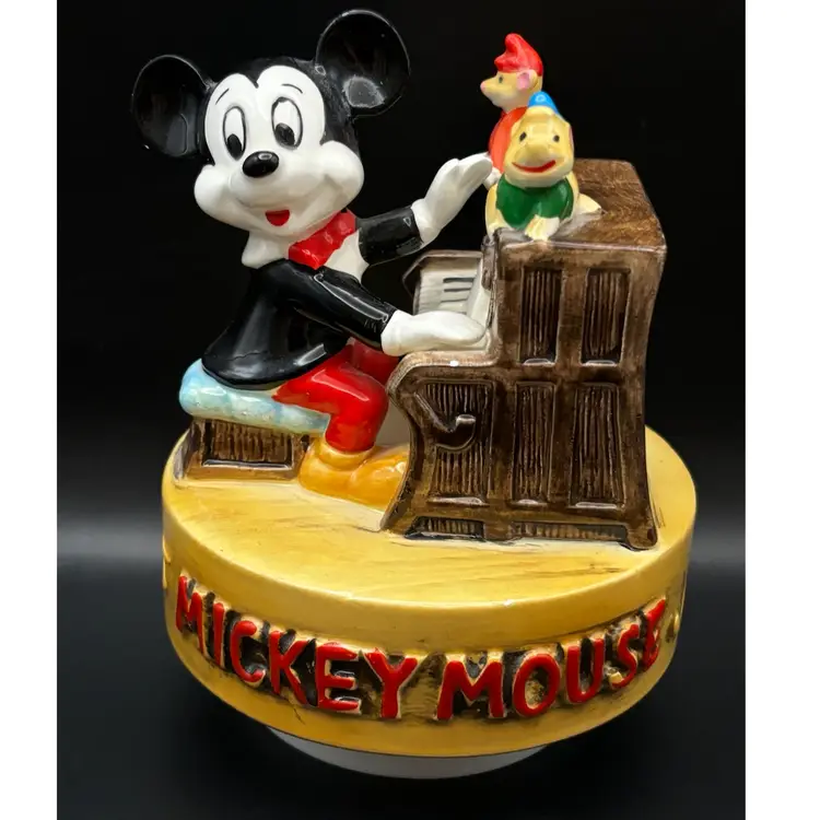 Working vintage music box made in Japan plays the classic Mickey Mouse song we all know and love. It has a few paint chips due to age but works beautifully. 6 inches tall 5 inches in diameter