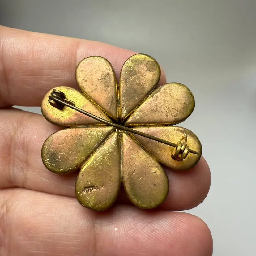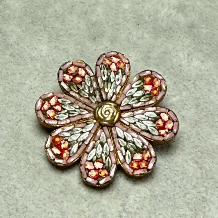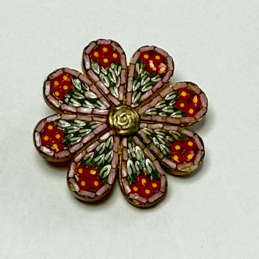 Vintage Micro Mosaic Glass 8 Petal Flower Brooch Pin Pink Red Signed Italy Stunning. No missing stones. Good vintage condition with some wear on metal. 1.5" diameter.