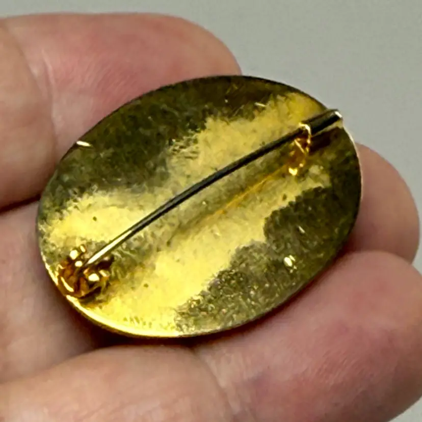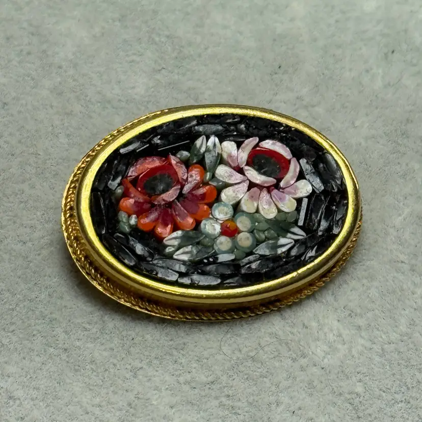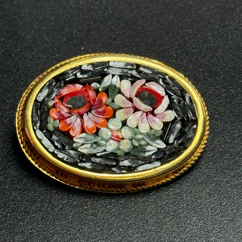 Vintage Micro Mosaic Glass Black Red Pink Oval Flower Brooch Italy Gold Tone. 1 5/8" across. No missing stones. Good vintage condition with very light wear.