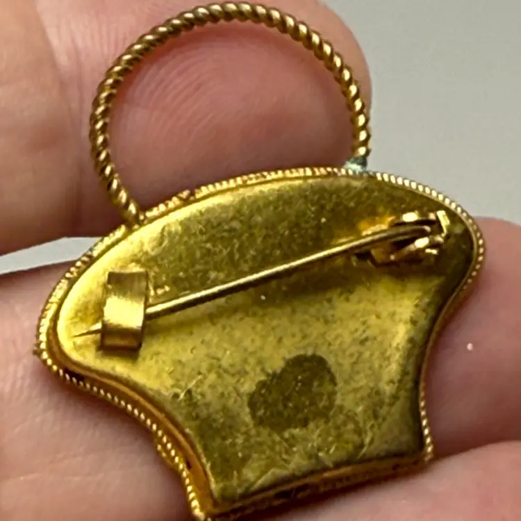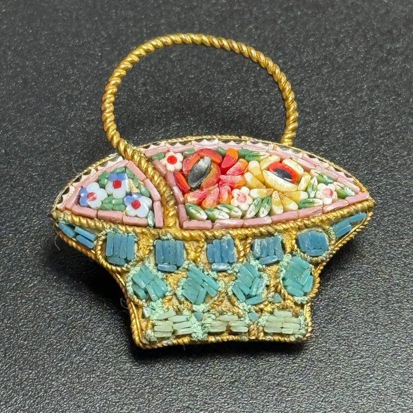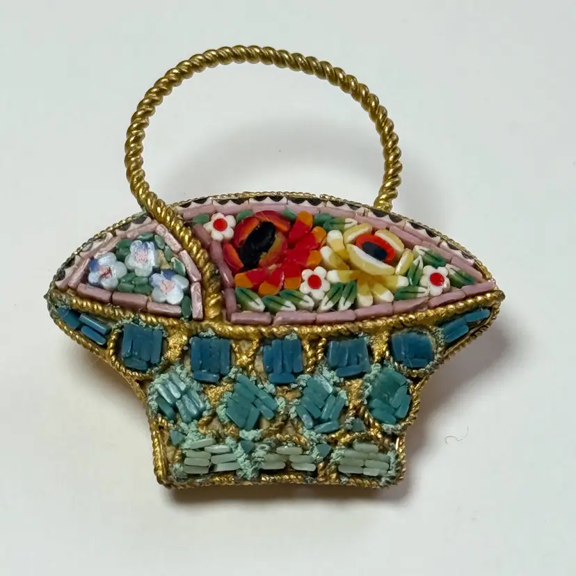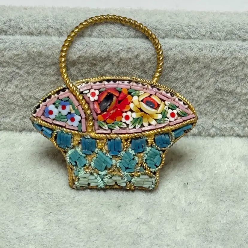Vintage Micro Mosaic Glass Bride's Flower Basket Brooch Pin Gold Tone Rope Border Italy. No missing stones. Light wear from age. 1.5" tall.