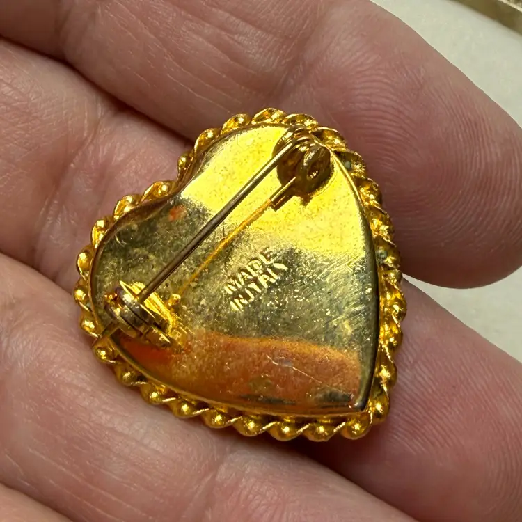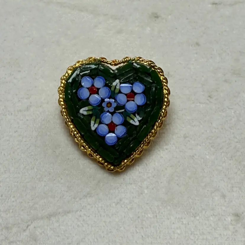 Vintage Micro Mosaic Green Heart w/ Blue Forget Me Not Broch Pin Italy Gold Tone Love. Made in Italy marked on back. About 1" across. No missing stones. Great condition.