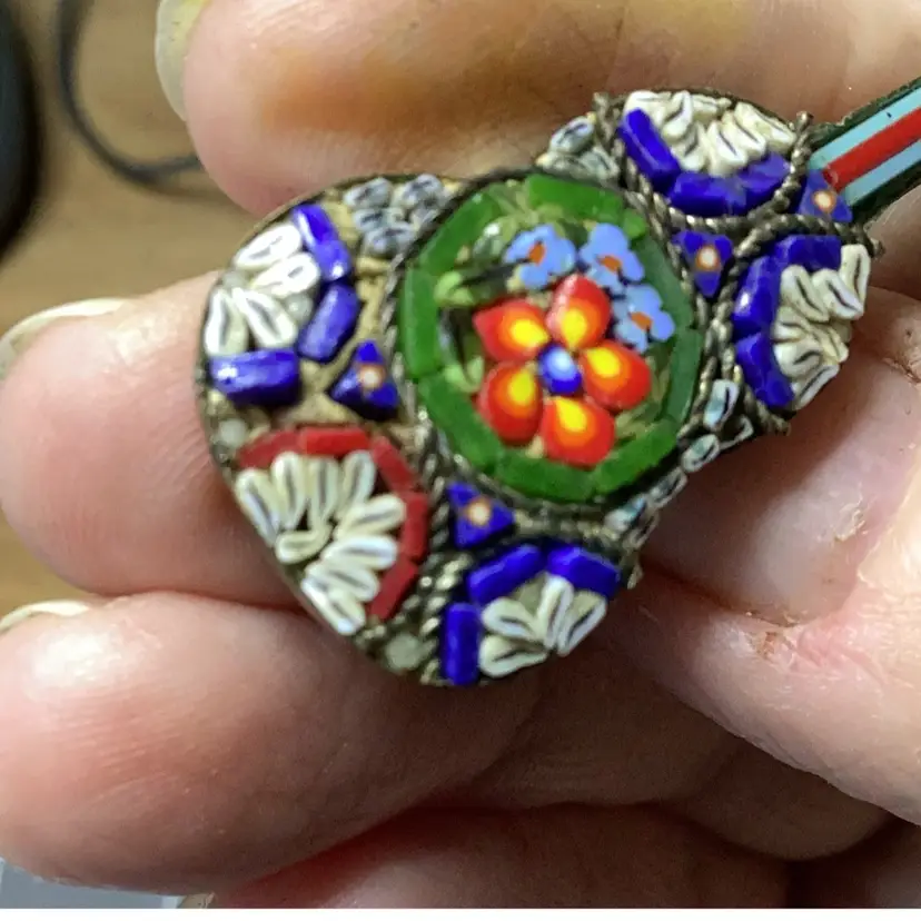 Super cute silver tone c-clasp. Good condition in general but missing a small piece of wire (see last photo). Still very wearable and beautiful. No missing mosaics.