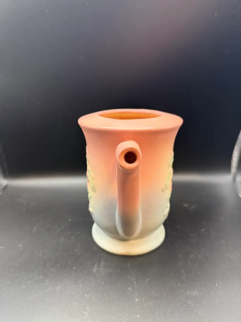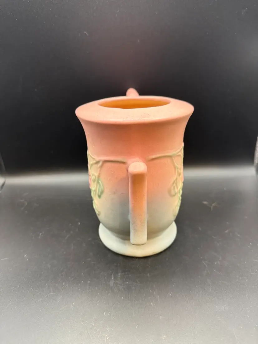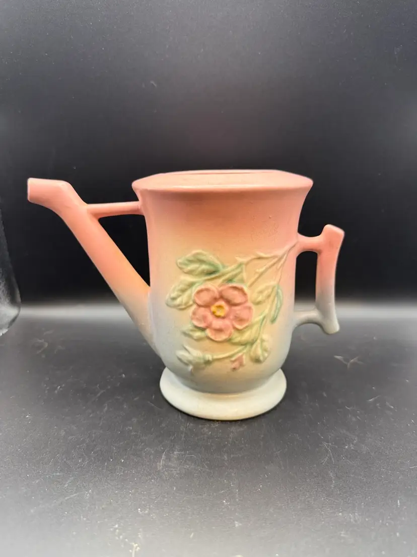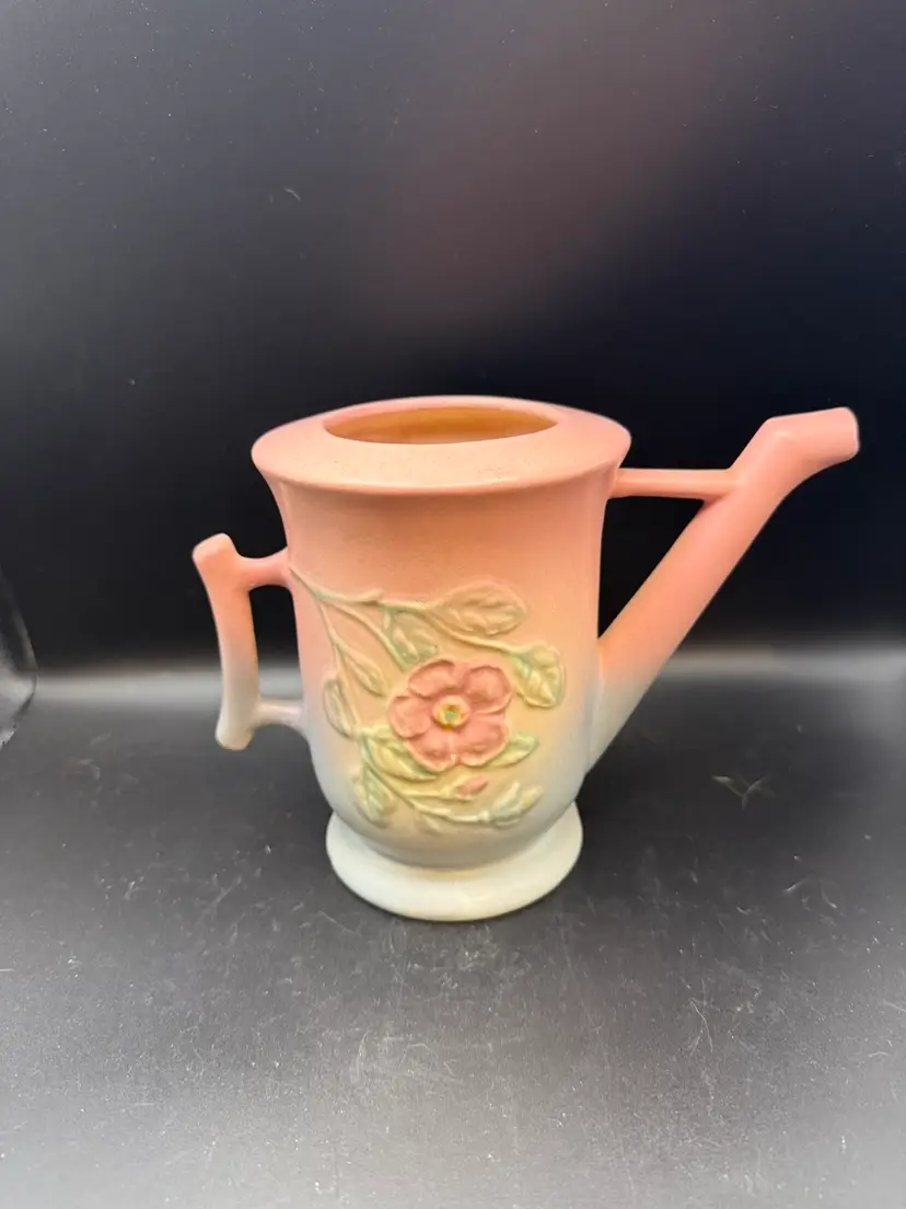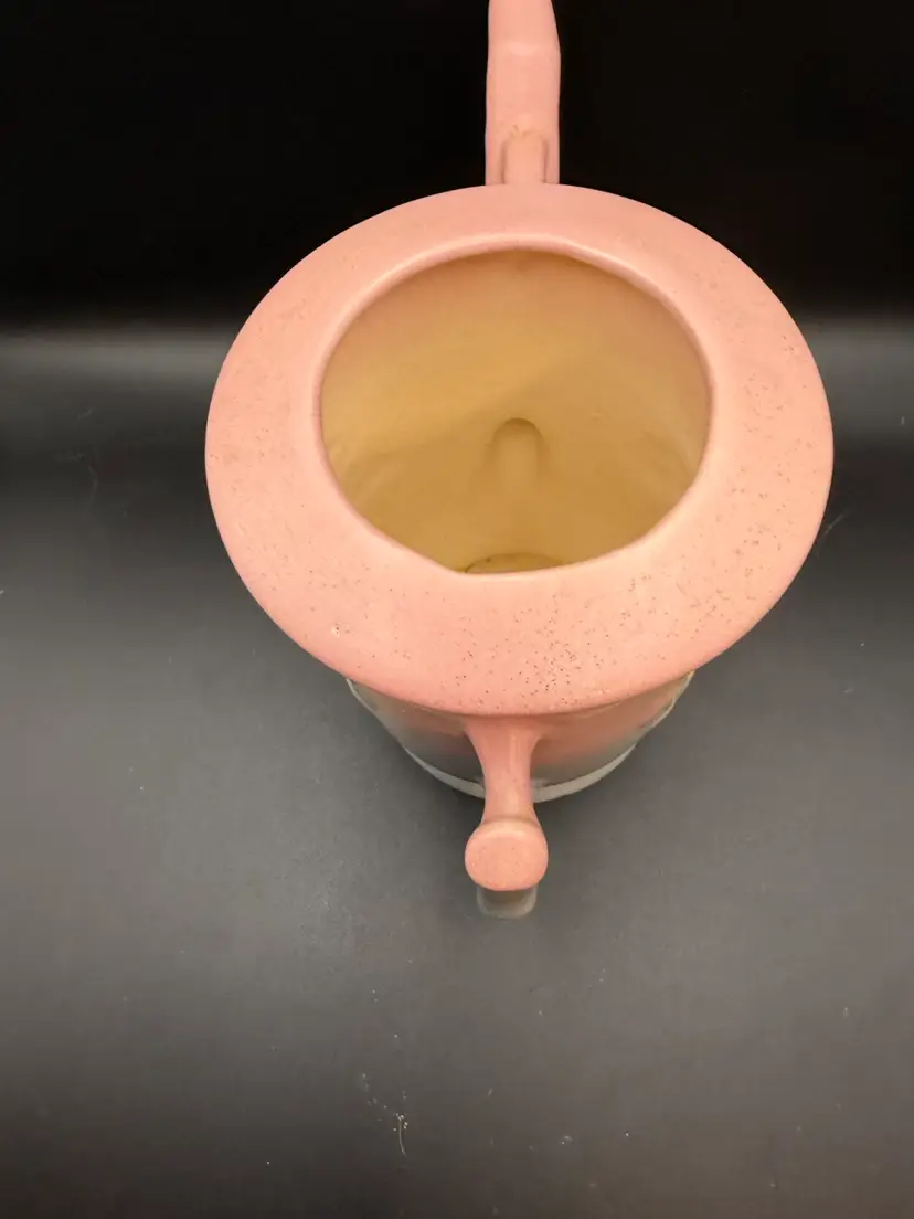 This beautiful teapot is identified by its distinctive pink and blue/green glaze and embossed dogwood floral pattern. Missing lid.