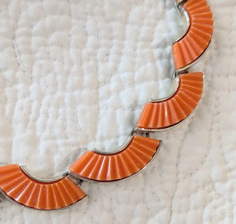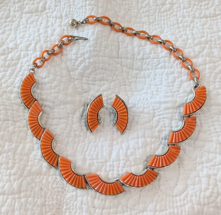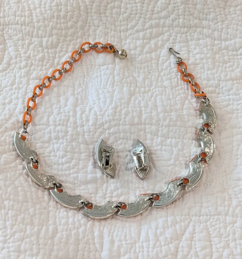 The necklace is 17" long and the earrings are 1-1/4" long. Unmarked