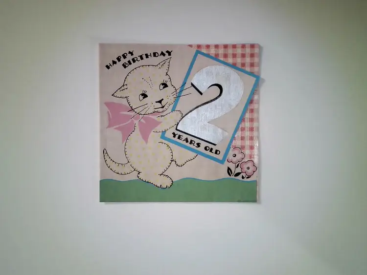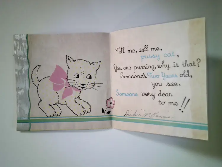 This is a vintage 2nd birthday card featuring a cute cat with a pink bow, marked "Made in U.S.A." on the back. The front reads "HAPPY BIRTHDAY 2 YEARS OLD" with the number "2" highlighted. Inside, the message reads "Tell me, tell me, cat, You are purring, why is that? Someone's Two Years old, Someone very dear to me!!" signed by "Dickie McKenna."