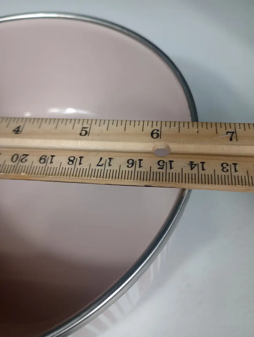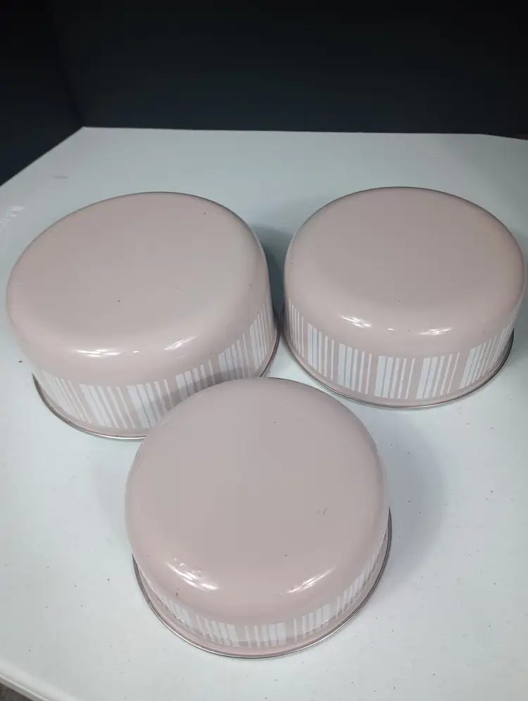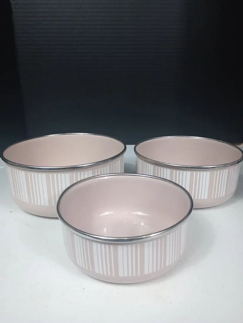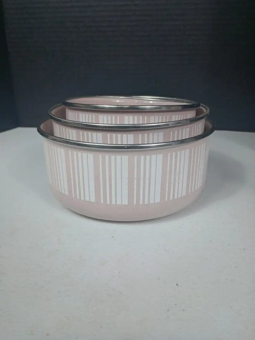 Vintage 3 pc Enamelware Mixing Dusty Pink, Barcode Line Bowls by Kobe. In certain lights, the dusty pink looks more like a beige color.