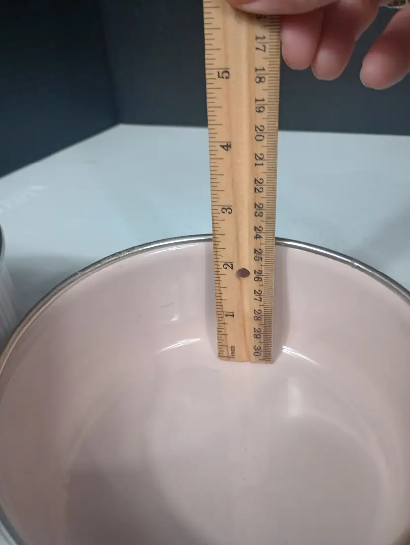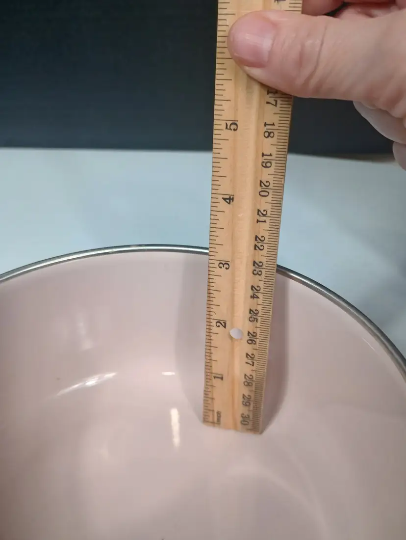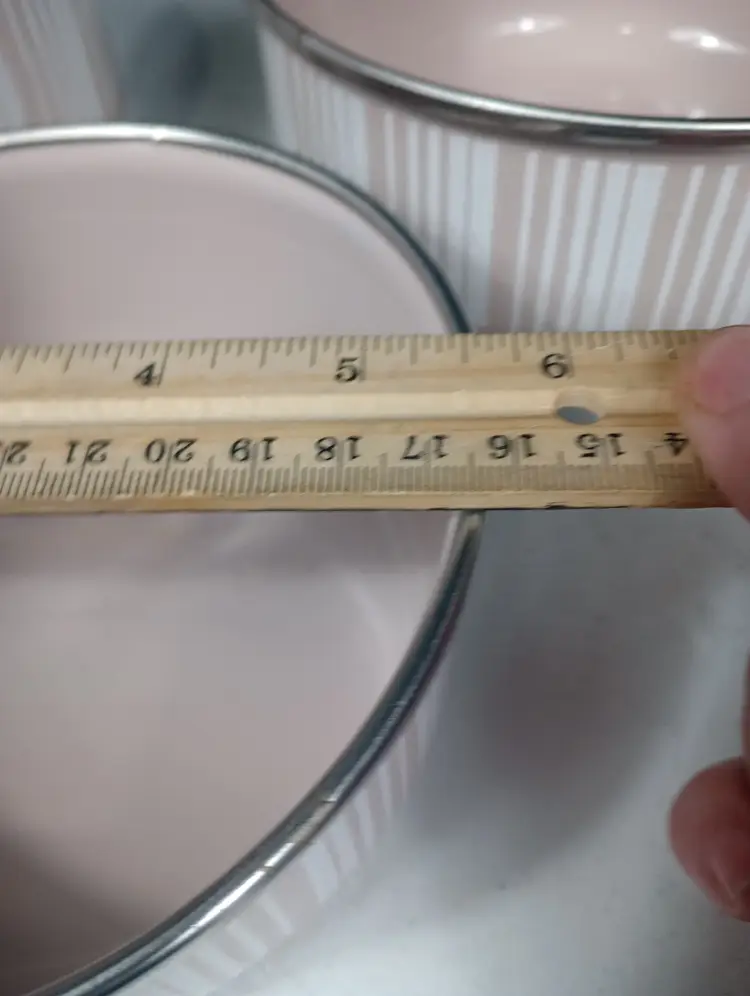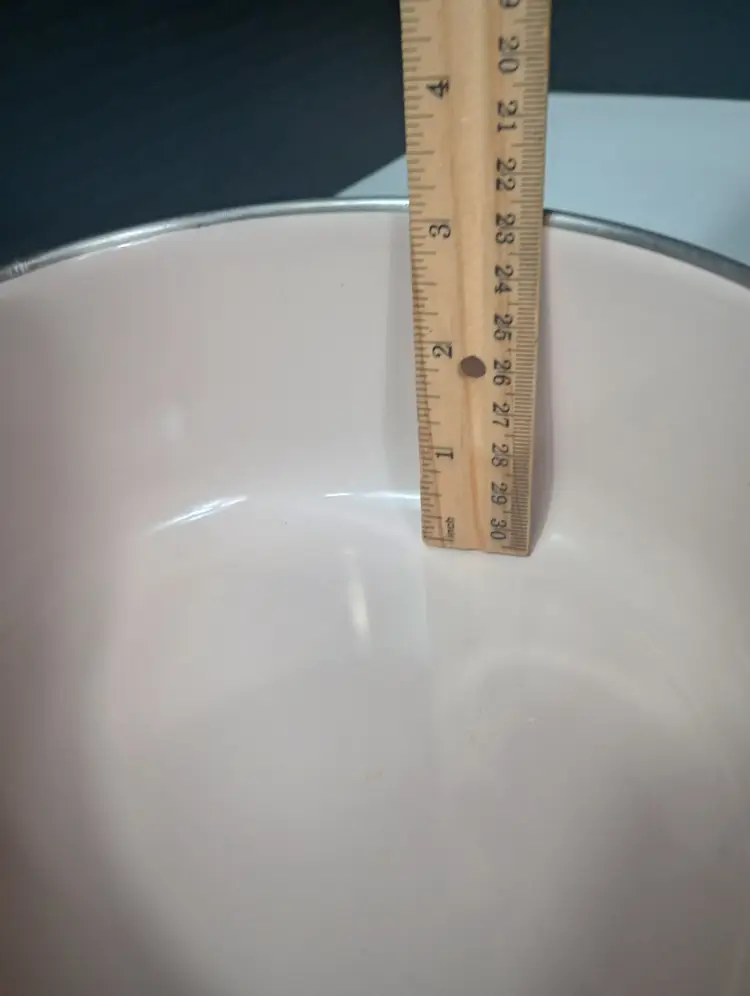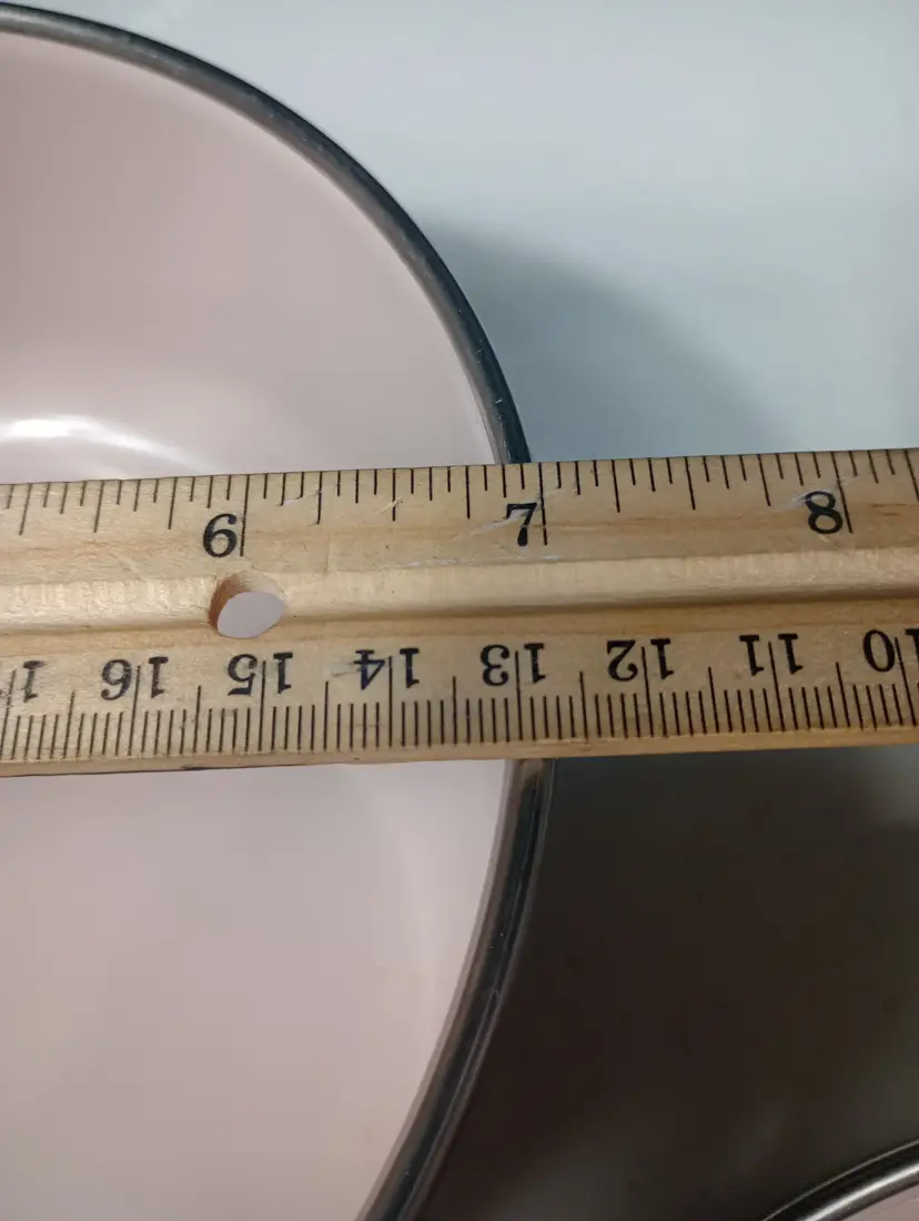 Vintage 3 pc Enamelware Mixing Dusty Pink, Barcode Line Bowls by Kobe. In certain lights, the dusty pink looks more like a beige color.