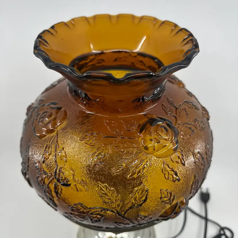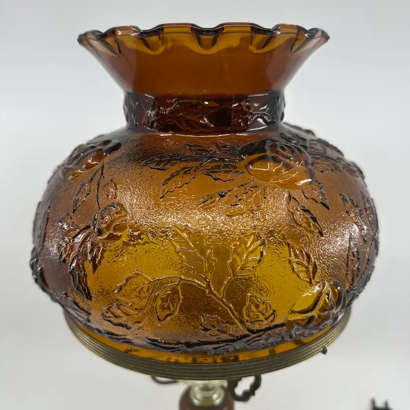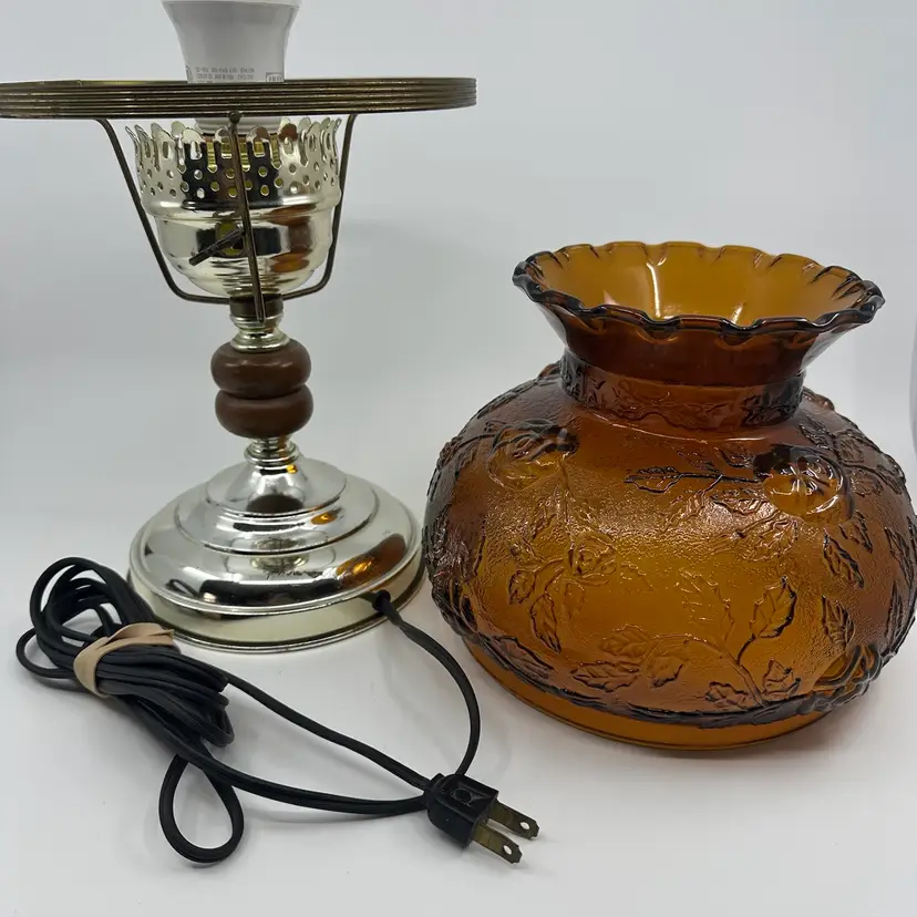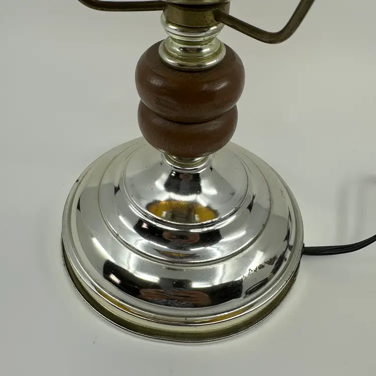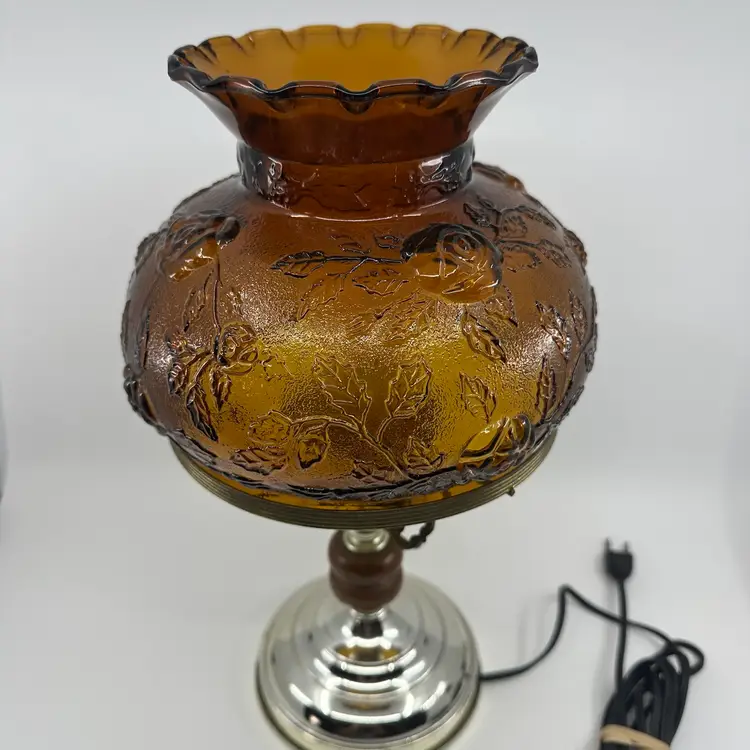 Plugged in and tested, works great!! Beautiful!! Has some patina on the gold part, wooden area around the stand is a great detail and the glass has no chips or cracks. Approx 18” tall.