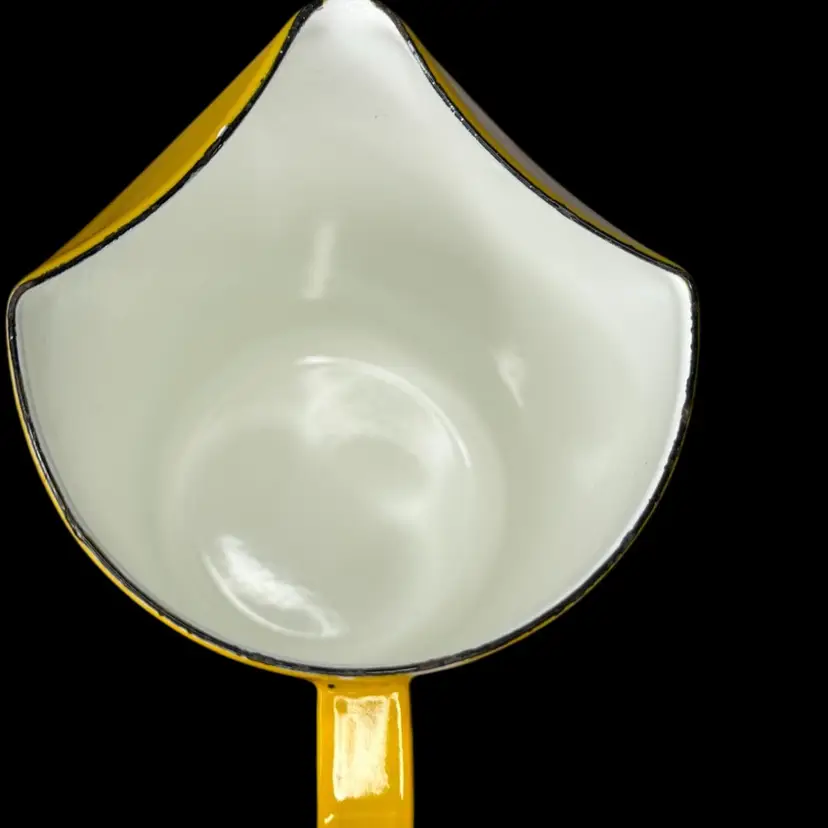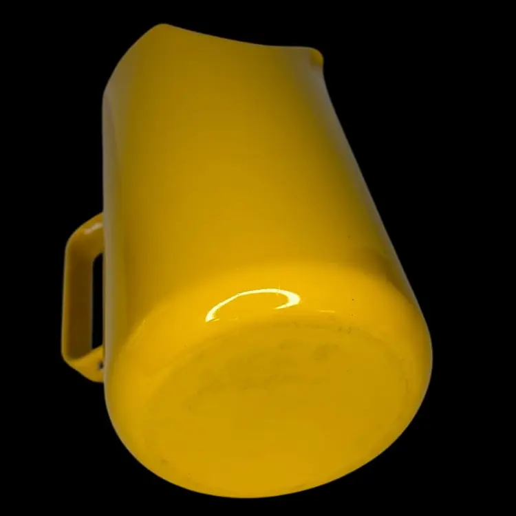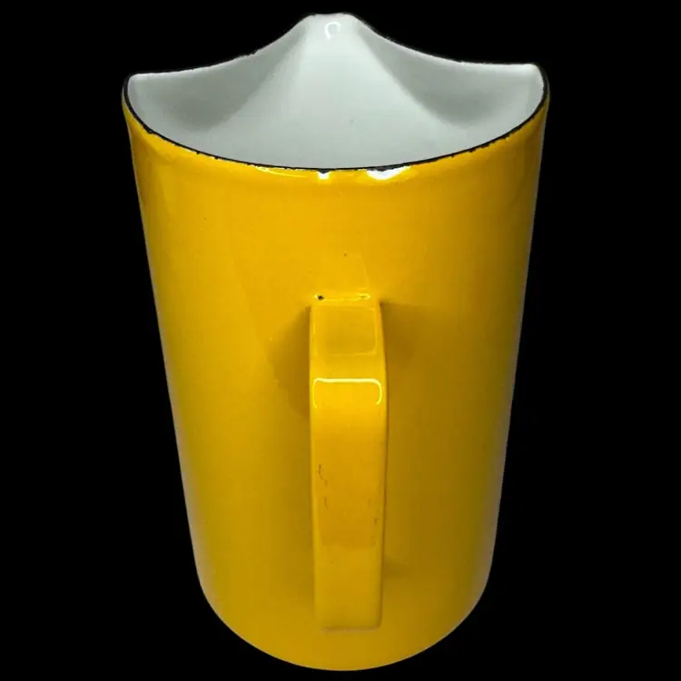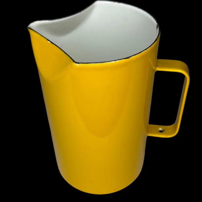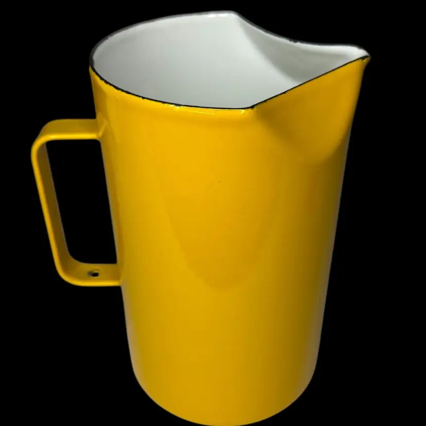 Vintage Mid Century Arabia Finland Pitcher, Kaj Franck Enamel Yellow, 7 1/2" Tall and 4 3/8" diameter. It is in good vintage condition with enamel chip wear as is expected with enamel serving pieces. The bright yellow color is vibrant and fun.