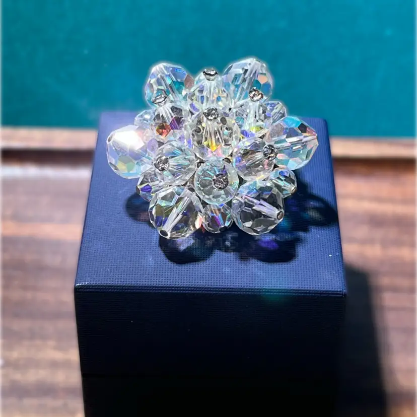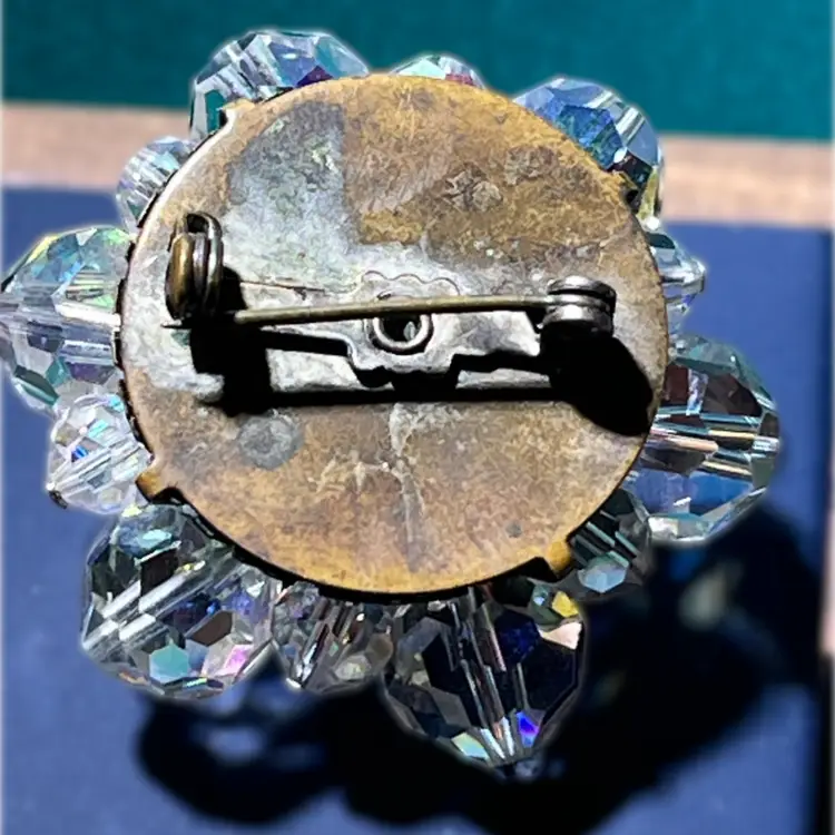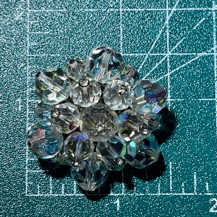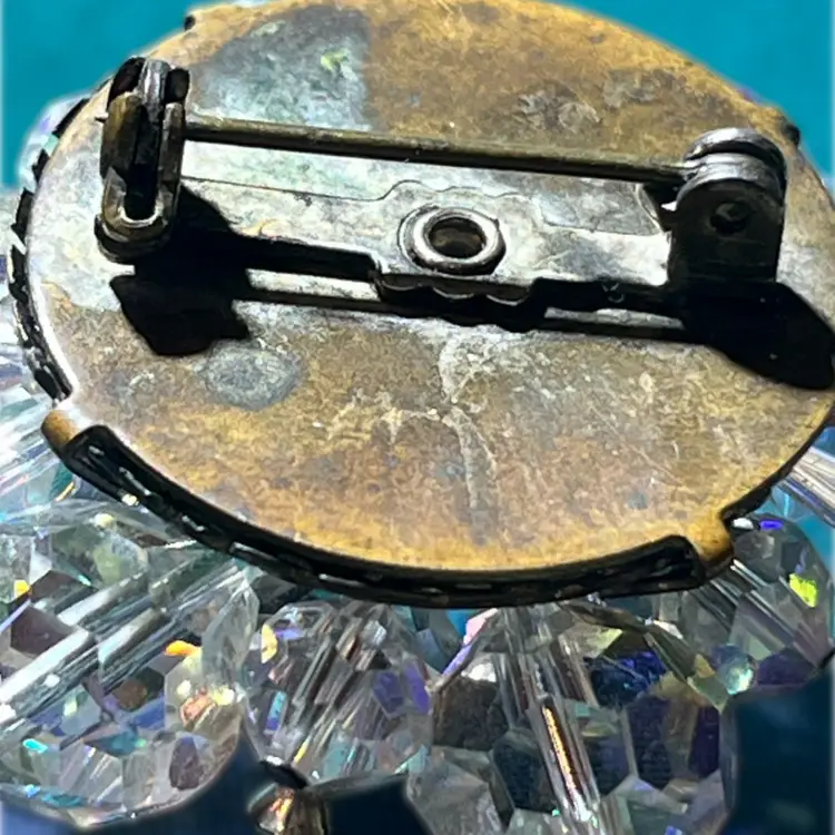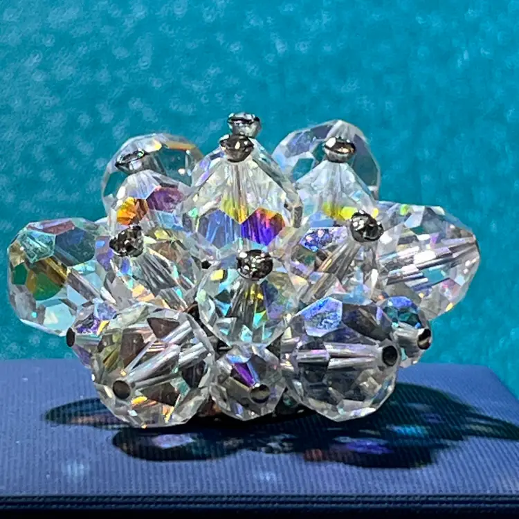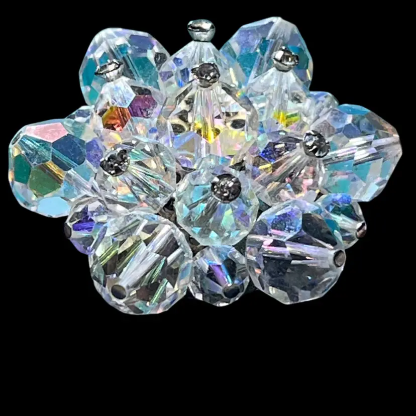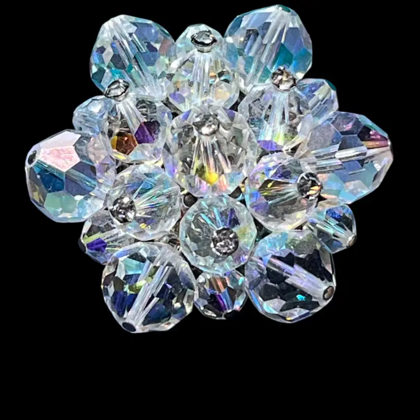 Condition: Excellent Vintage Condition Era: circa 1950s–1960s Style: Mid-Century Glamour / Bridal / Collector Add a touch of vintage sparkle to your collection with this gorgeous Aurora Borealis (AB) crystal cluster brooch. This piece features high-quality, faceted glass beads arranged in a tiered, domed "flower" design. Each bead is finished with the iconic AB coating, which catches the light to create a dazzling array of rainbow hues including pink, blue, and gold. • Design: A multi-layered cluster of bicone and round faceted beads, each centered with a tiny silver-tone prong-set rhinestone for extra brilliance. • Backing: The beads are wired onto a sturdy brass-tone base plate (unsigned), showing an authentic aged patina that confirms its vintage age. • Closure: Features a secure, traditional rollover safety clasp in good working order. • Size: Approximately 1.5 inches in diameter (based on scale photo). This brooch is perfect for a bridal bouquet, a lapel accent, or as a timeless gift for a vintage jewelry enthusiast.