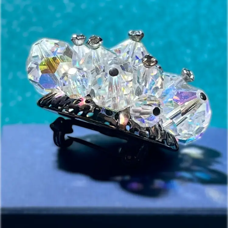 Seller's Note: While this piece is unsigned, the quality of the faceting and the secure wiring suggest it was a well-made mid-market piece from the mid-20th century. Unsigned "bead cluster" brooches of this style are highly sought after by collectors who appreciate the "Aurora" effect.