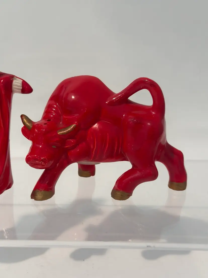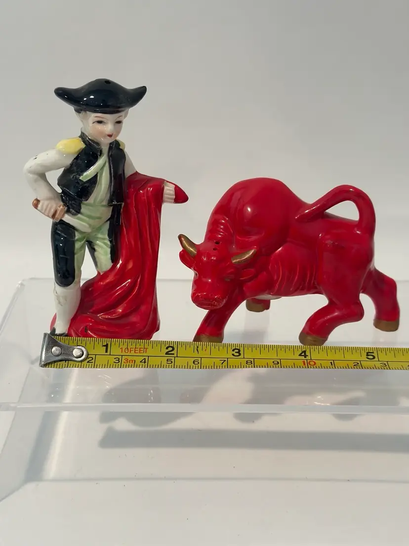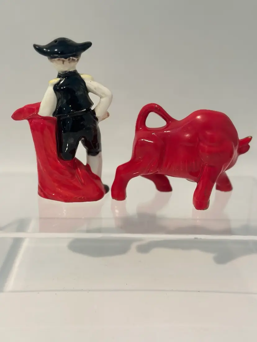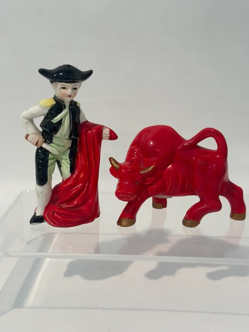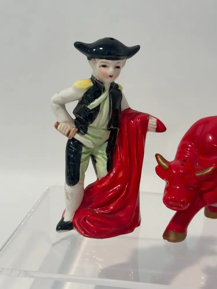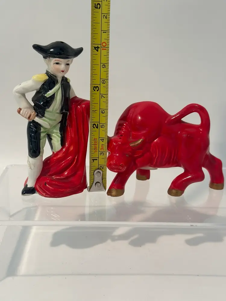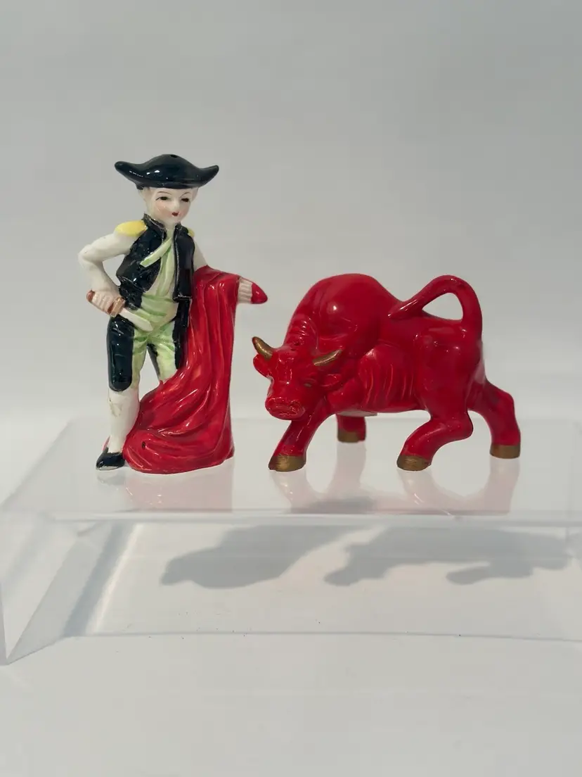 This vintage, mid-century figurine set features a beautifully crafted matador and red bull, both made in Japan during the 1960s. The attention to detail in the ceramic work truly captures the essence and spirit of this beloved Spanish tradition.