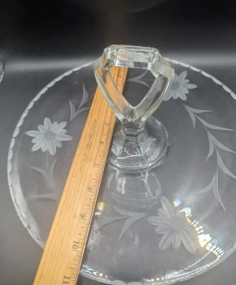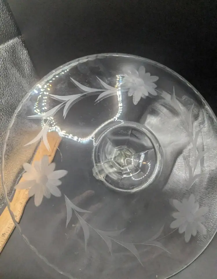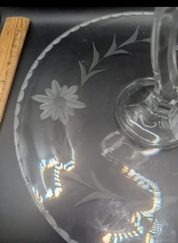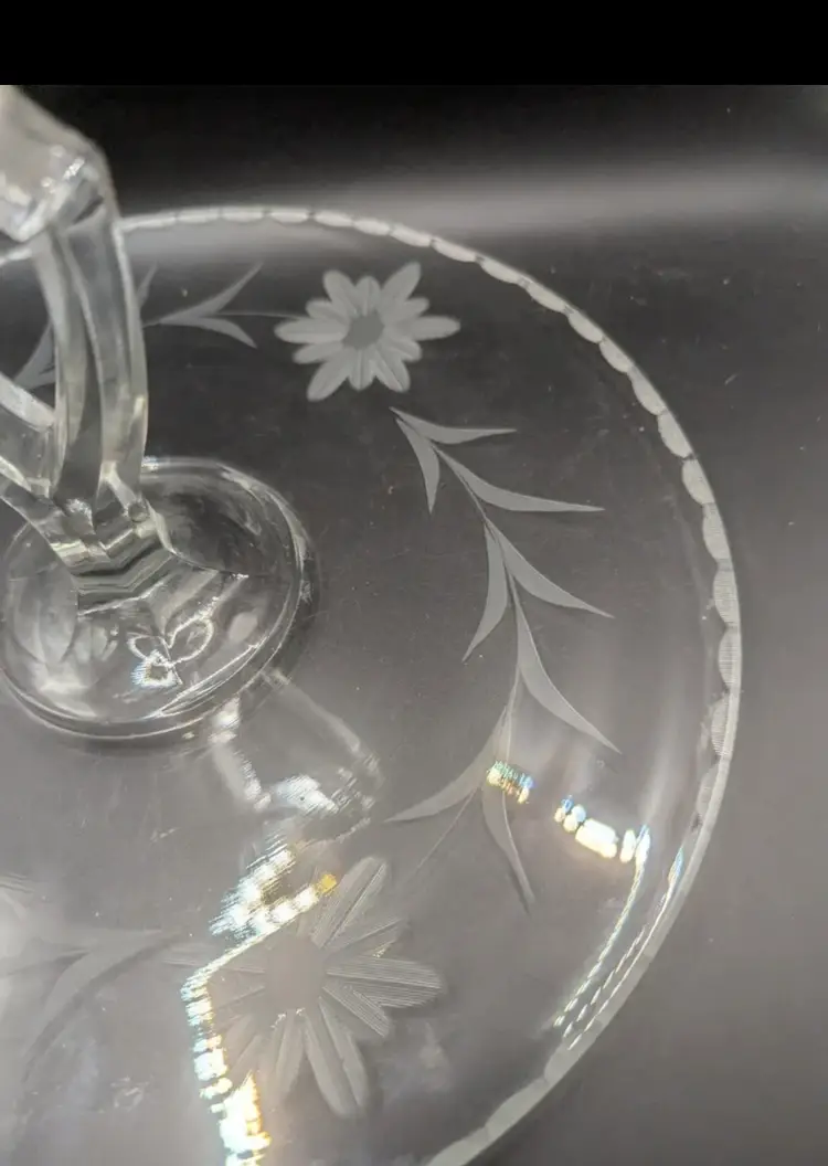 This is a lovely Vintage Mid Century Clear Glass Serving Tidbit Dessert Sandwich Plate. It has a beautiful flower and vine design. No chips or cracks. Please see all pictures for condition and measurements.