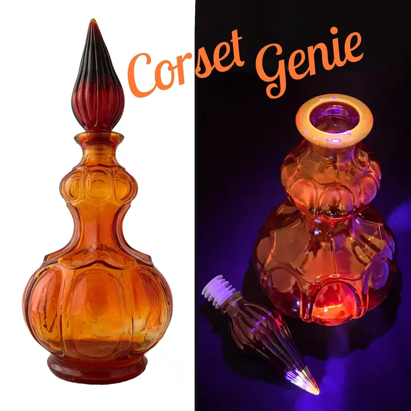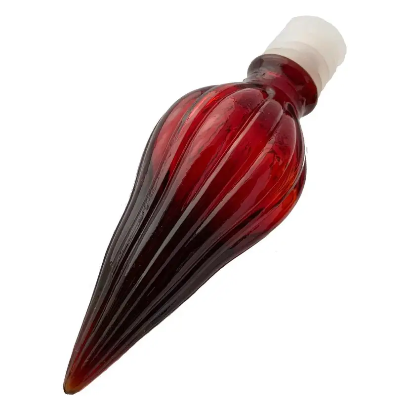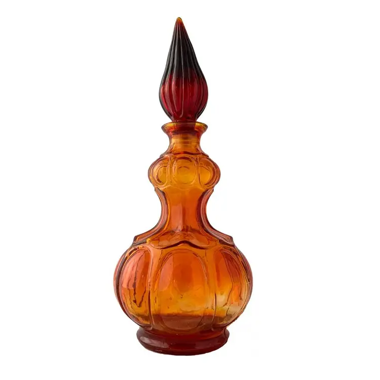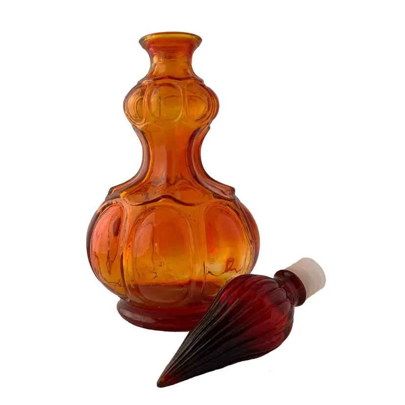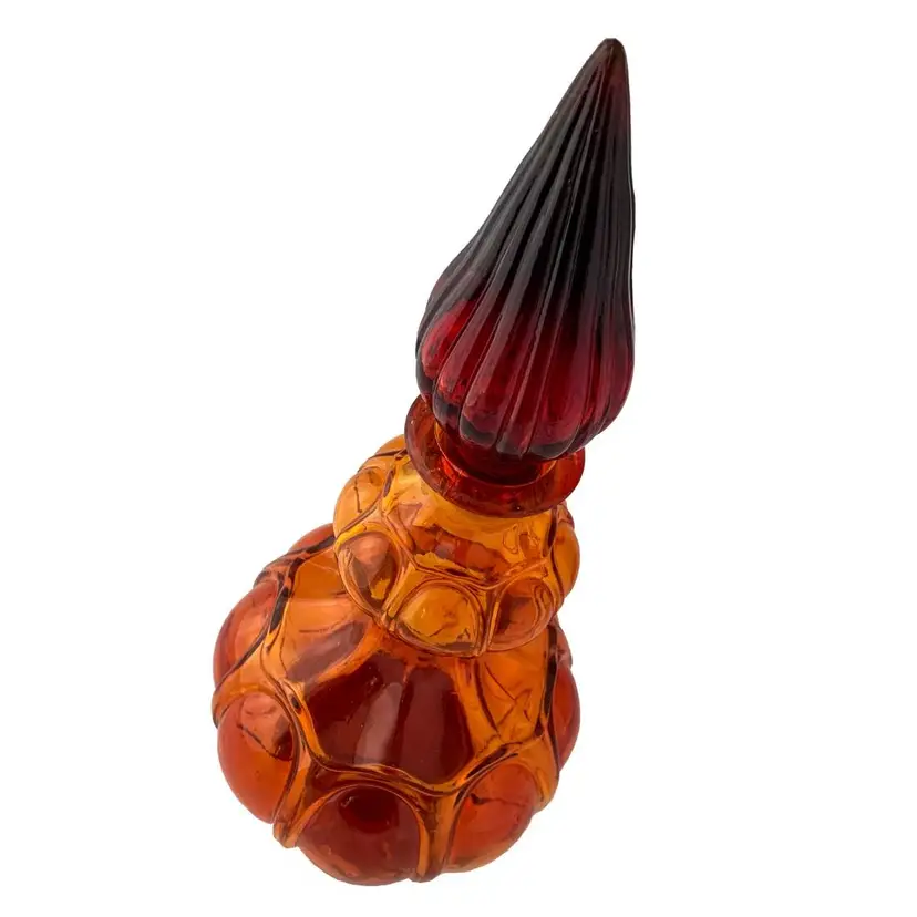 Vintage mid-century Corset shaped flame amberina genie bottle glass decanter with original ribbed stopper with plastic fitting for a tight fit. Produced in the Empoli region of Italy, circa 1960s. The decanter glows brilliantly under black light. Empoli decanters are highly sought after by collectors and we're thrilled to bring this stunning piece of art glass to the shop!