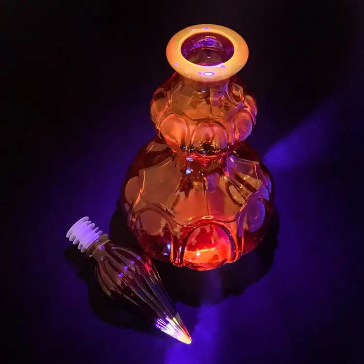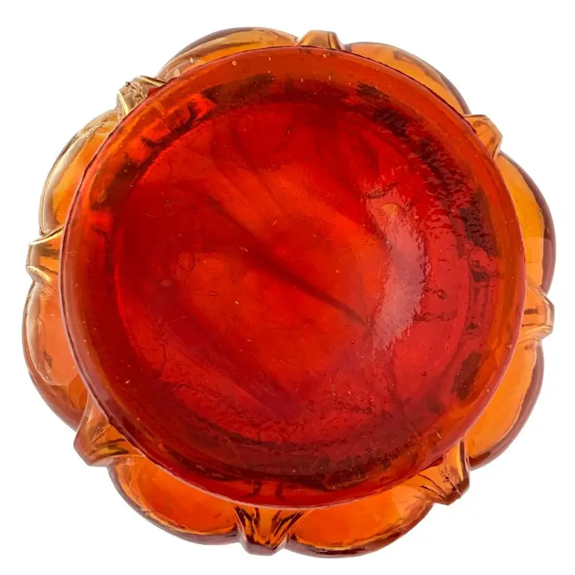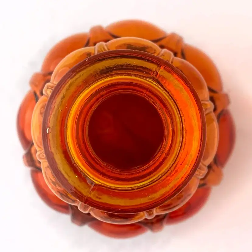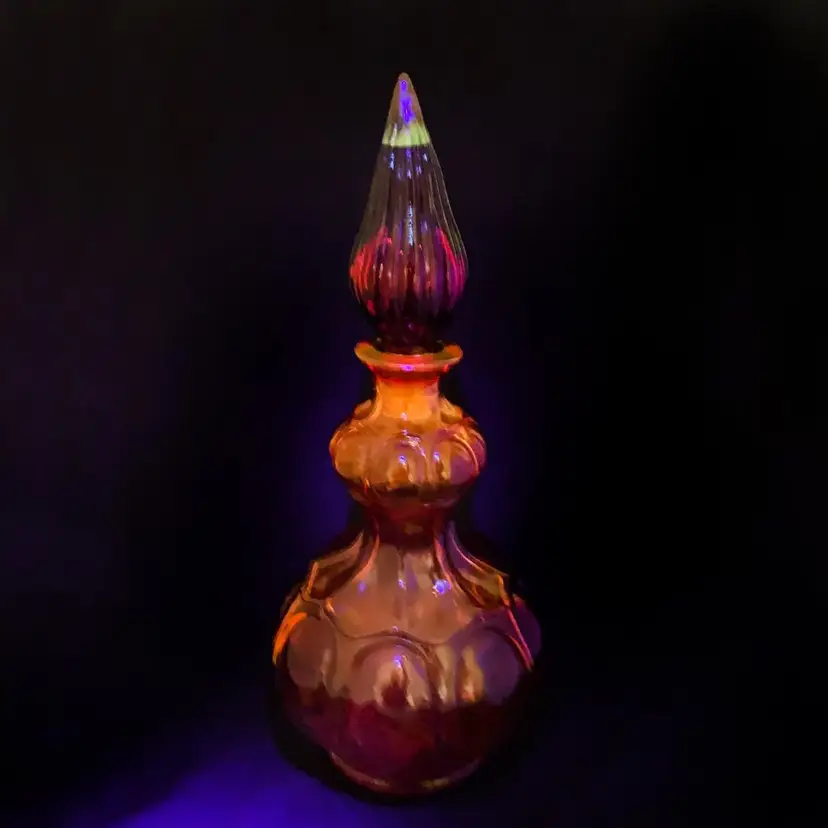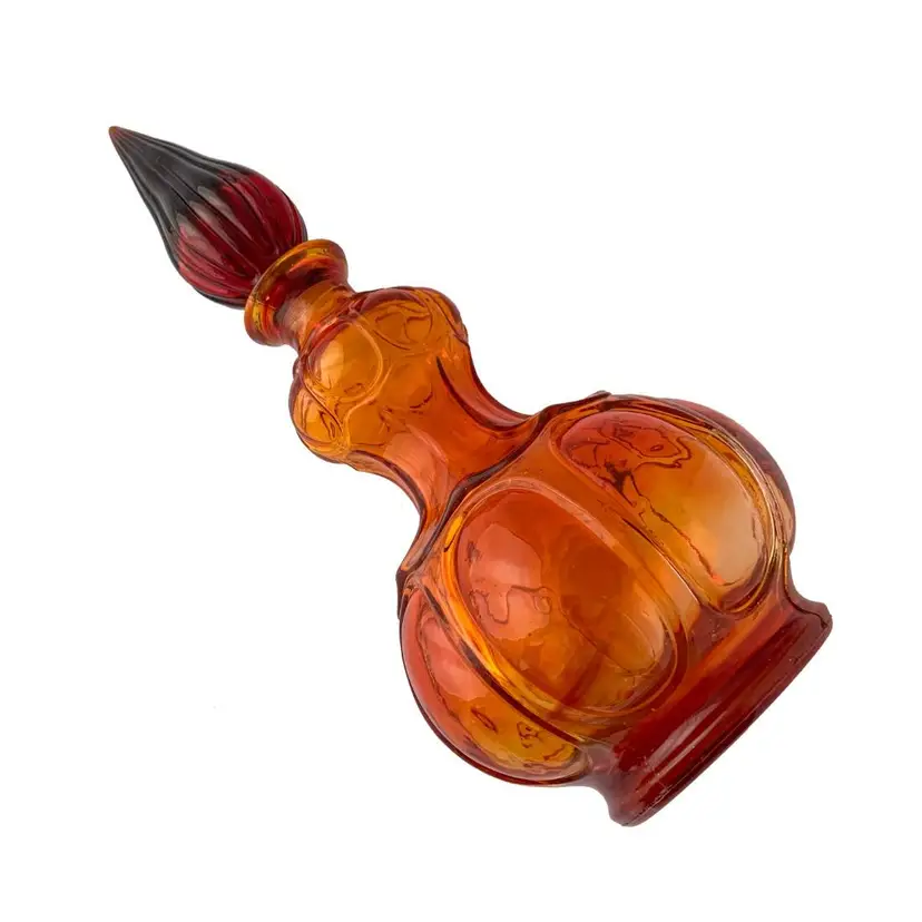 Vintage mid-century Corset shaped flame amberina genie bottle glass decanter with original ribbed stopper with plastic fitting for a tight fit. Produced in the Empoli region of Italy, circa 1960s. The decanter glows brilliantly under black light. Empoli decanters are highly sought after by collectors and we're thrilled to bring this stunning piece of art glass to the shop!