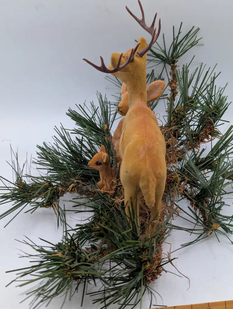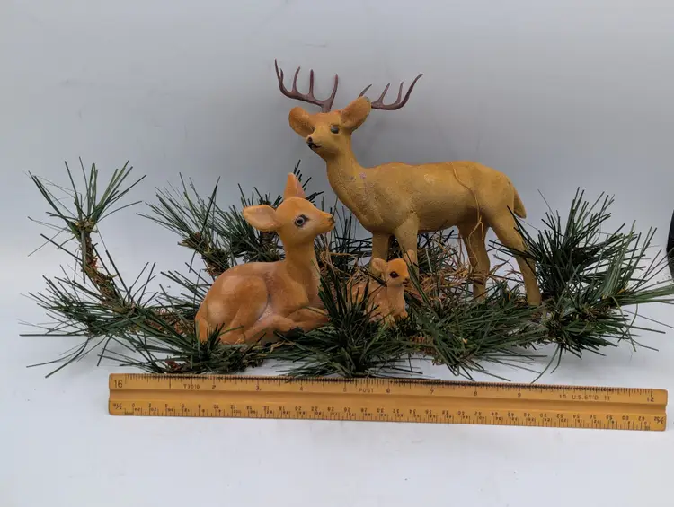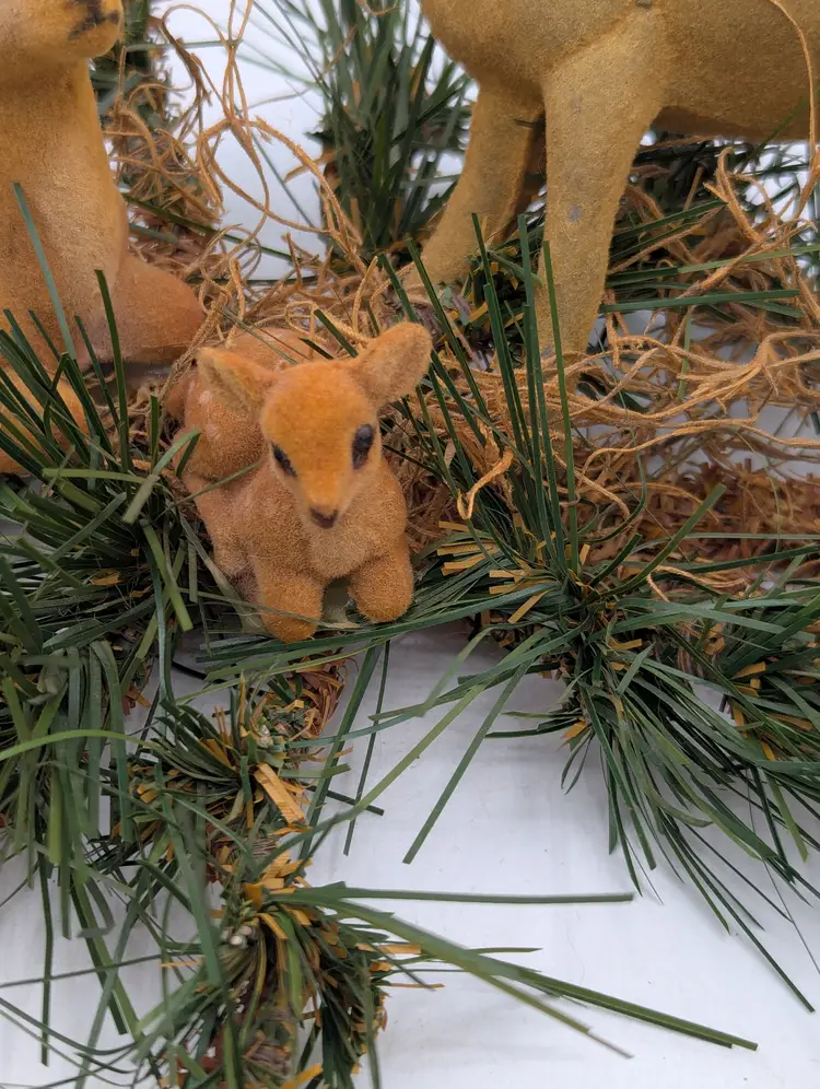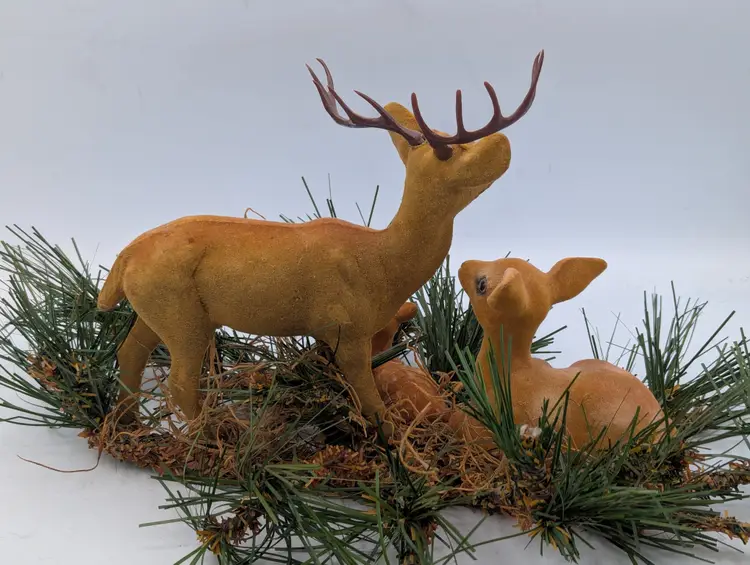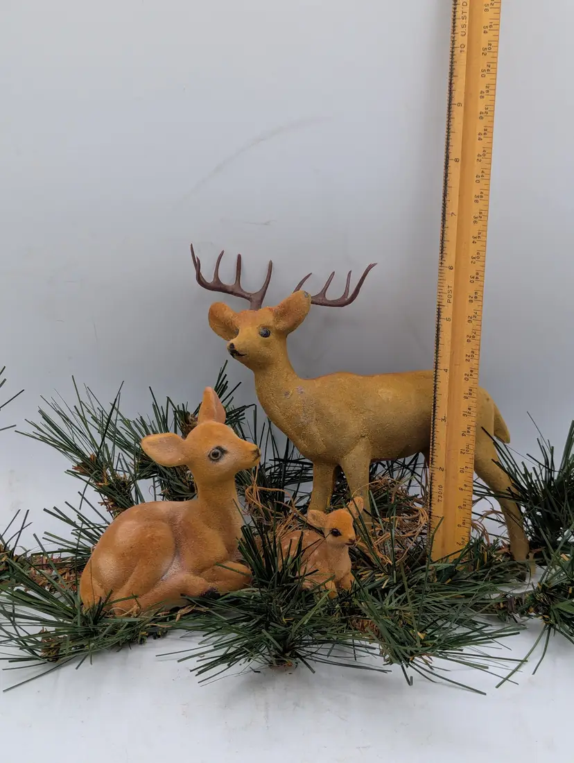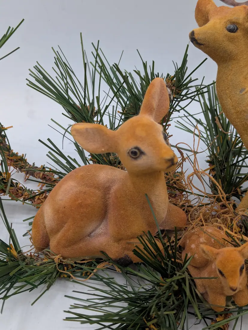 Add a touch of retro charm to your holiday display with this classic set of three (3) vintage flocked deer figurines. This complete family includes a majestic buck with antlers, a graceful doe, and a sweet spotted fawn.