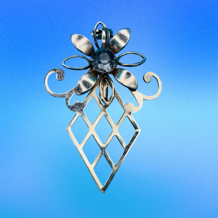 This vintage brooch features an elegant open lattice diamond design topped with a flower motif. The flower has gold-tone petals accented by a sparkling clear rhinestone center, giving the piece a stylish mid-century flair.