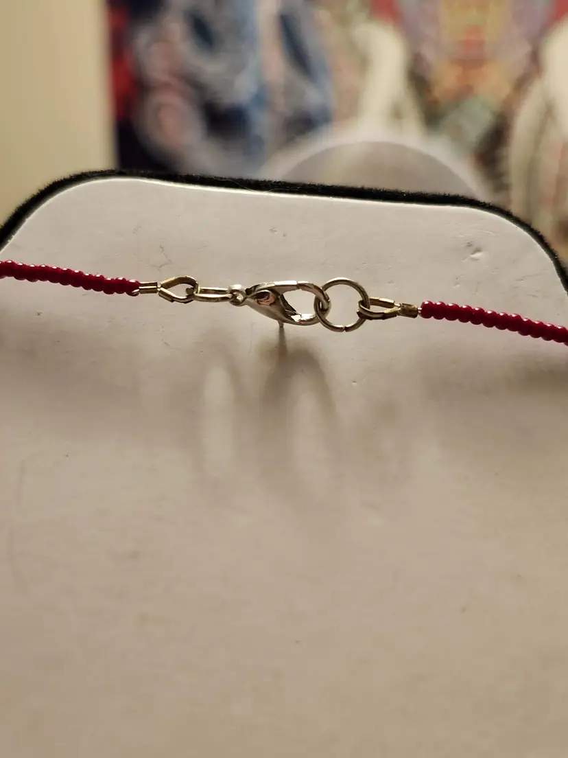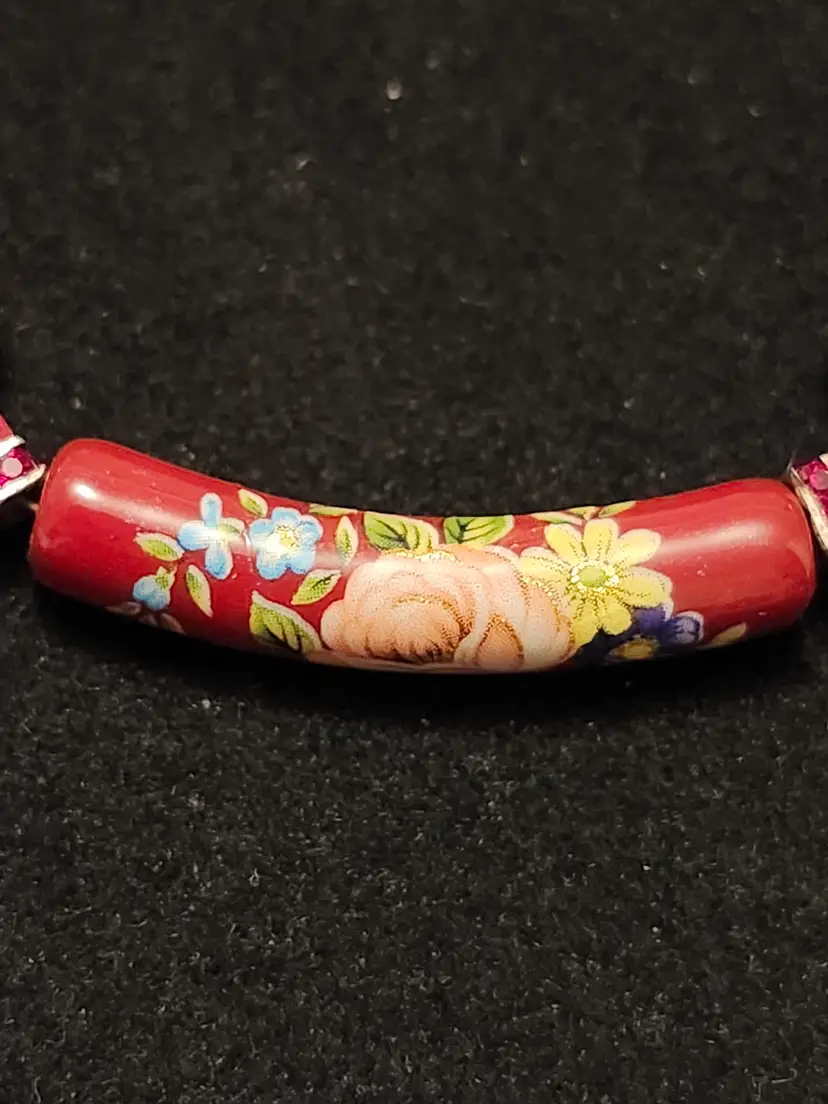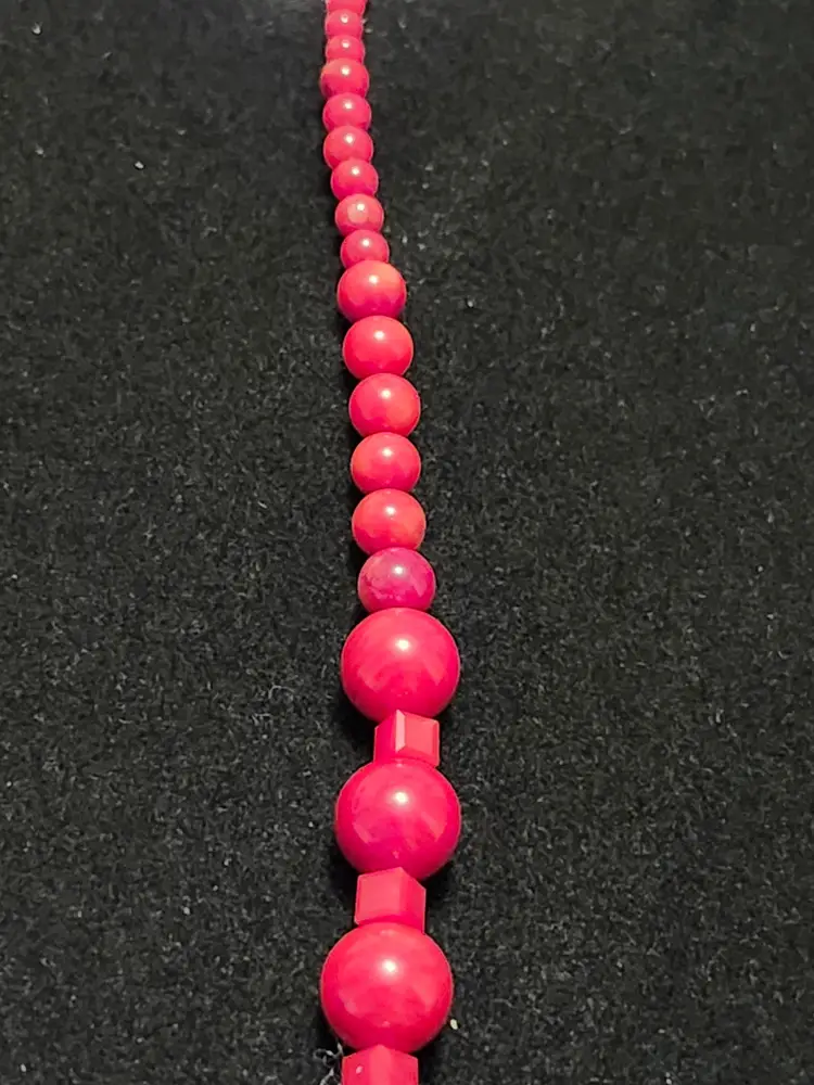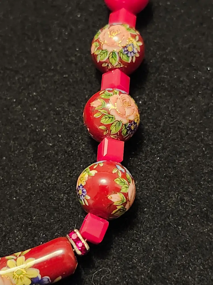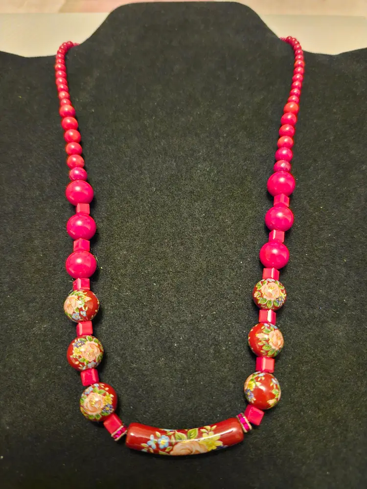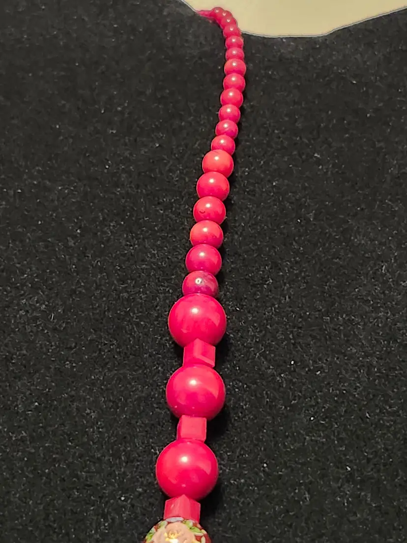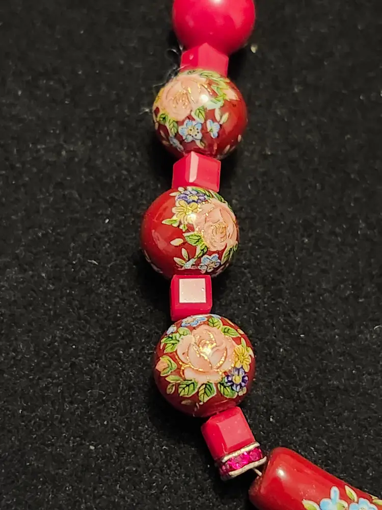 These 171/2 in long graduated red acrilic beads have a beautiful floral scene,very delicate. From the 1950's I believe the clasp has been changed over the years