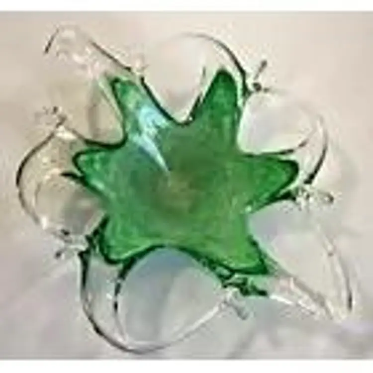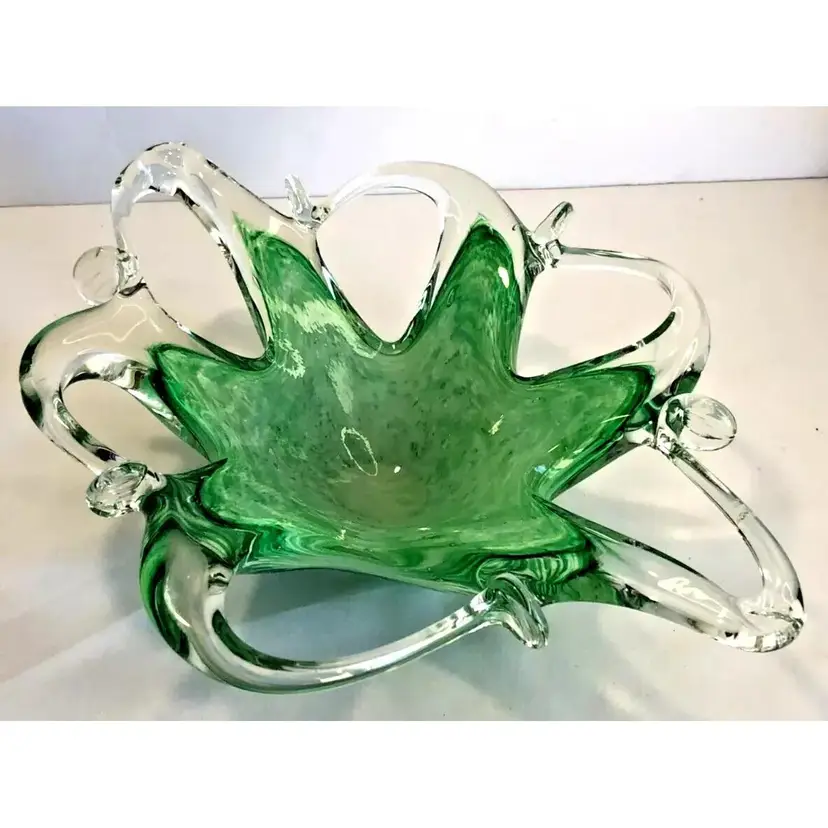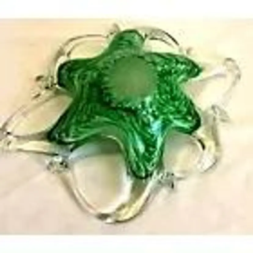 Vintage Mid-Century Green Art Glass Ashtray Bowl Star Openwork Webbed Swirl MCM. 10" diameter at widest point x 2.75" tall. Does have a flaw as disclosed but still displays nicely. Will be packed with bubble wrap and packing materials to prevent further damage. PLEASE READ: There is a crack in one of the arms as shown and an inclusion or group of bubbles as shown in another area. Please view photos.
