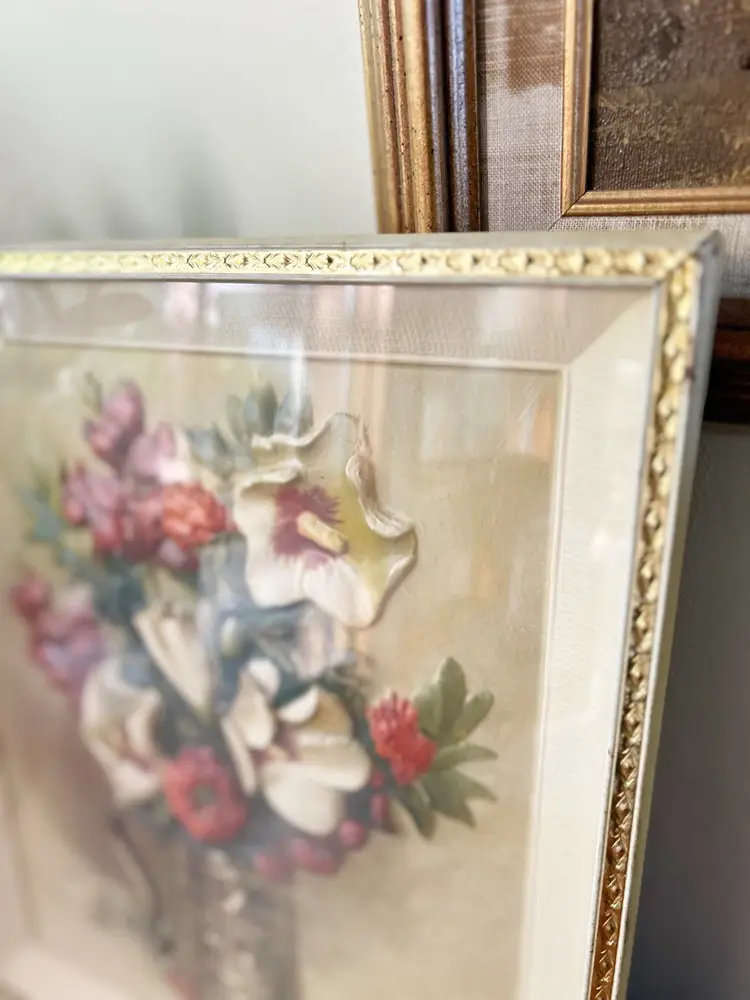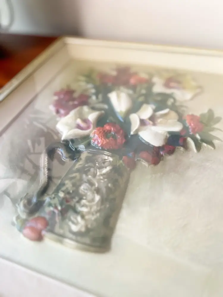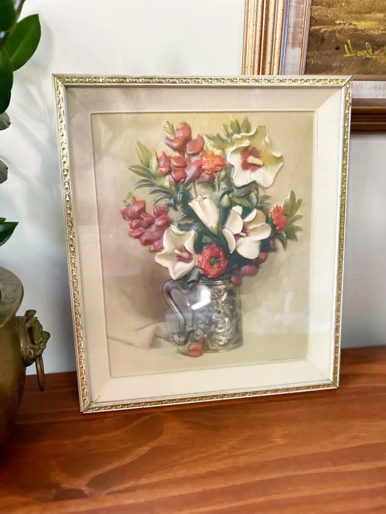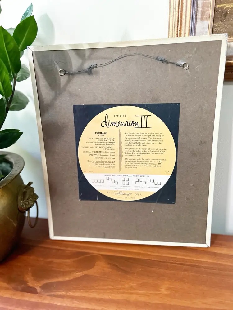 Vintage framed Metalcraft 3D floral wall art. Good condition. Measures 12 x 14 inches. Good condition. Minor imperfects can be seen in photos.