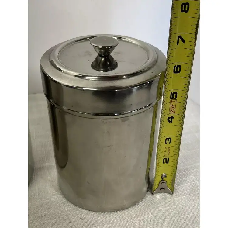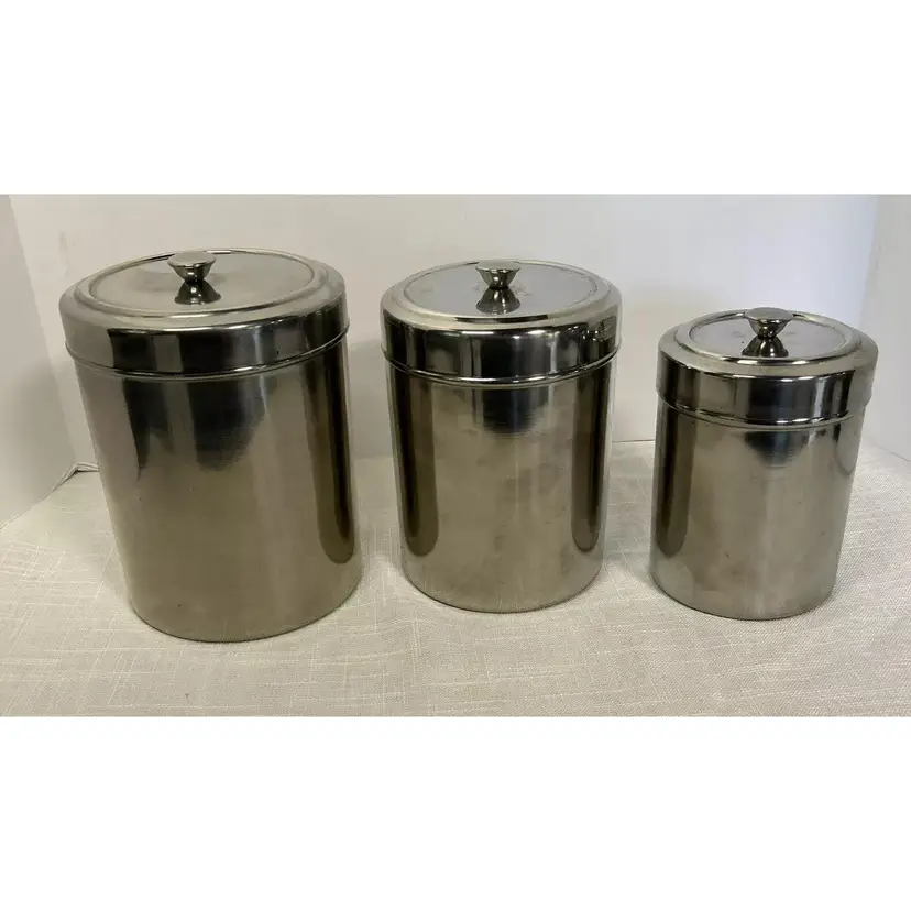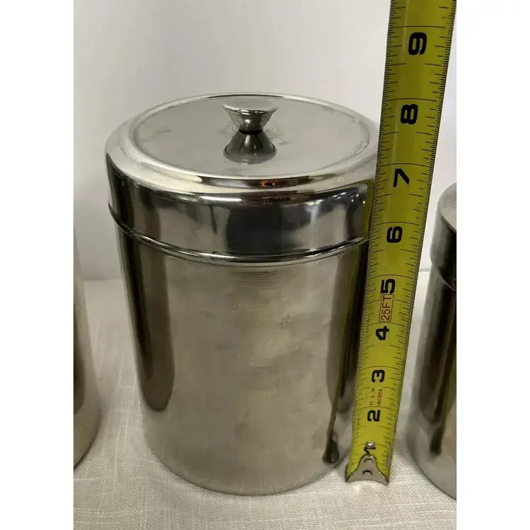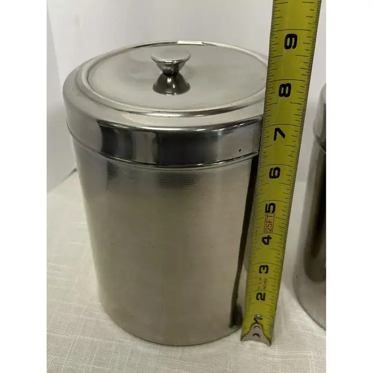 Add some vintage charm to your kitchen with this set of three aluminum canisters. The round canisters come in different sizes, with heights of 8”, 7.5”, and 7”, and widths of 6”, 5.25”, and 4.5”. The mid-century modern style canister set includes the lids and features a silver color, making it a stylish addition to any kitchen.