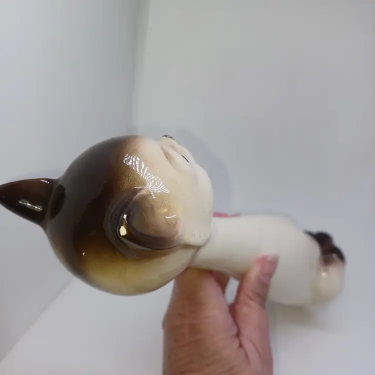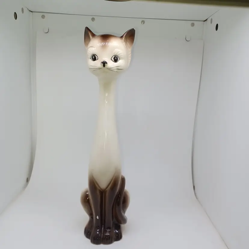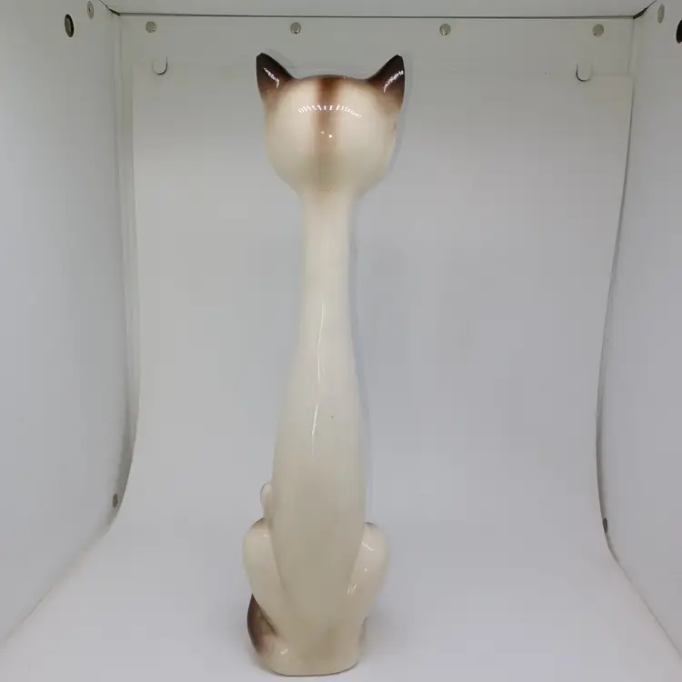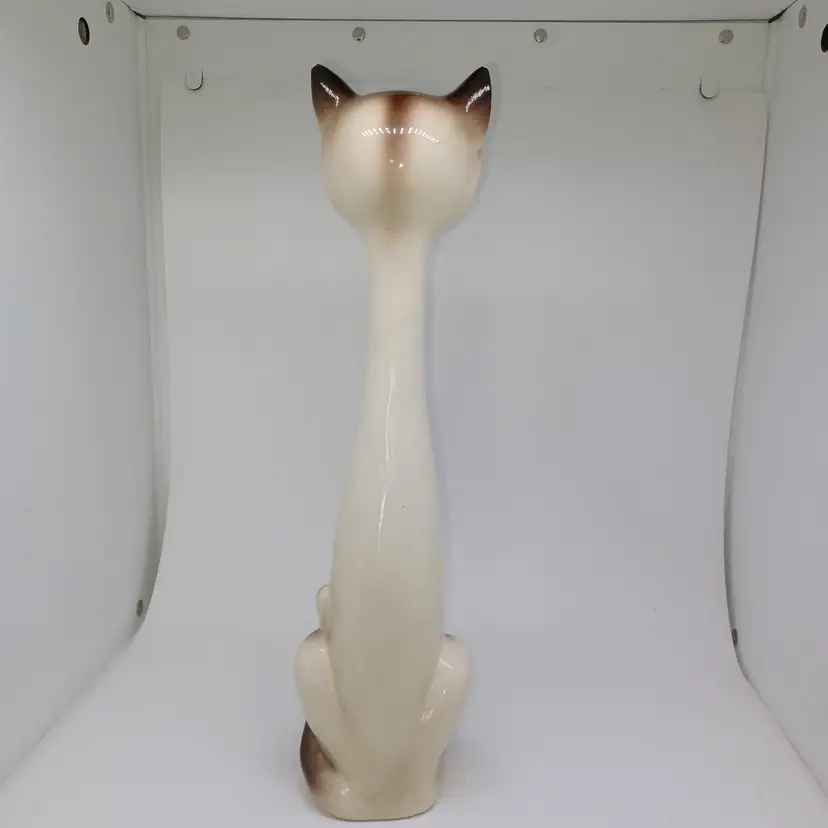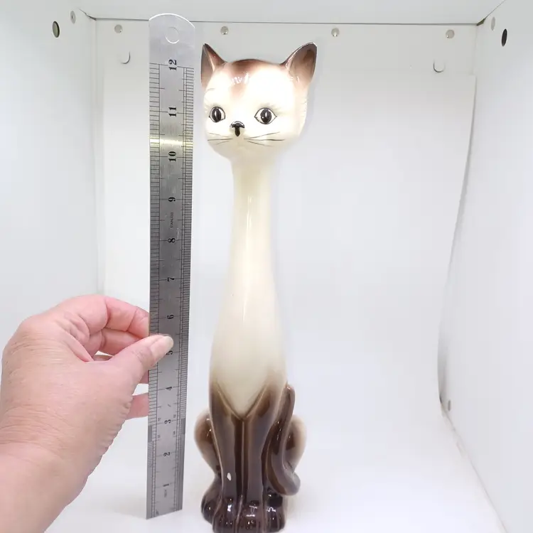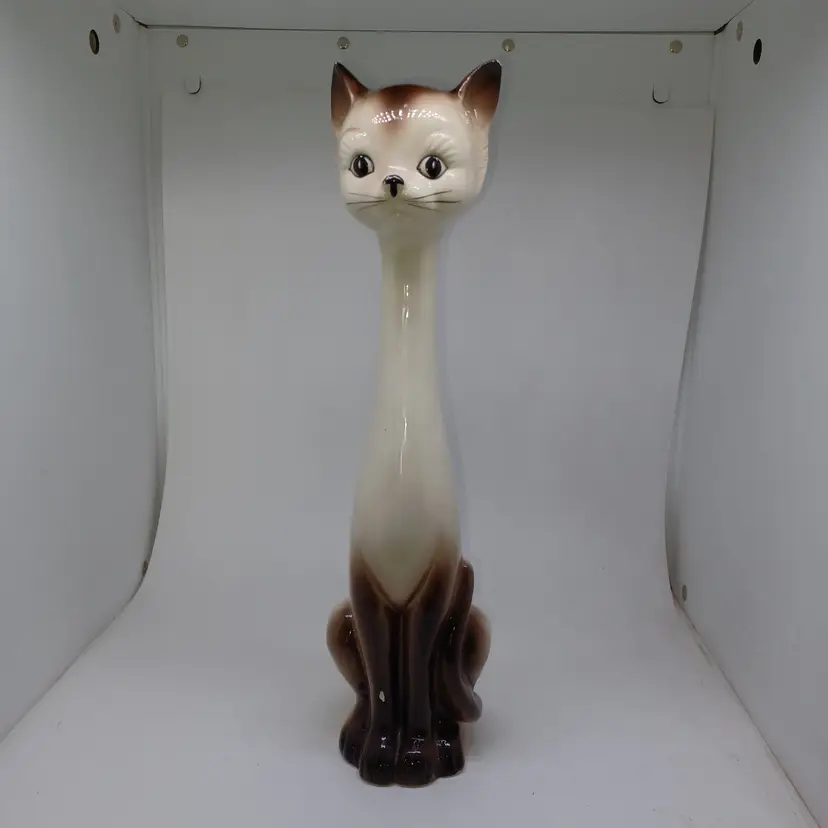Vintage Mid-century Modern Long-necked Siamese Kitty figurine 13 in Has original foil sticker on the bottom Centennial Novelty Los Angeles Japan Item was received from its original owner so in the same family for over 50 years does have a few minor chips top of the ears and one around the front nothing that really detracts from use or display anyone who slightly crafty can do an easy touch up on it also has a manufacturing flaw on the back of the neck and missing paint from the cold paint on the black of its nose absolutely adorable long neck Kitty please see all pictures as they are the best description all items from a smoke-free home with pets experienced fragile shipper
