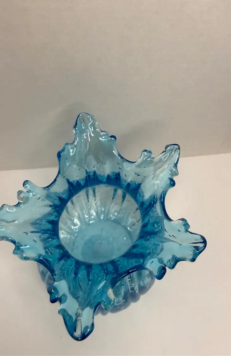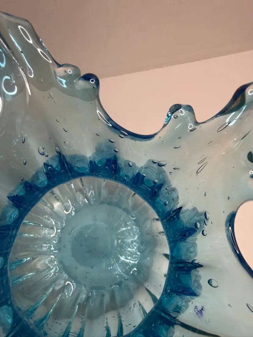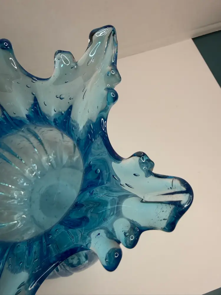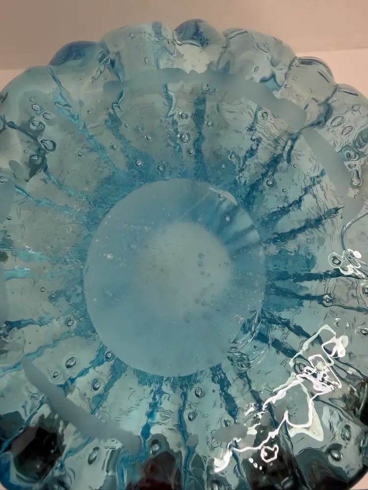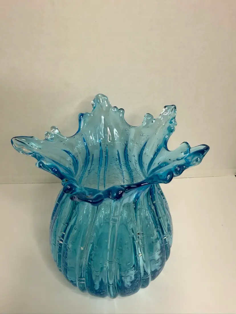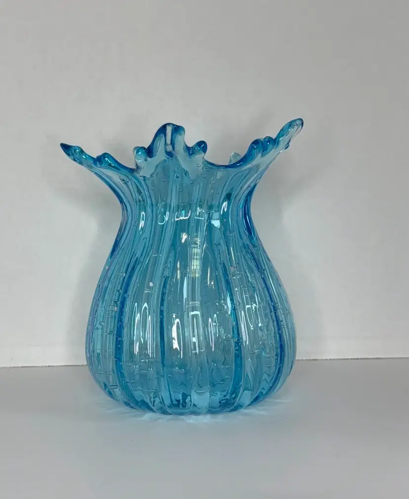 Heavy, thick-walled hand-blown glass. construction decorative "bullicante" effect with controlled air bubbles trapped within the glass. The body has a subtle ribbed or optic pattern, culminating in a dynamically ruffled or "splash" top rim.