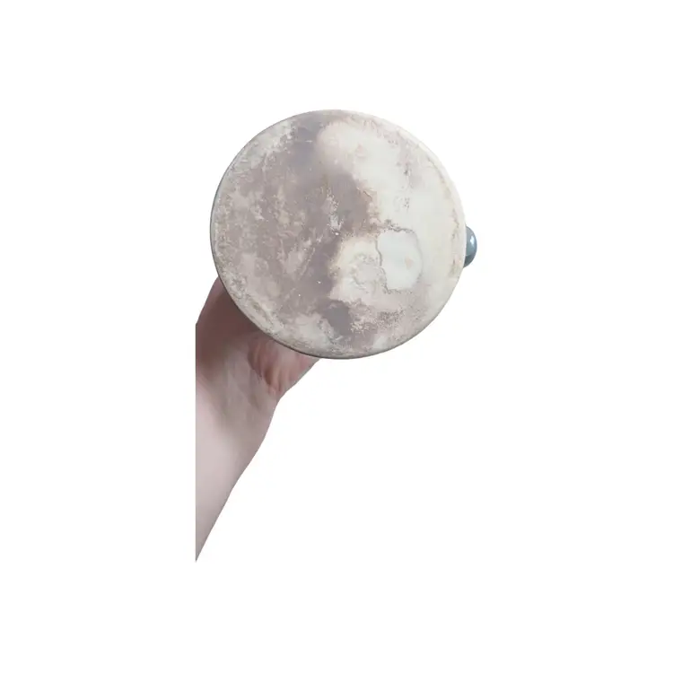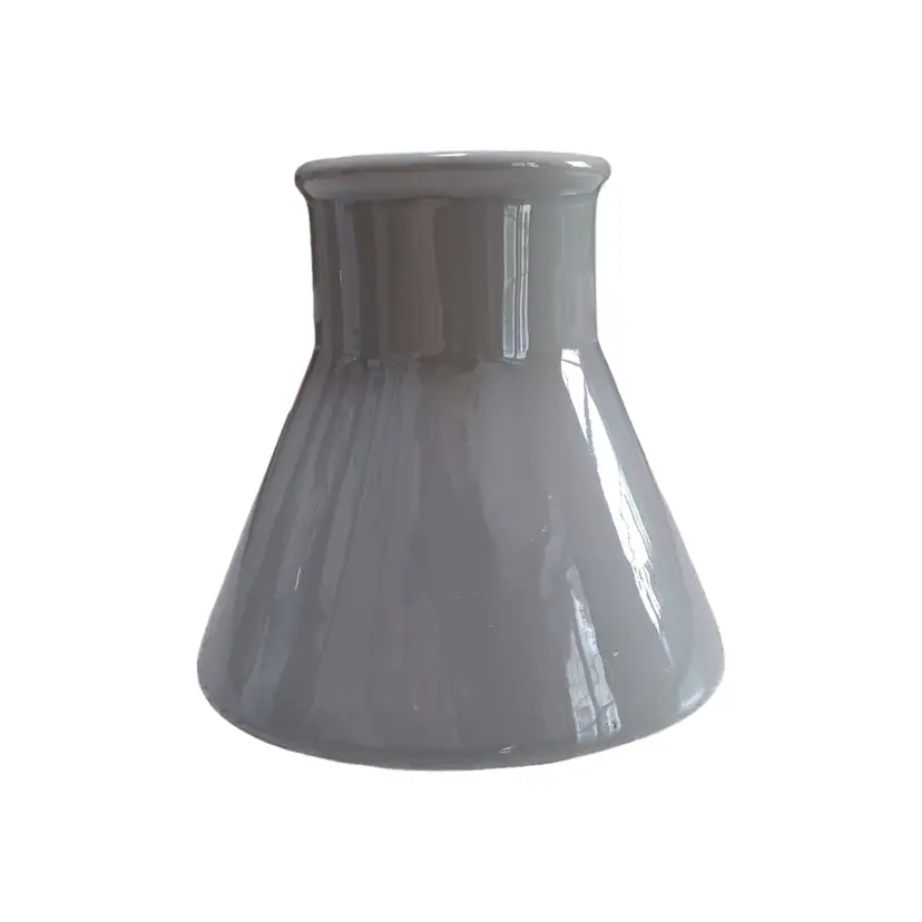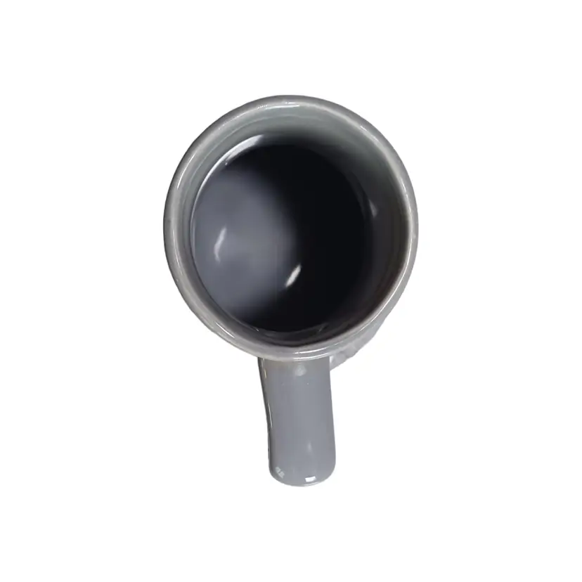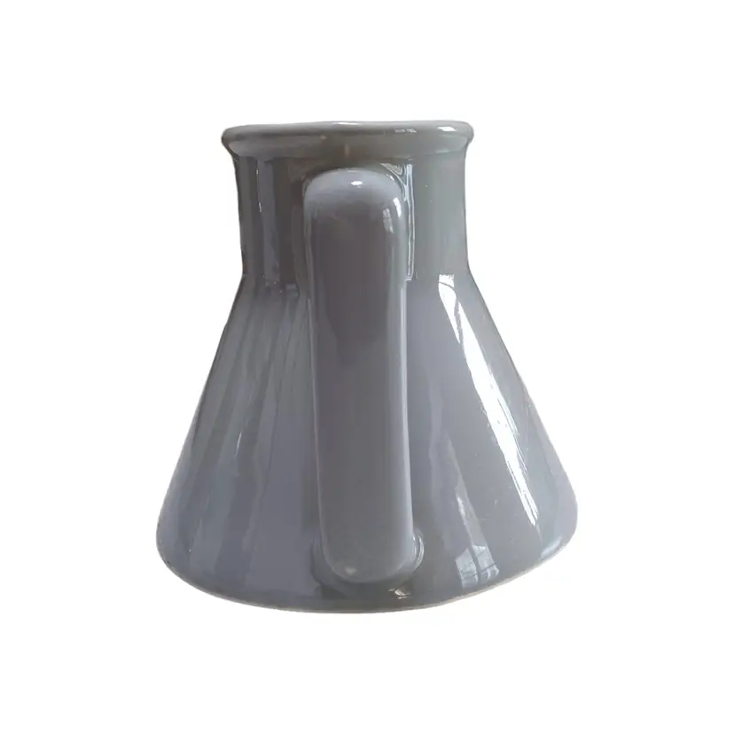 Listed is a vintage MCM design no-spill gray coffee mug. Its shape is reminiscent of a space capsule. It measures approximately 5 inches tall, 4.75 inches across at its widest point, and has an opening diameter of 2.5 inches. It is in great shape considering its age and has just a few tiny glaze pops and a bit of fine scratching that is not visible unless held up to the light.
