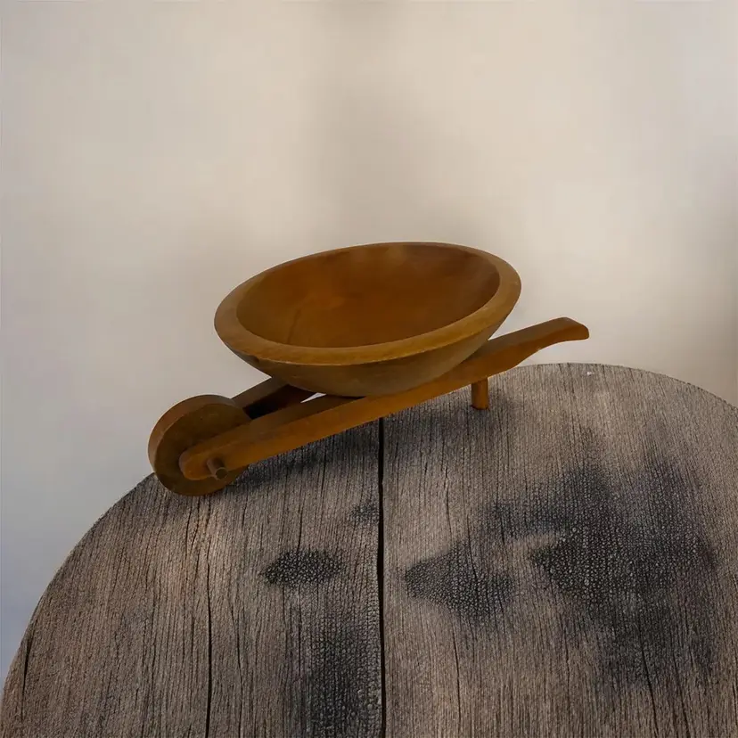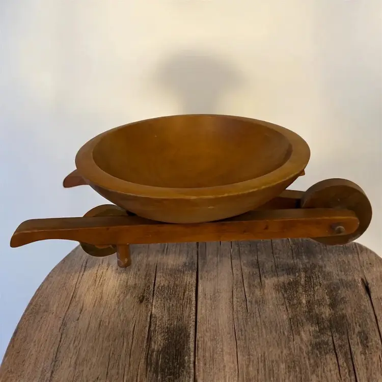 Experience a touch of nostalgia with our Vintage Mid Century Modern Woodcroftery Hand Carved Wood Wheelbarrow Nut and Fruit Bowl. Handcrafted with intricate details, this beautiful bowl not only adds a rustic touch to your home decor, but also serves as a practical and stylish way to display your favorite nuts and fruits. Perfect for entertaining guests or as a unique gift for any occasion. Measures approximately 10 inches long
