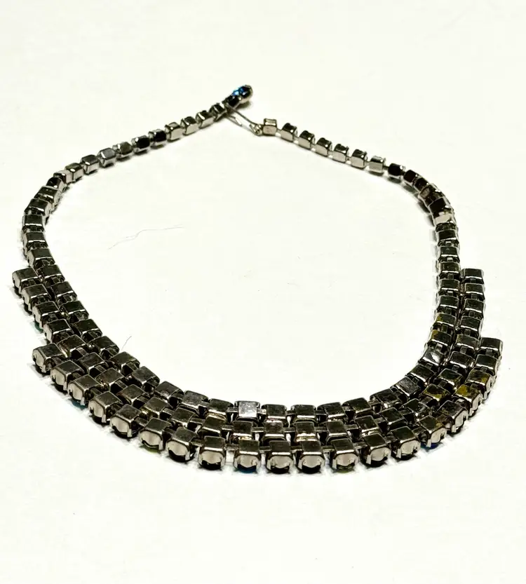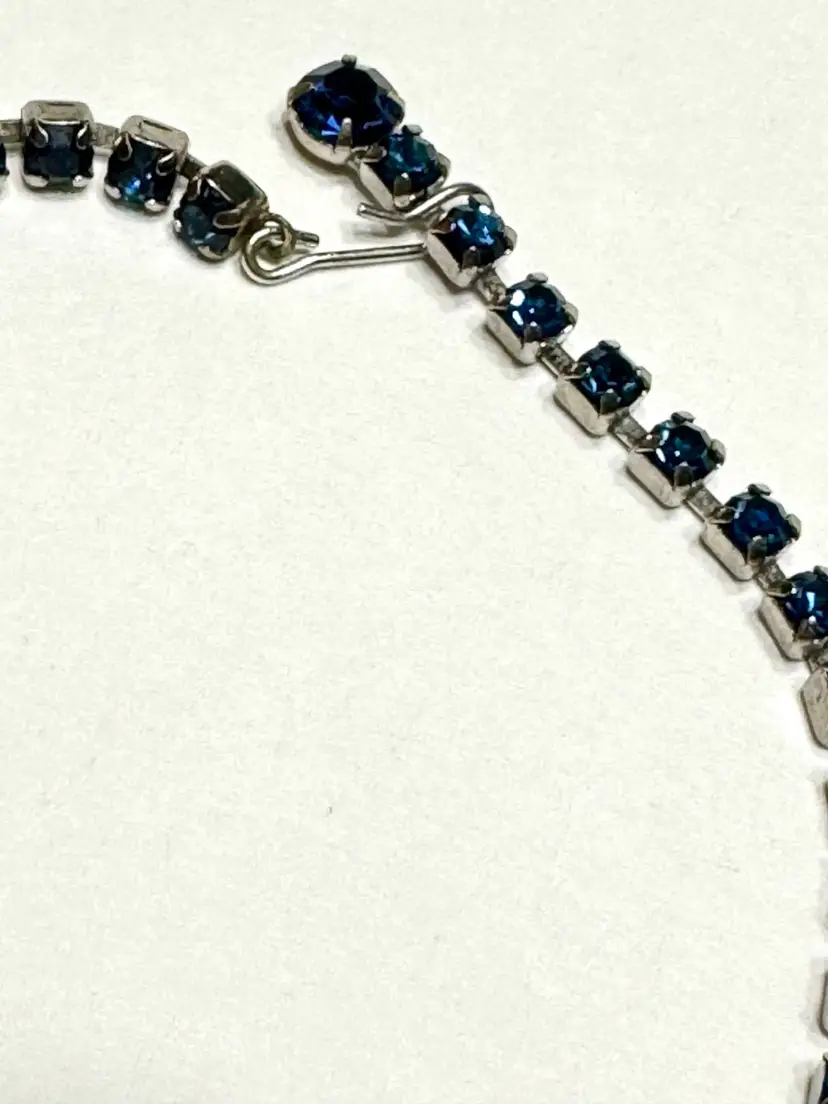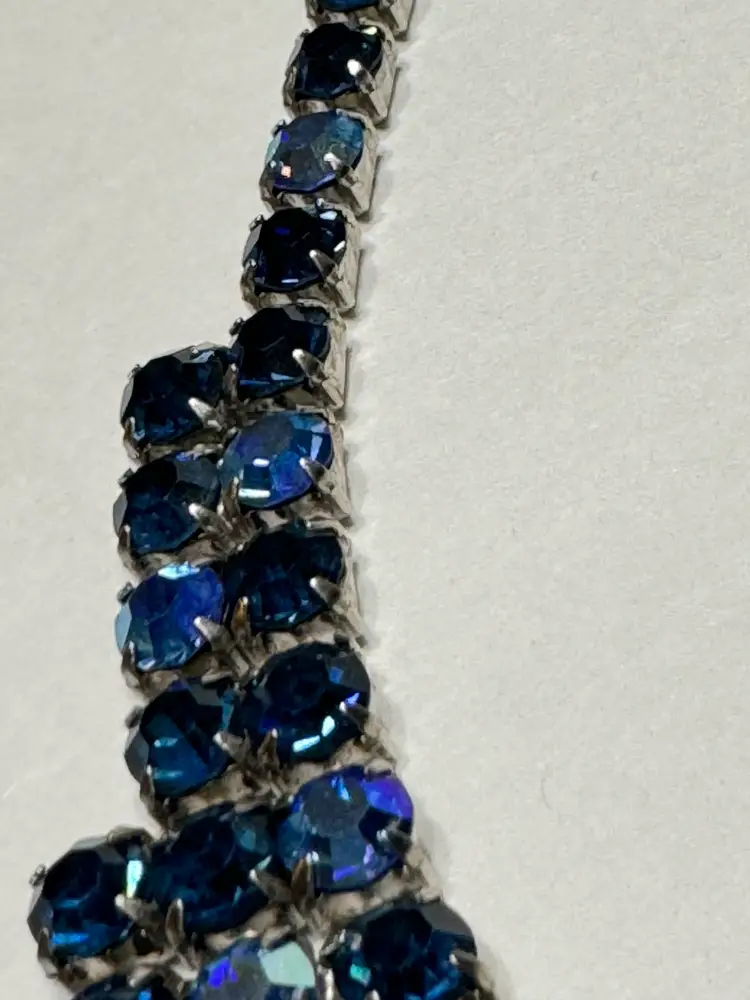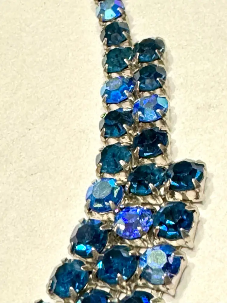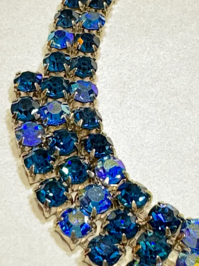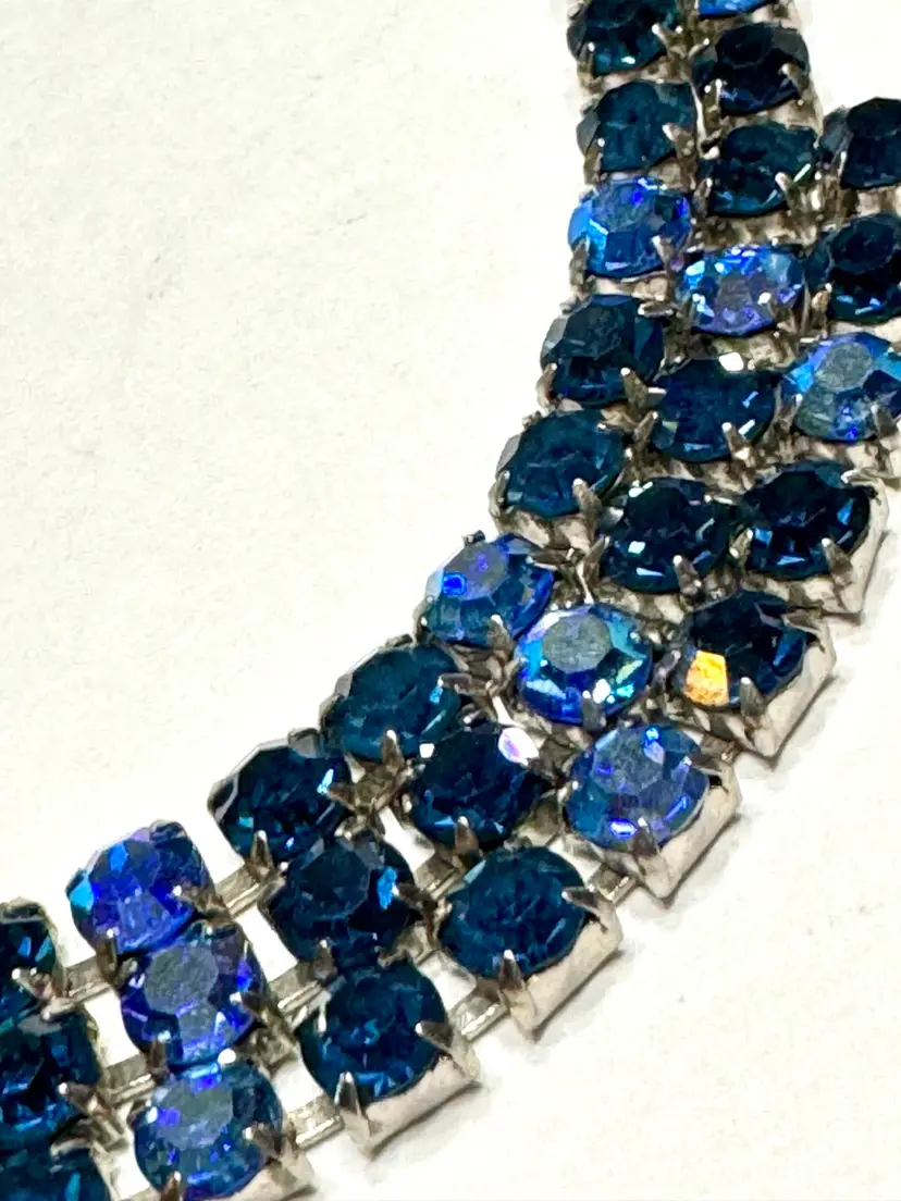 Embrace vintage glamour with this stunning blue rhinestone bib necklace. The mid-century piece boasts multiple shades of blue and features a triple layered design that exudes sophistication. The sparkling crystals catch the light beautifully and add a touch of beauty to any outfit.