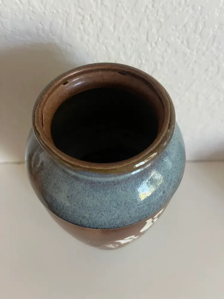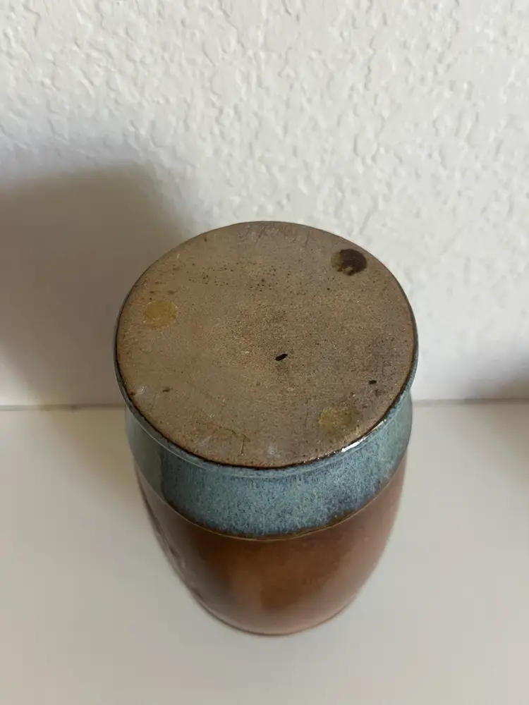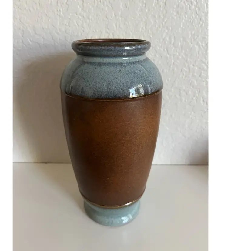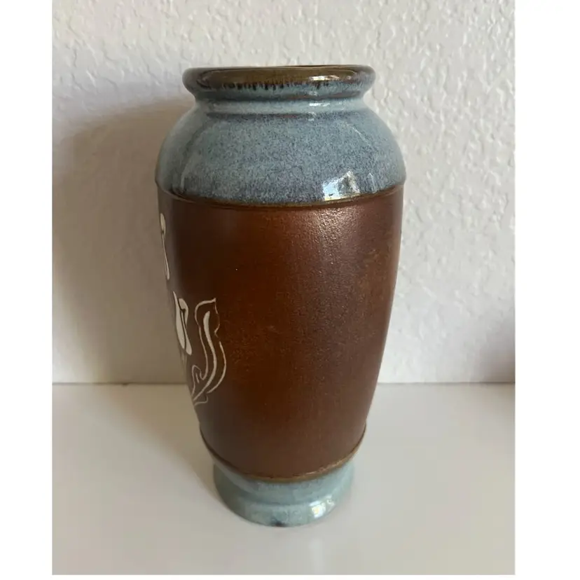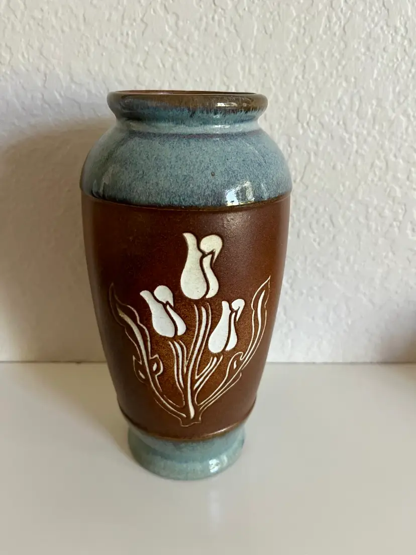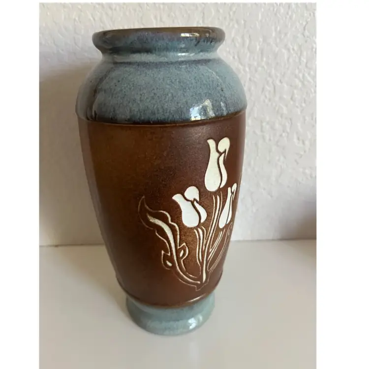 This is a Vintage Mid Century Pottery Craft Compton, California Flower Vase, specifically a handcrafted stoneware vase with etched tulips. Manufacturer: Pottery Craft, Compton, CA, USA. Material: Handcrafted stoneware. Design: Features etched tulip designs on a rich brown band, with teal/light blue accents on the top and bottom. Era: Mid-century, likely from the 1970s. No chips or cracks Approximately 8” height