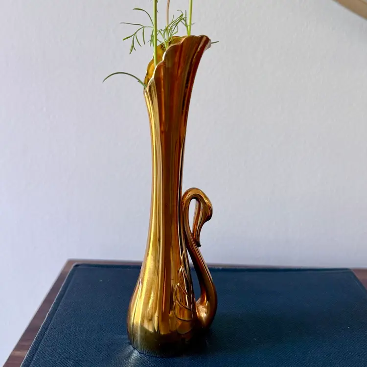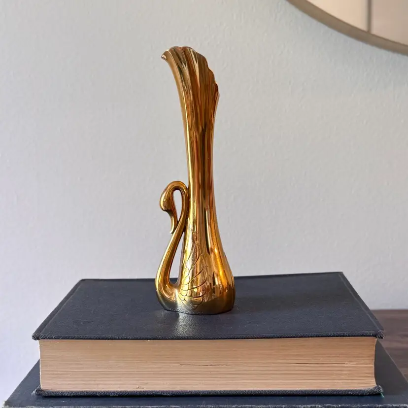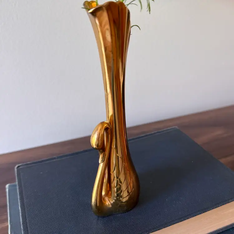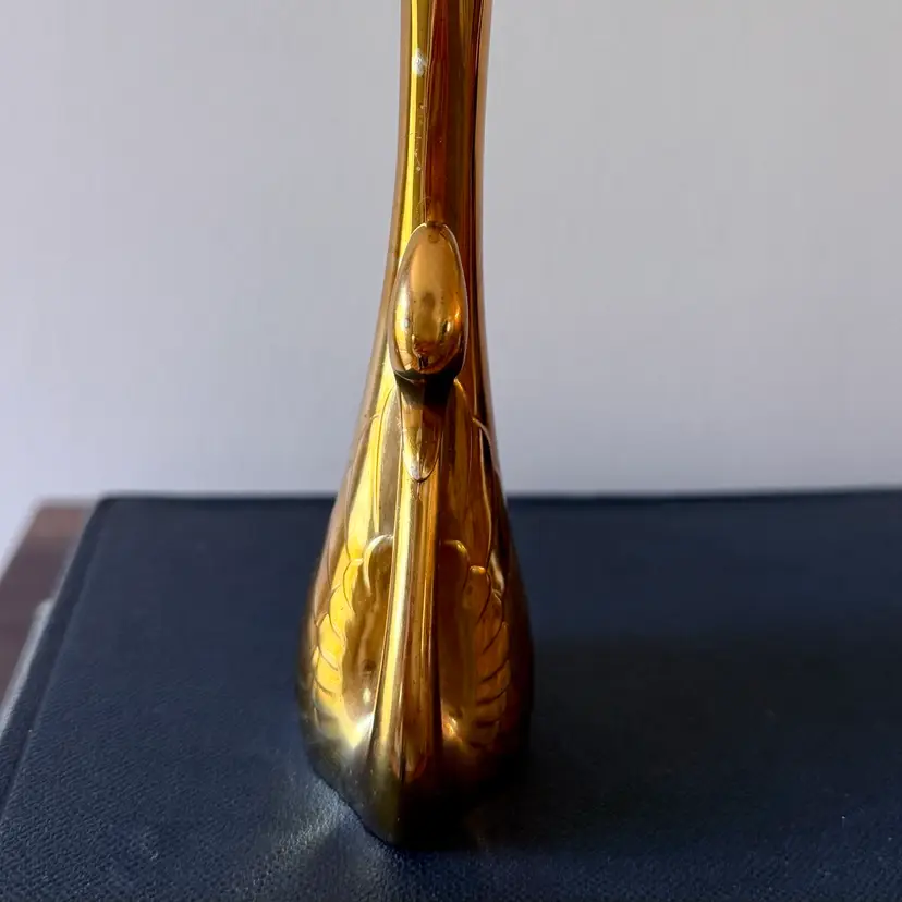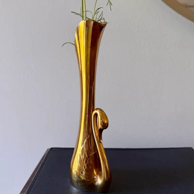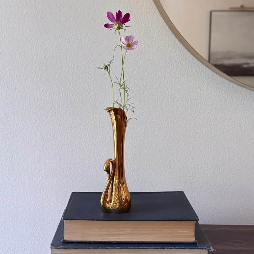 This elegant mid-century swan bud vase appears to be silver with a tarnish-free coating, giving it the look of brass. It's a chic accent piece perfect for any decor.