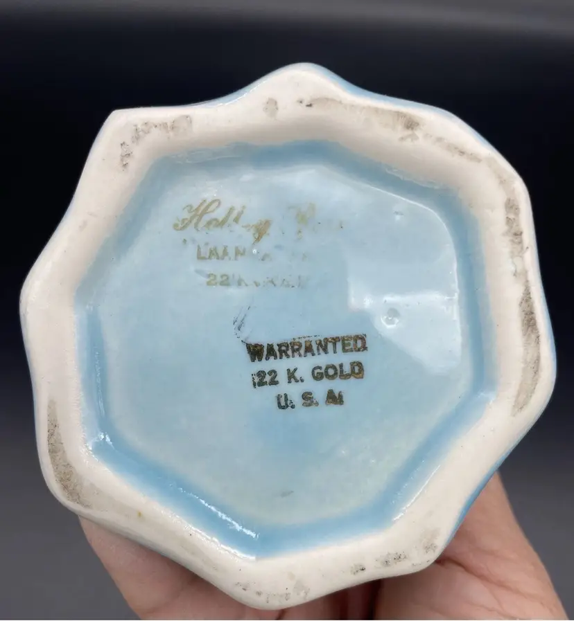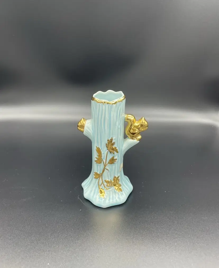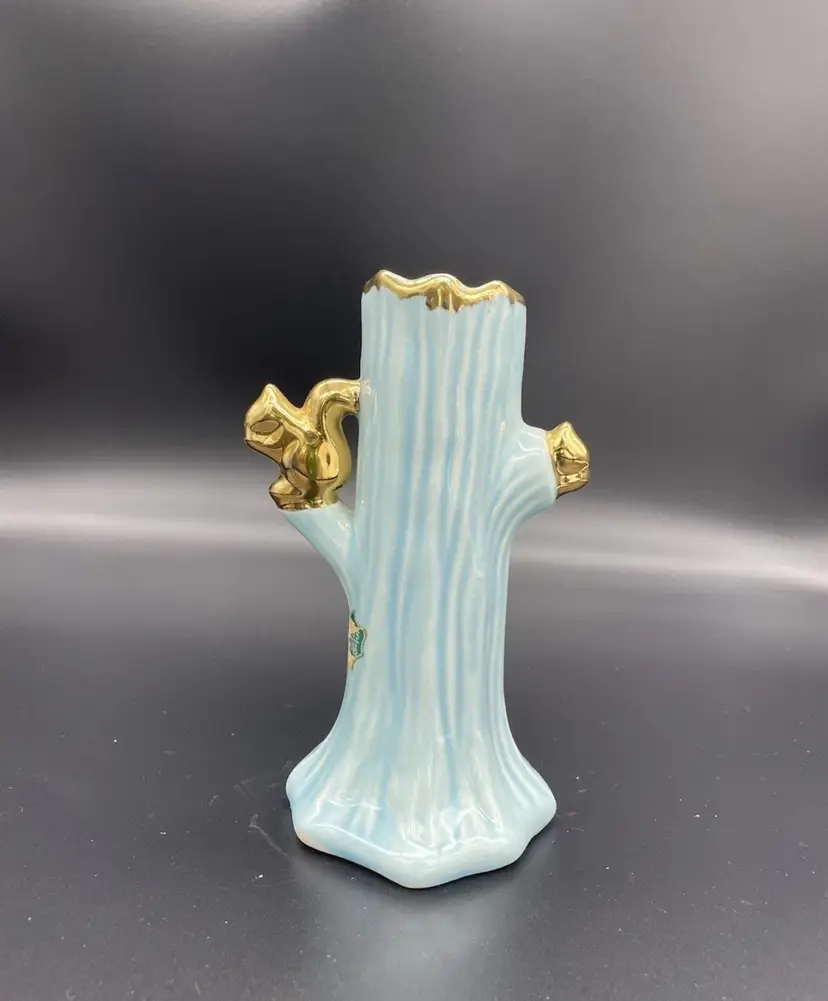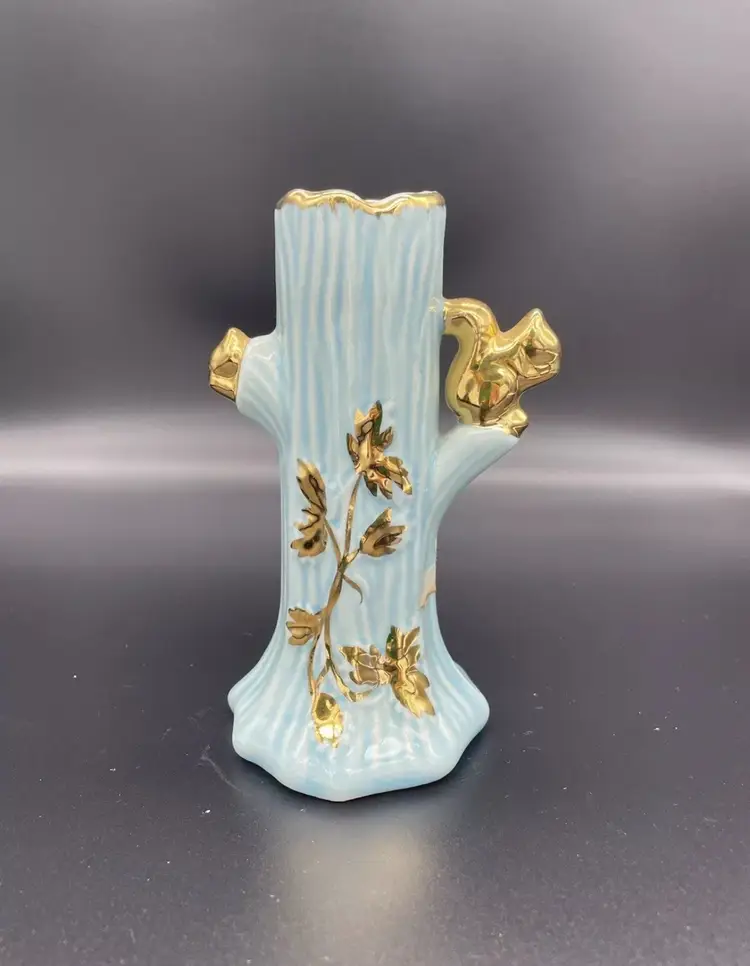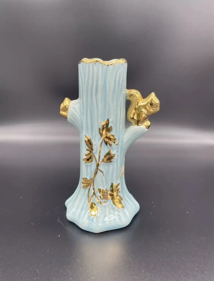 Vintage Mid Century Vase Turquoise Blue Warranted 22K Gold Squirrel Leaf Design