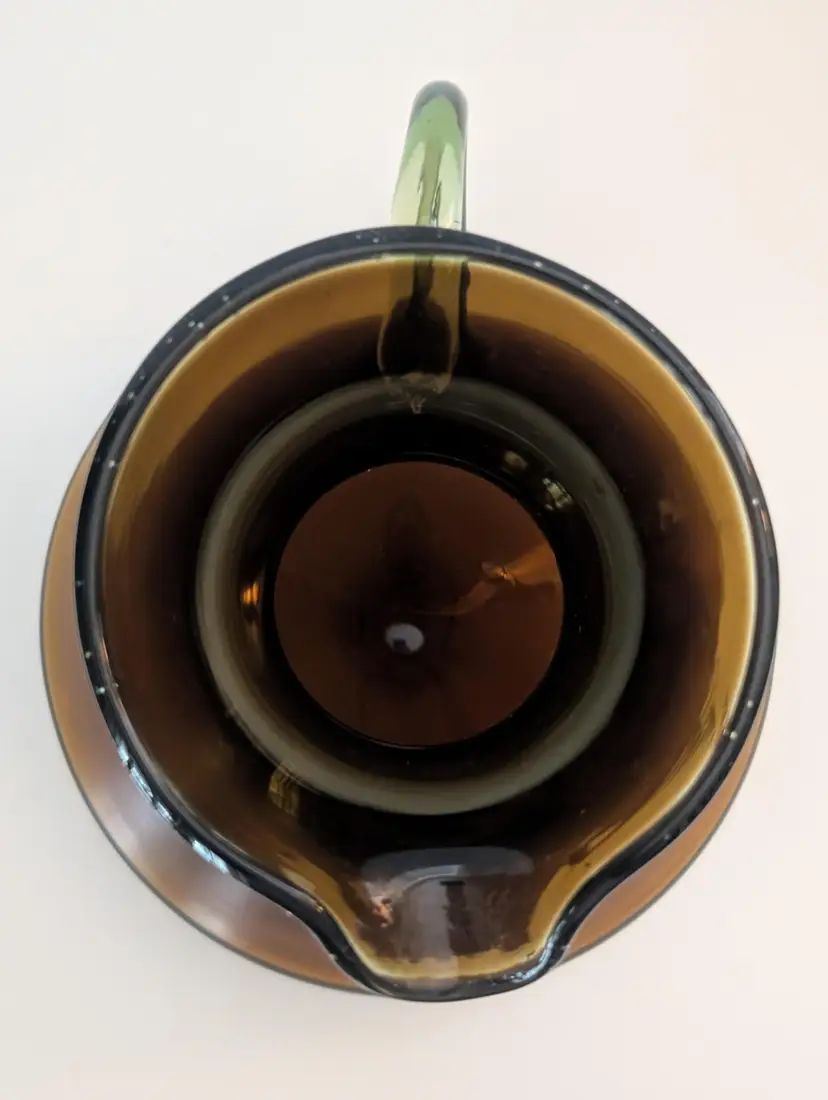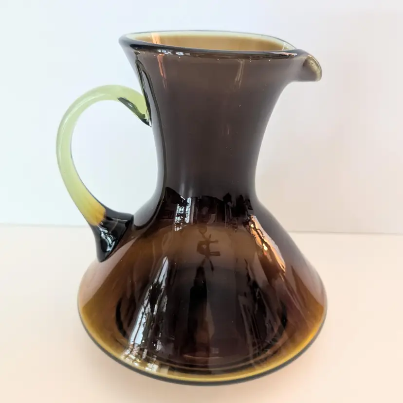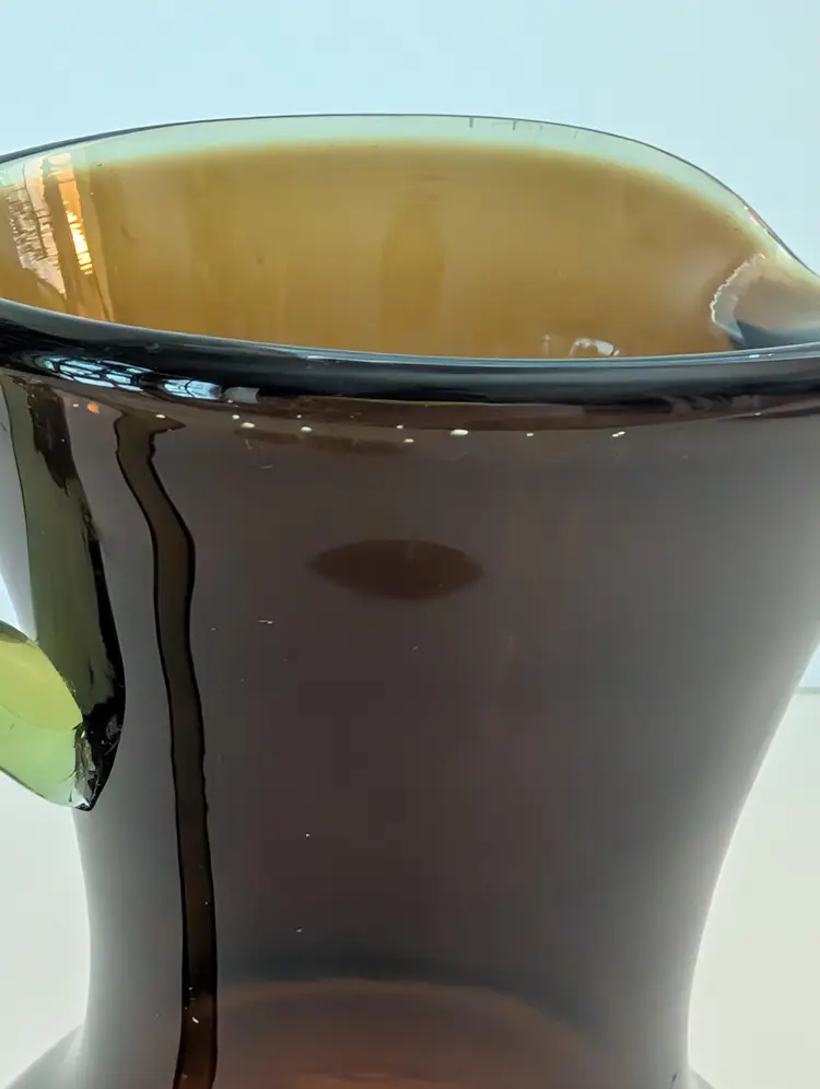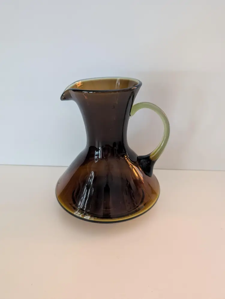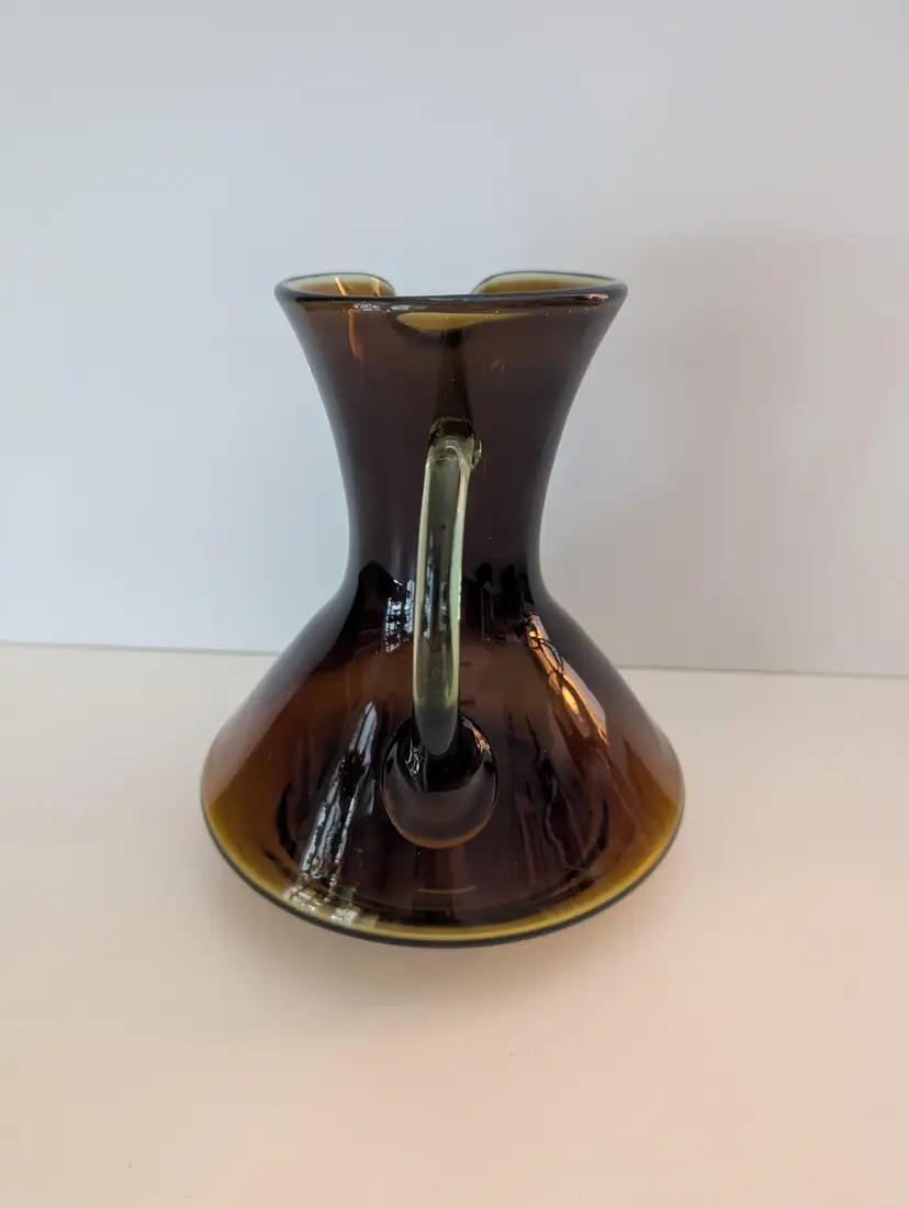 • Hand-blown glass • Amber color • Handle for easy pouring • Unique design • Durable material