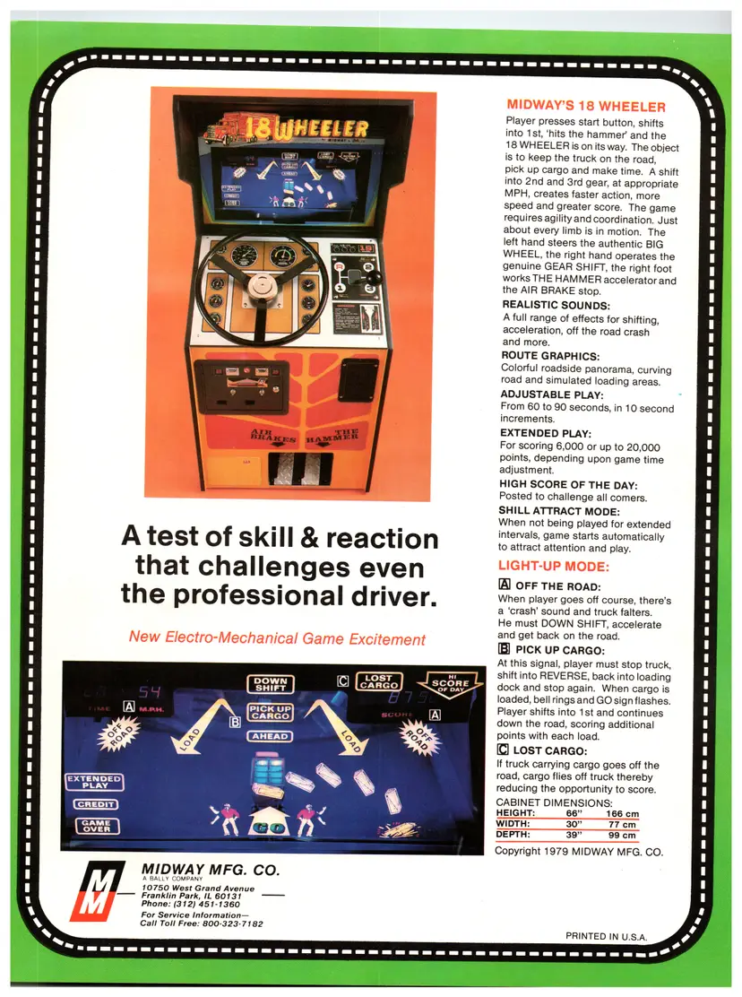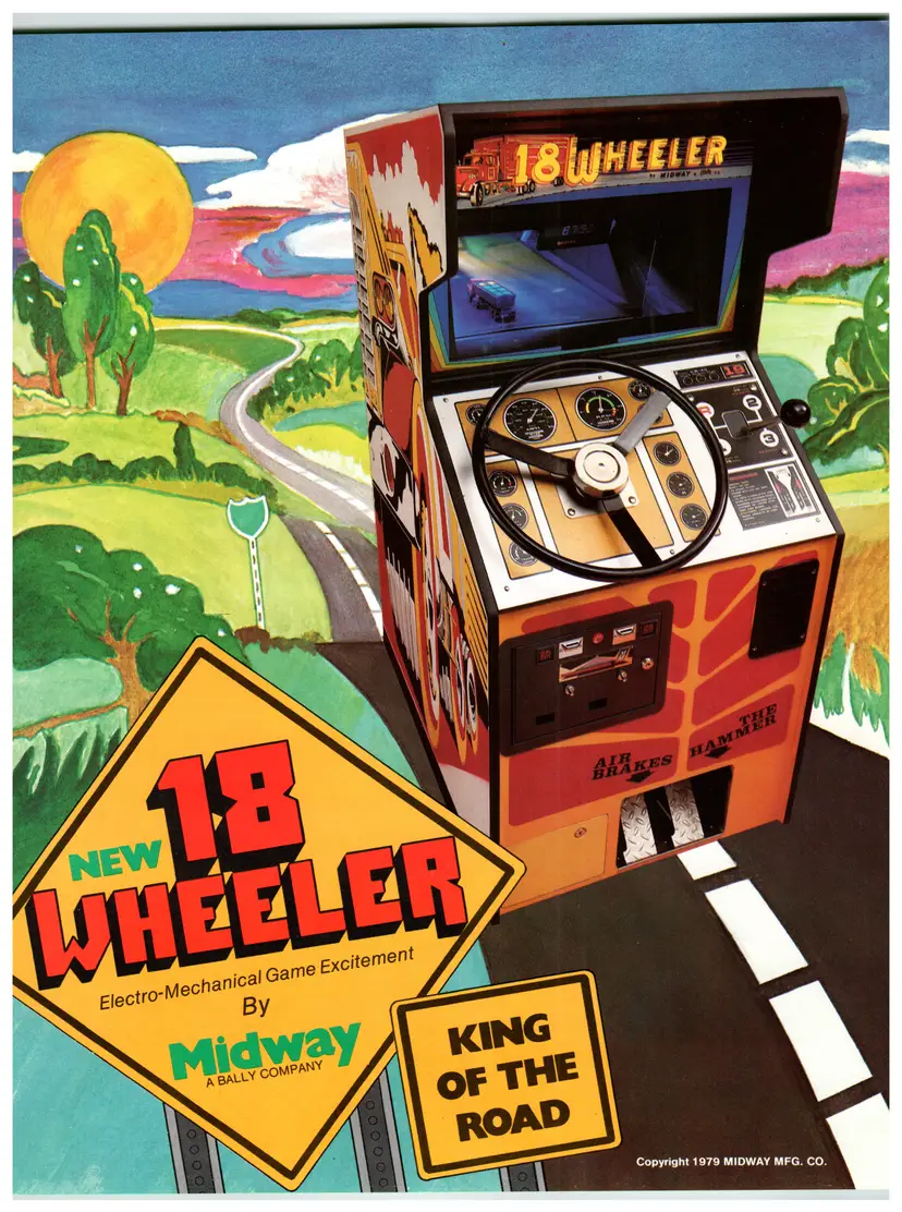 This listing features a vintage advertisement flyer for the iconic Midway 18 Wheeler arcade game, originally released in 1979. Produced by Midway, a Bally Company, this rare piece of arcade gaming memorabilia showcases the "New Electro-Mechanical Game Excitement" that captivated players as they aimed to become the "KING OF THE ROAD." The advertisement vividly depicts the game's cabinet, complete with its steering wheel, dashboard, and unique "AIR BRAKES" and "THE HAMMER" controls, set against a colorful landscape scene.