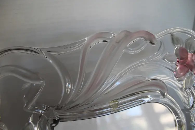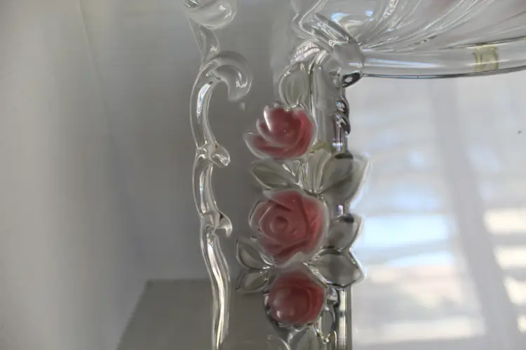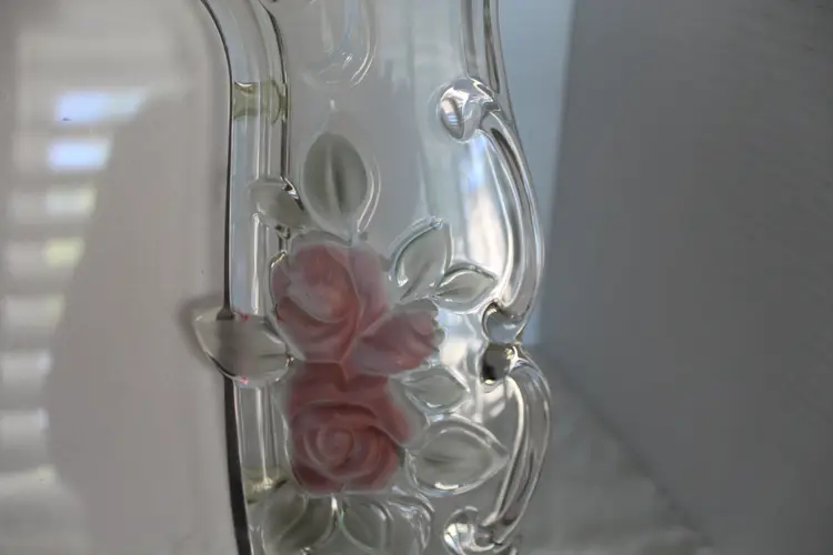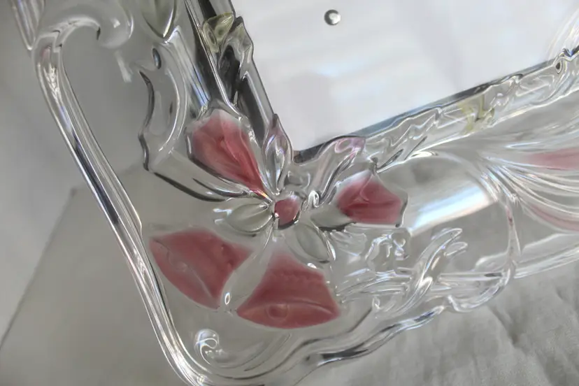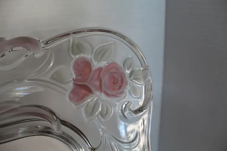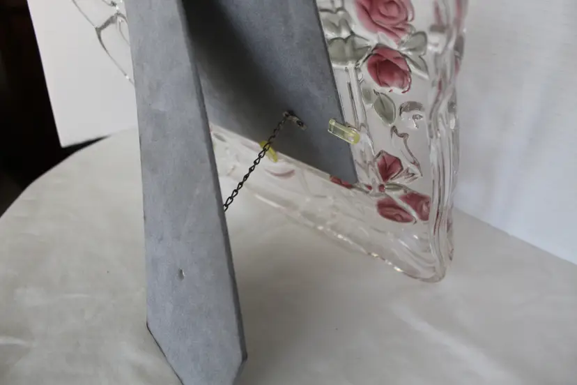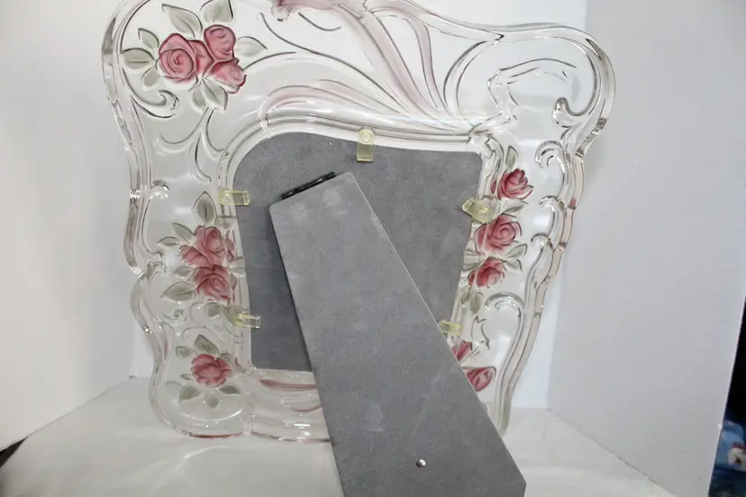 The Vintage Mikasa Bella Rosa Pink Rose Pattern Crystal Picture Frame is a rare find, manufactured in 1999 as an original piece. This ornate frame features a romantic floral design with a pink rose pattern, making it a perfect choice for a wedding or special occasion. The frame is a beautiful 3D picture frame with a rear-loading photo insertion type, designed for a 6 inches wide x 8 inches long inch photo with a viewing angle of 180 degrees. The frame is crafted from glass with pink frosted roses color scheme. Suitable for portrait orientation, this frame exudes elegance and charm, adding a touch of romance to any decor.