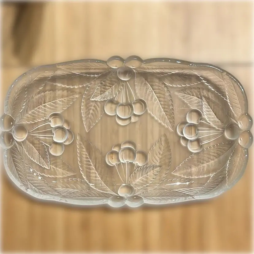 Vintage Mikasa "Bountiful Cherries" frosted glass serving dish, produced in Japan in the 1970s. Key features include: Design: Oval-shaped with a raised cherry and leaf pattern on frosted glass. The top surface is smooth. Material: Heavy, clear, and frosted glass. Dimensions: Approximately 30 cm long x 18 cm wide (12 x 7.5 inches). Use: Suitable for serving appetizers, desserts, or snacks. Discontinued pattern.