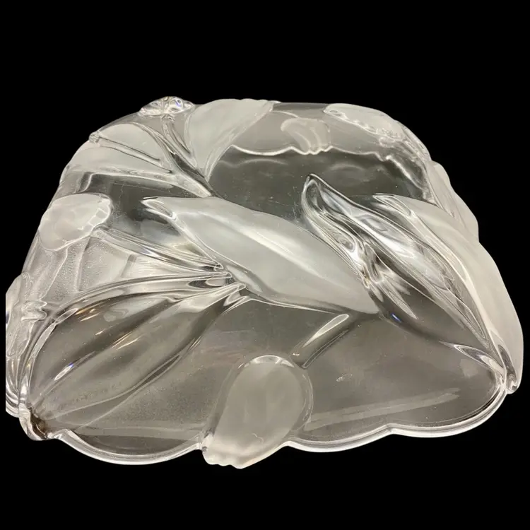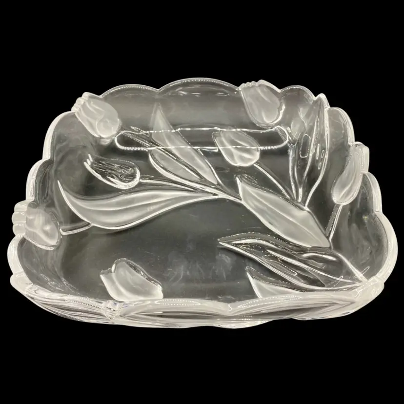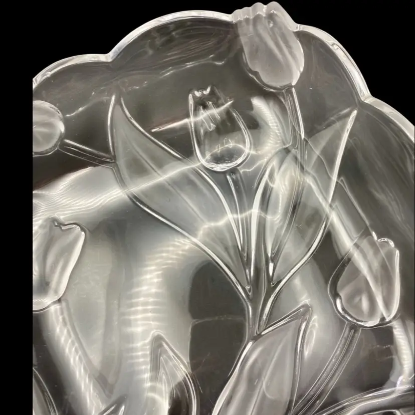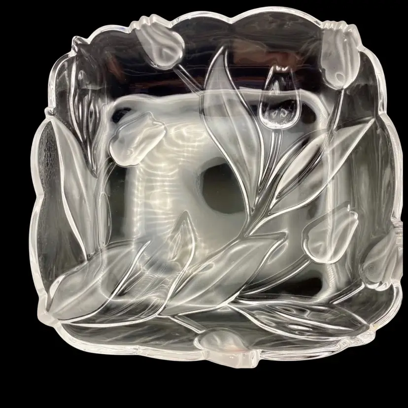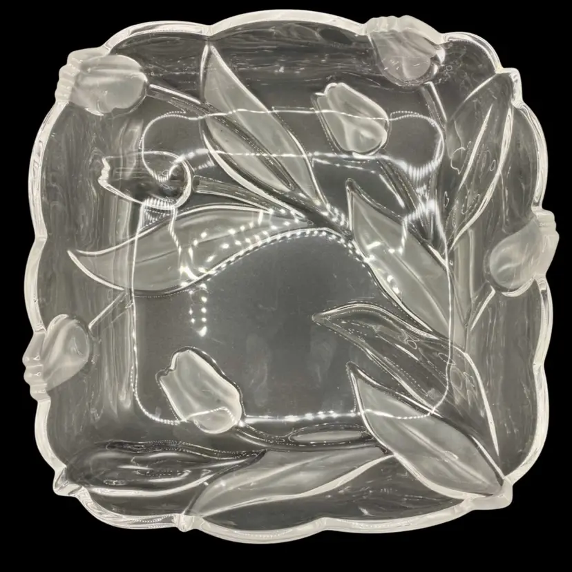 This beautiful vintage Tulips Satin serving tray/bowl from Mikasa features a frosted tulip and leaves pattern that adds a touch of elegance to any room. This bowl was made in Germany and its dimensions are 10 inches x 10 inches, with a depth of 2 inches. The clear and frosted satin glass material is of high quality and gives the bowl a stunning finish. The bowl is also embossed, adding to its charm and uniqueness.