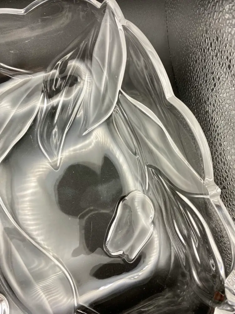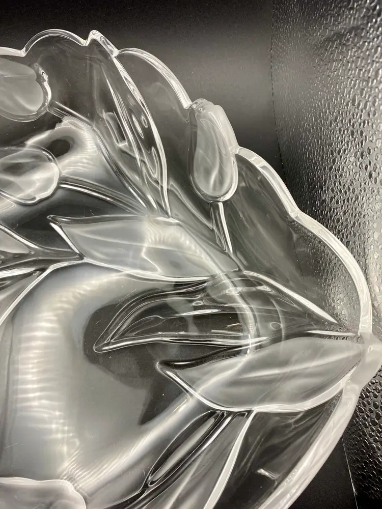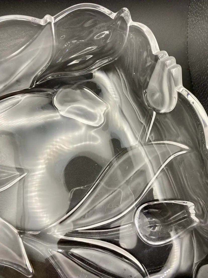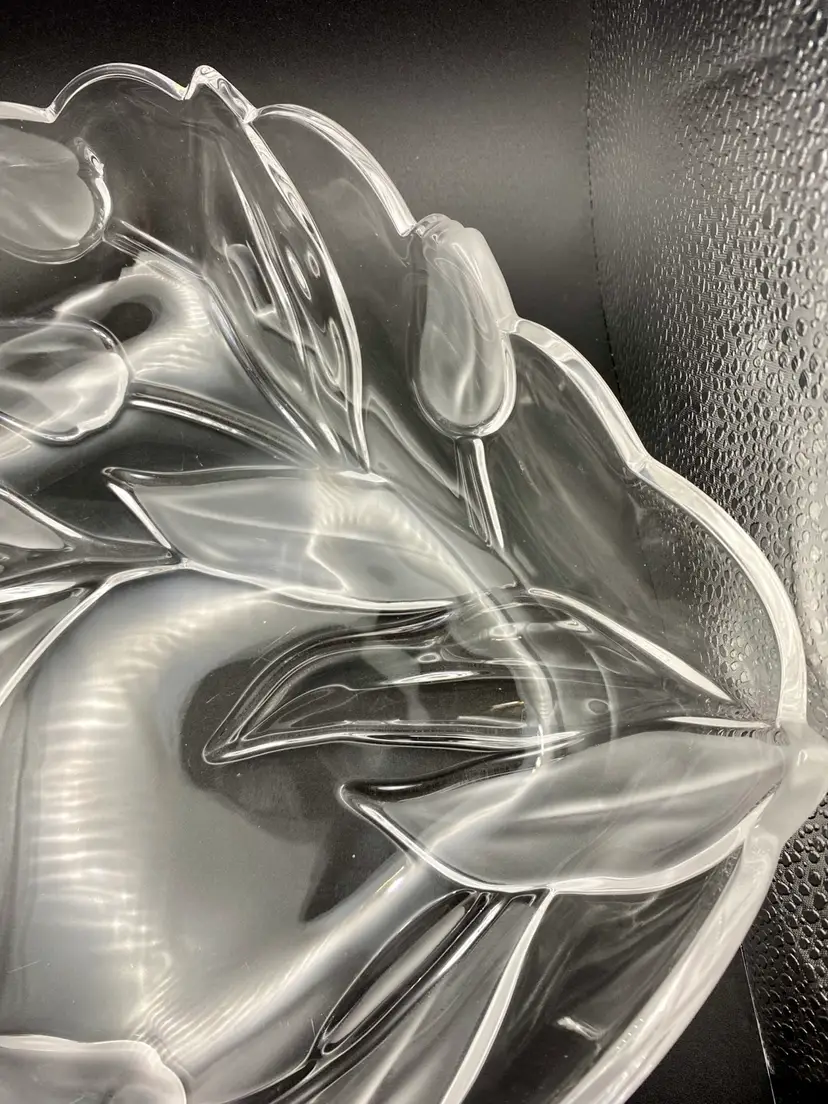 This beautiful vintage Tulips Satin serving tray/bowl from Mikasa features a frosted tulip and leaves pattern that adds a touch of elegance to any room. This bowl was made in Germany and its dimensions are 10 inches x 10 inches, with a depth of 2 inches. The clear and frosted satin glass material is of high quality and gives the bowl a stunning finish. The bowl is also embossed, adding to its charm and uniqueness.