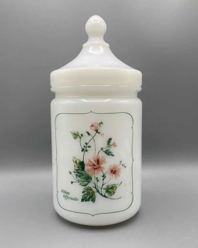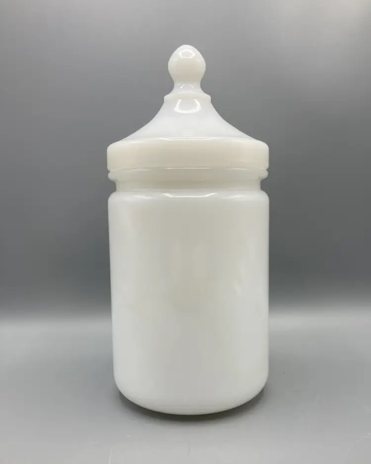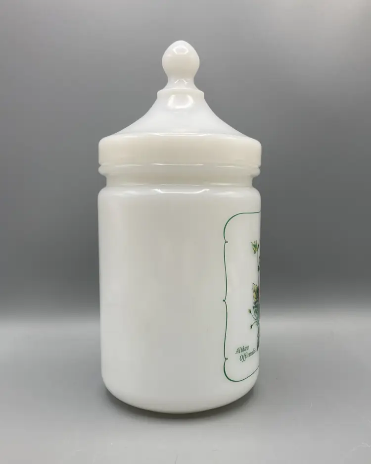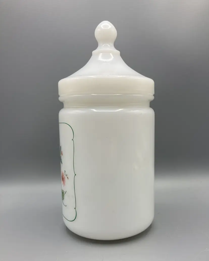 This jar is in good condition. There is some sticker residue on the bottom of the jar. The lid sits on the base and is not meant to seal. It measures approximately 9" tall with lid, 6 1/4" tall without lid, and 4 1/4" across.