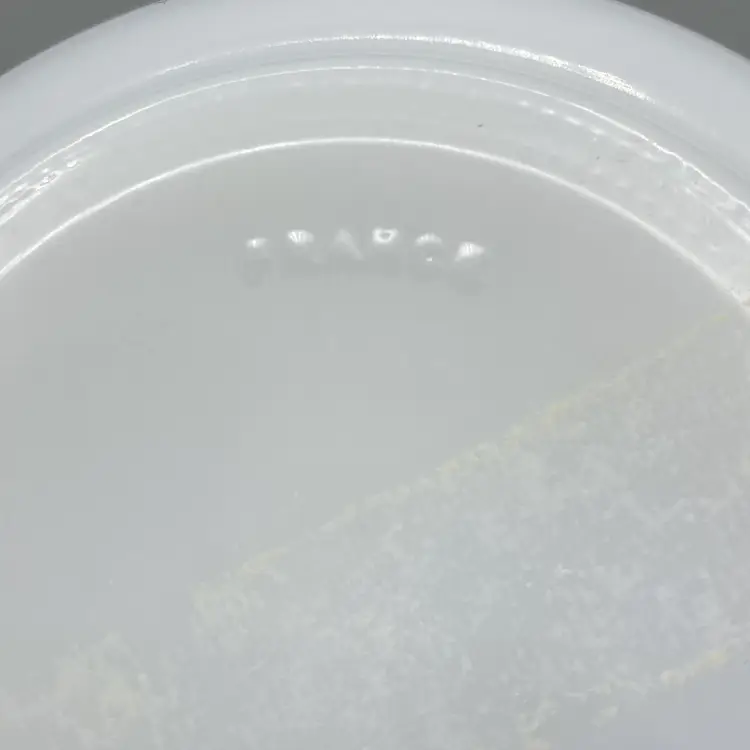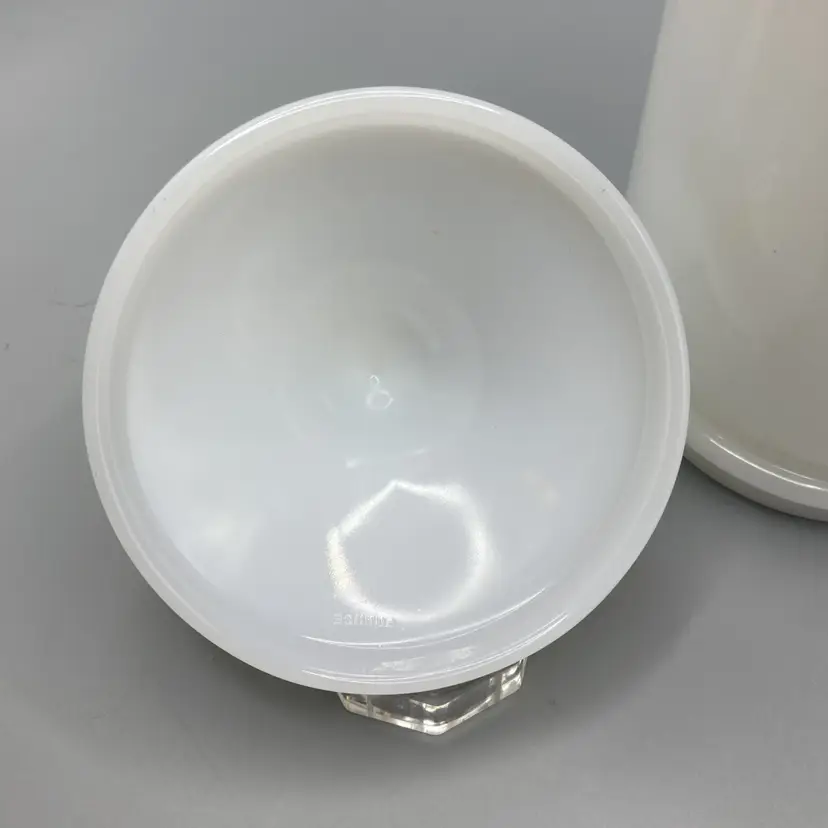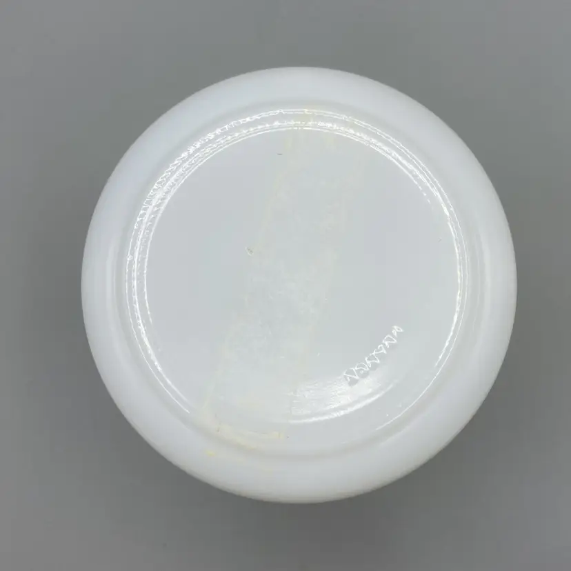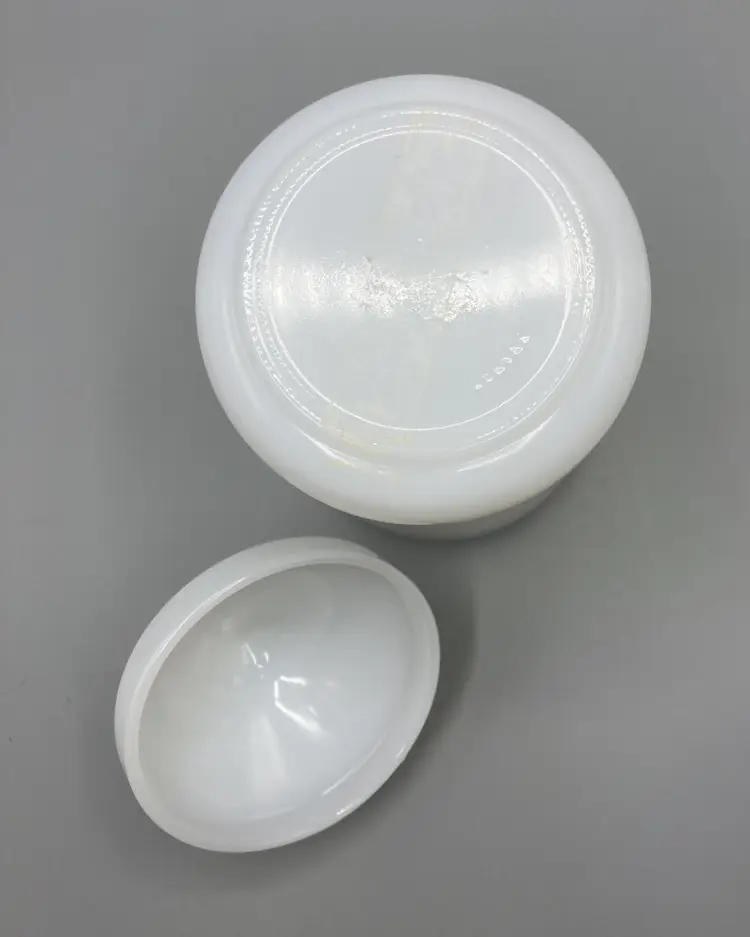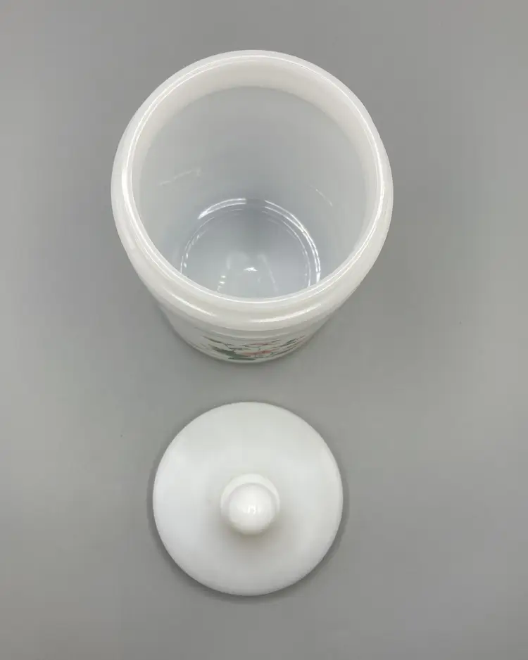 This jar is in good condition. There is some sticker residue on the bottom of the jar. The lid sits on the base and is not meant to seal. It measures approximately 9" tall with lid, 6 1/4" tall without lid, and 4 1/4" across.